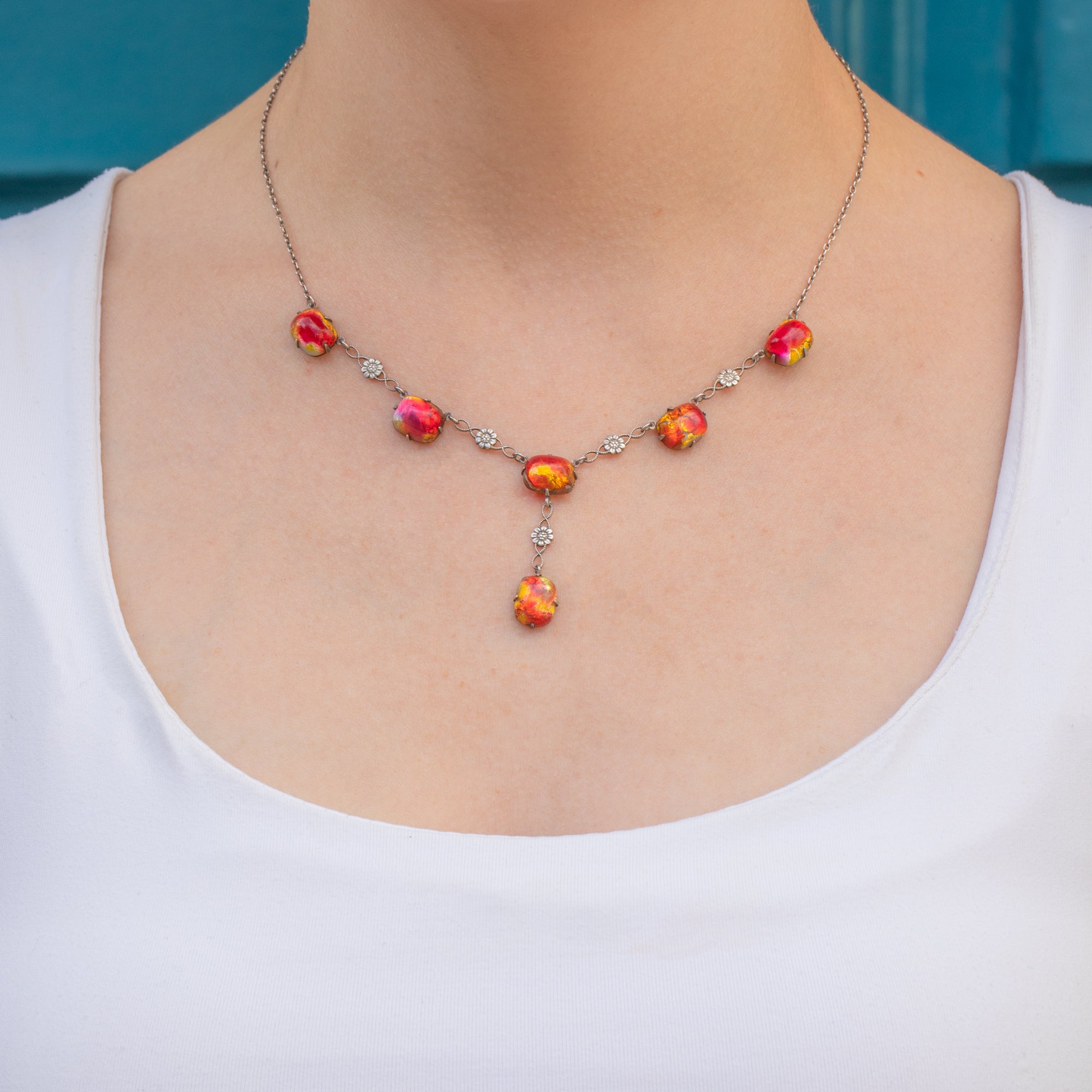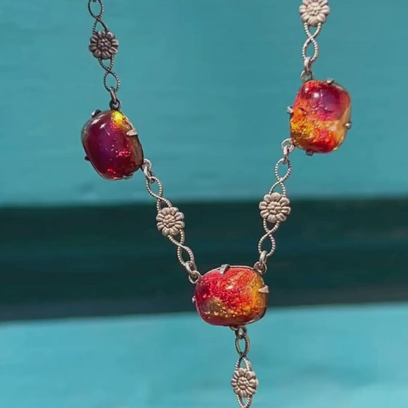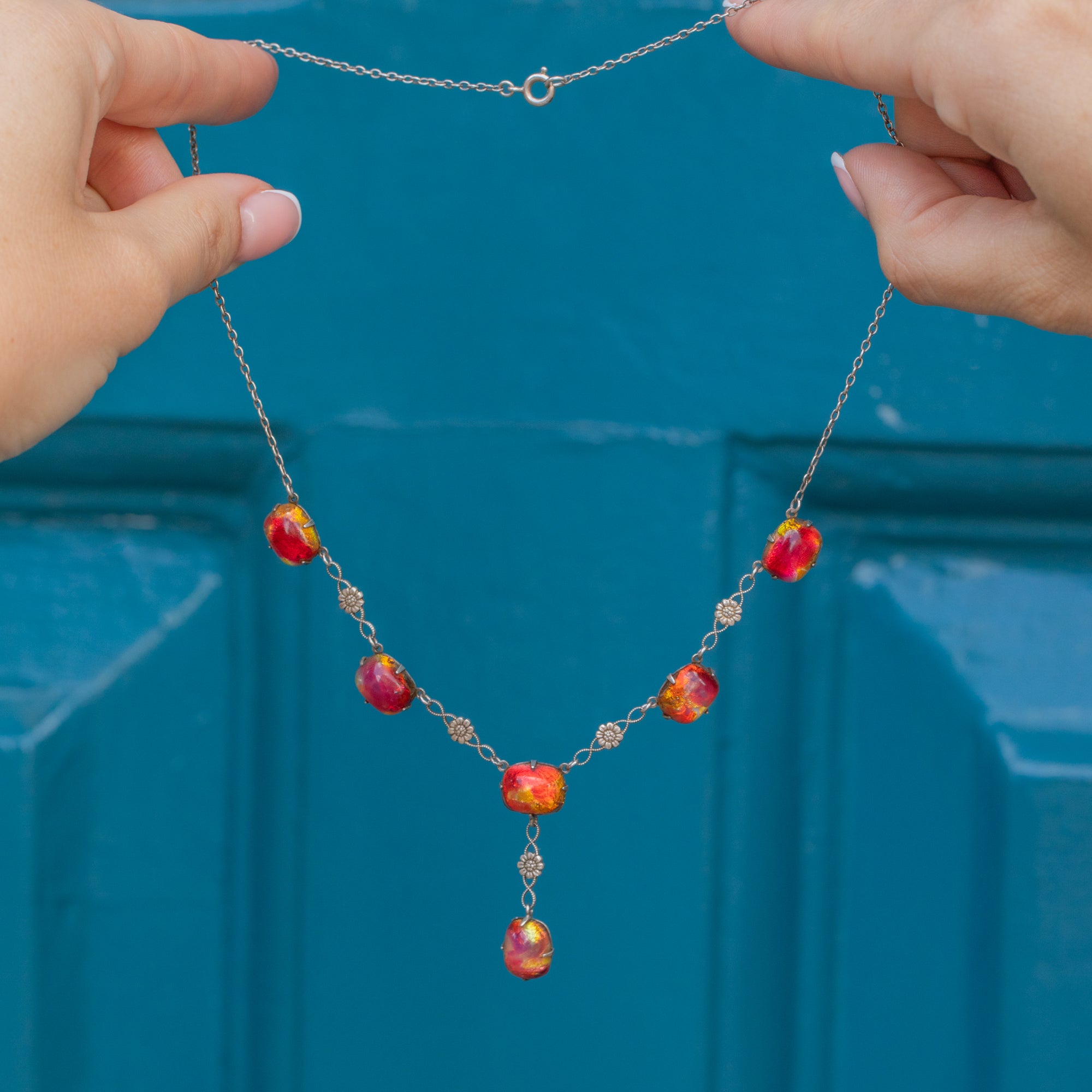 Made using Sterling Silver, this Arts and Crafts necklace hosts six handmade blazing cabochon 'Dragons Breath' stones, forged by mixing glass with molten metals. Interlinking each fiery 'Dragons Breath' stone are delicate links adorning engraved flower motifs, striking the perfect balance between delicate femininity and ferocious vitality.