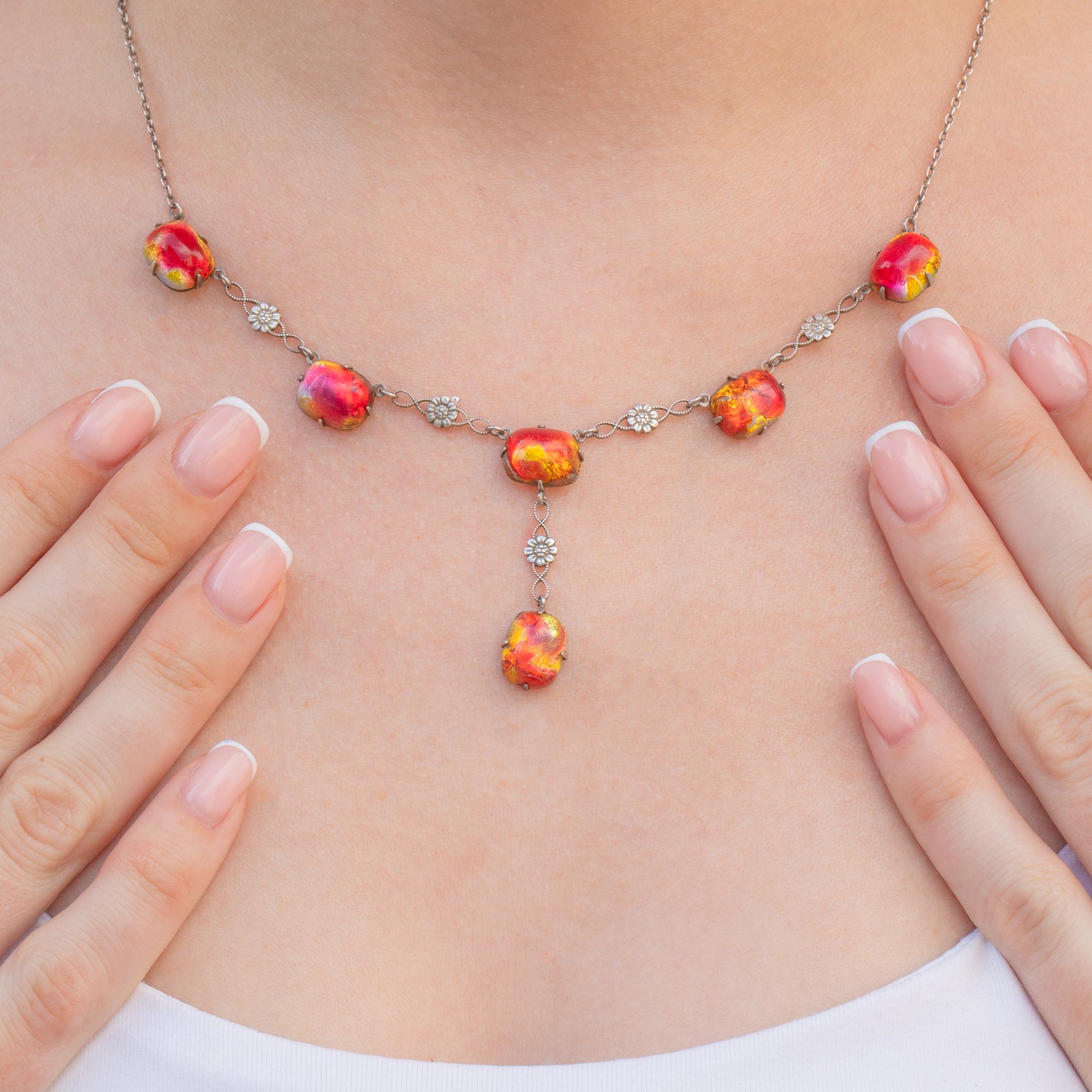 EXCELLENT This Arts & Crafts Era Dragons Breath Silver necklace is in excellent condition. Her glowing 'Dragons Breath' stones are exquisitely toned and securely set in their silver settings, allowing for safe and secure wear. Her Sterling silver is also in mint condition, her engraved floral motifs have retained their shape well over the years and with she has a gorgeous smooth tone. All in all, she will make a tremendous addition to your antique jewellery collection!