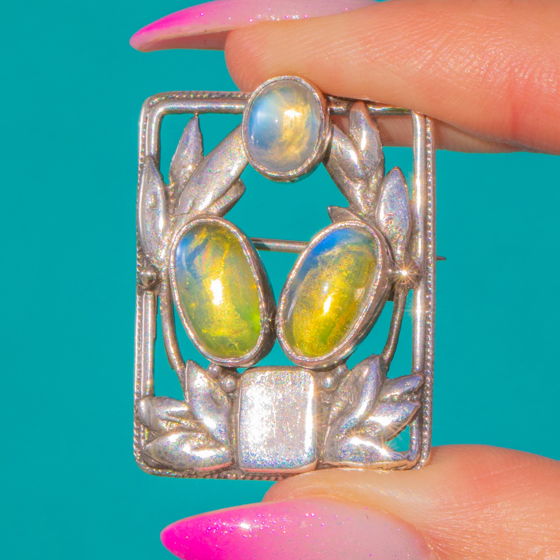 Alive with soft, ethereal glow, this Arts and Crafts Silver brooch brings together organic foliage and crisp geometry in a beautifully balanced open-frame design. Three foiled Moonstone cabochons take centre stage—two vertical ovals crowned by a petite round—each one foiled to amplify their blue-green adularescence. A fine milgrain border and applied foliate motifs lend delicate texture and depth, capturing the movement and romance of the era.