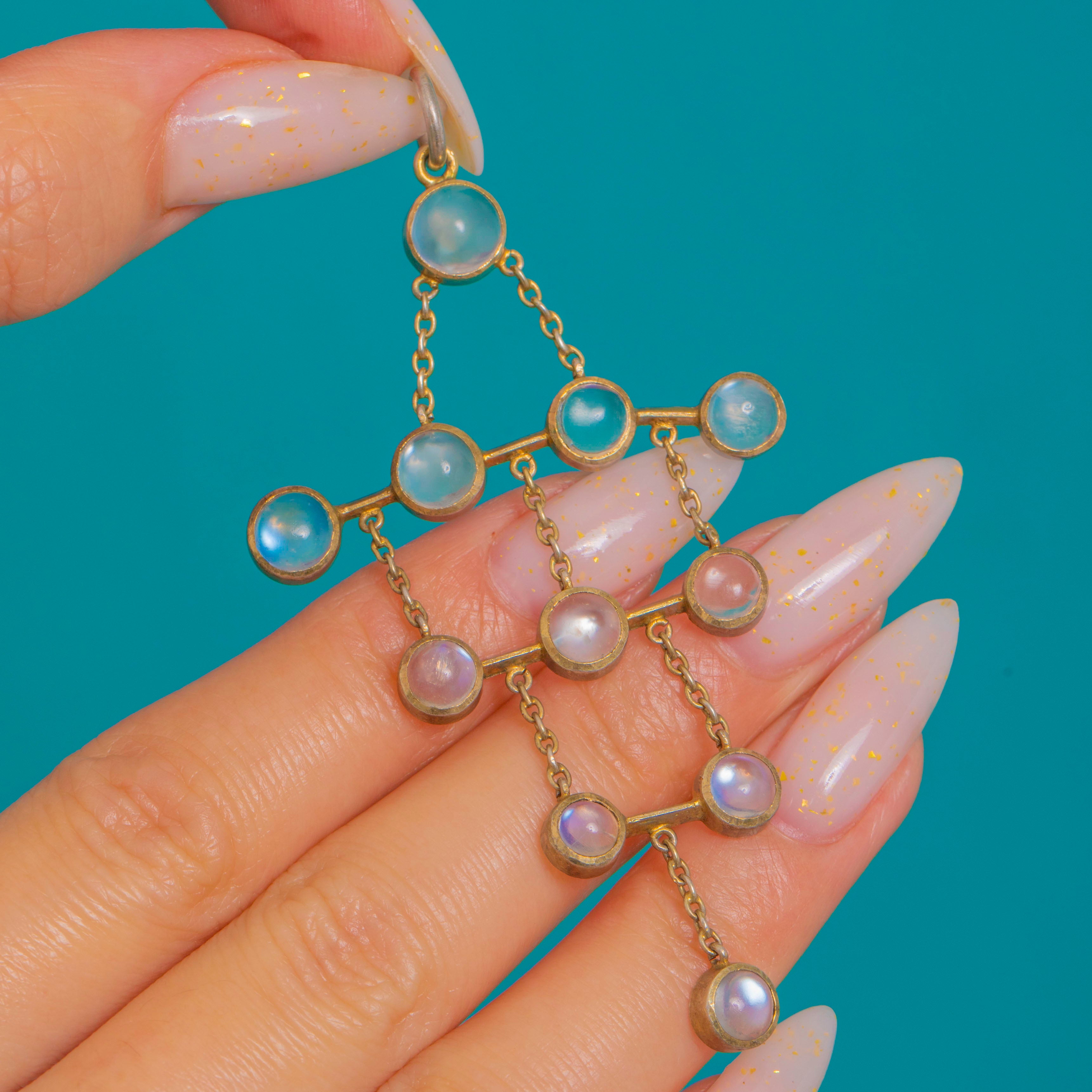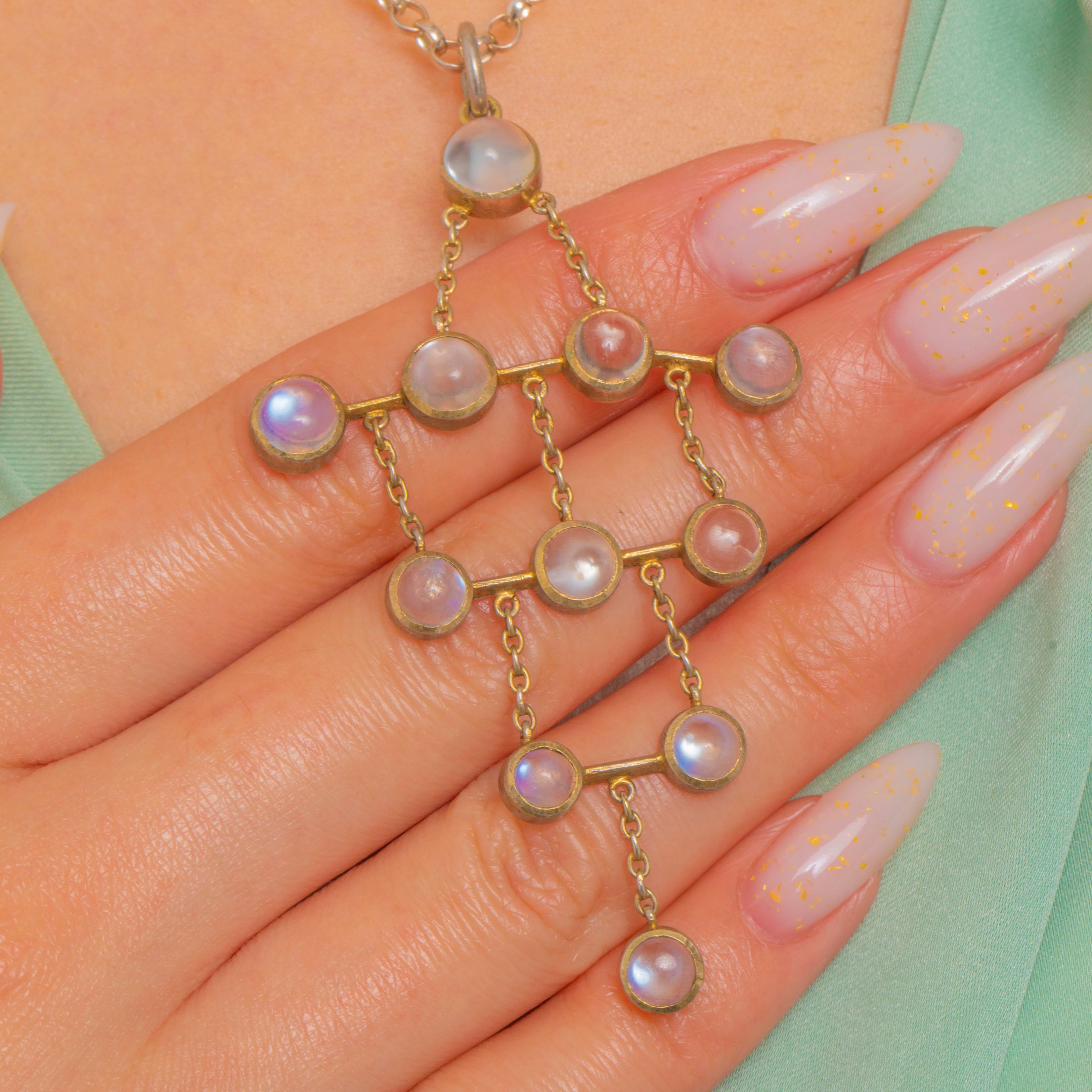 A beautifully balanced Arts & Crafts era pendant, crafted in Gold-gilded Silver and set with a constellation of glowing Moonstones. The design is all about rhythm and movement: bezel-set cabochons linked in a geometric drop that sways softly as you wear it.
