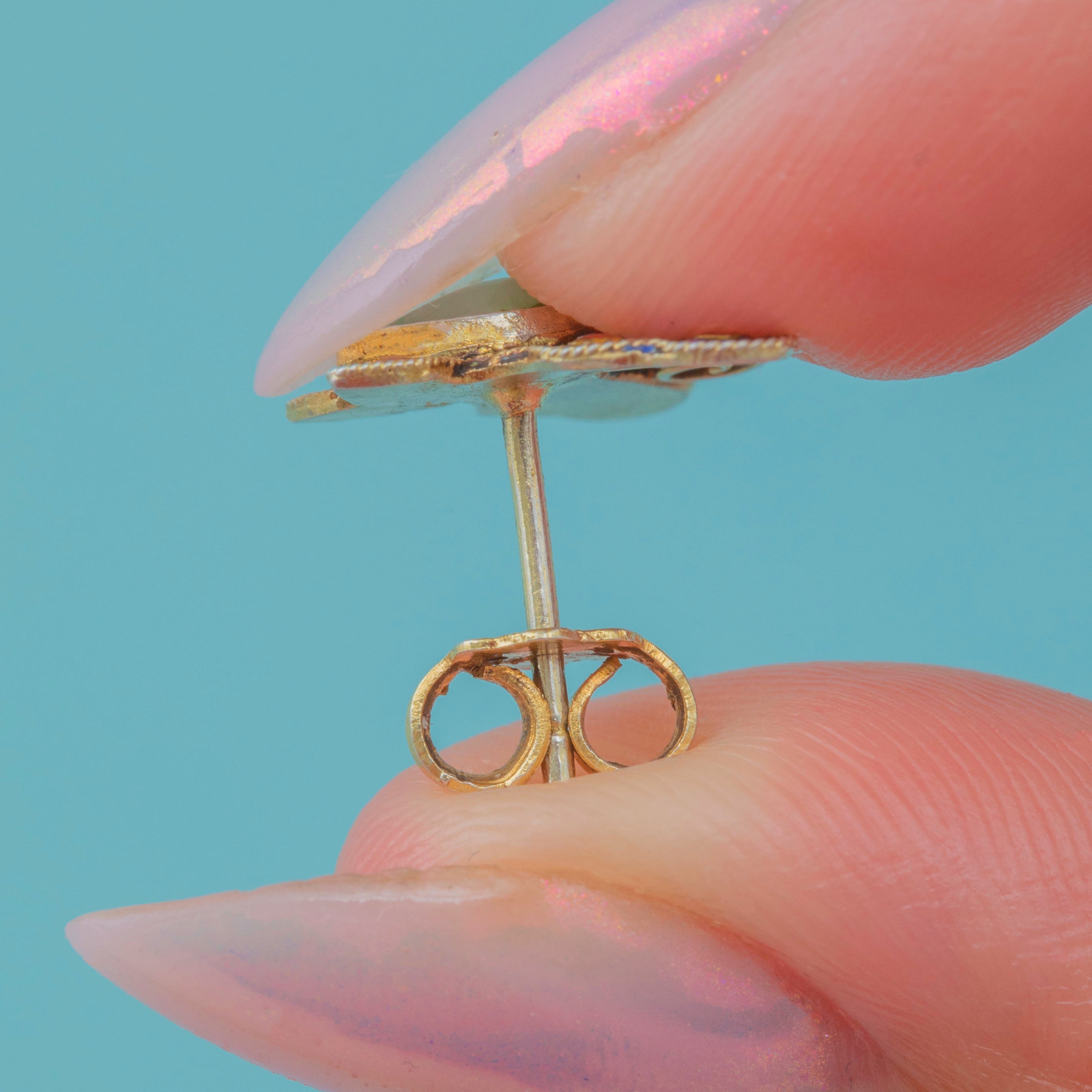 EXCELLENT: The Jade stones are in wonderful condition and are secure in their bezels, with their surrounding Enamel wings having retained a lovely saturation. Formed intricately and secured with butterfly backs, these Arts & Crafts earrings can be worn with confidence!