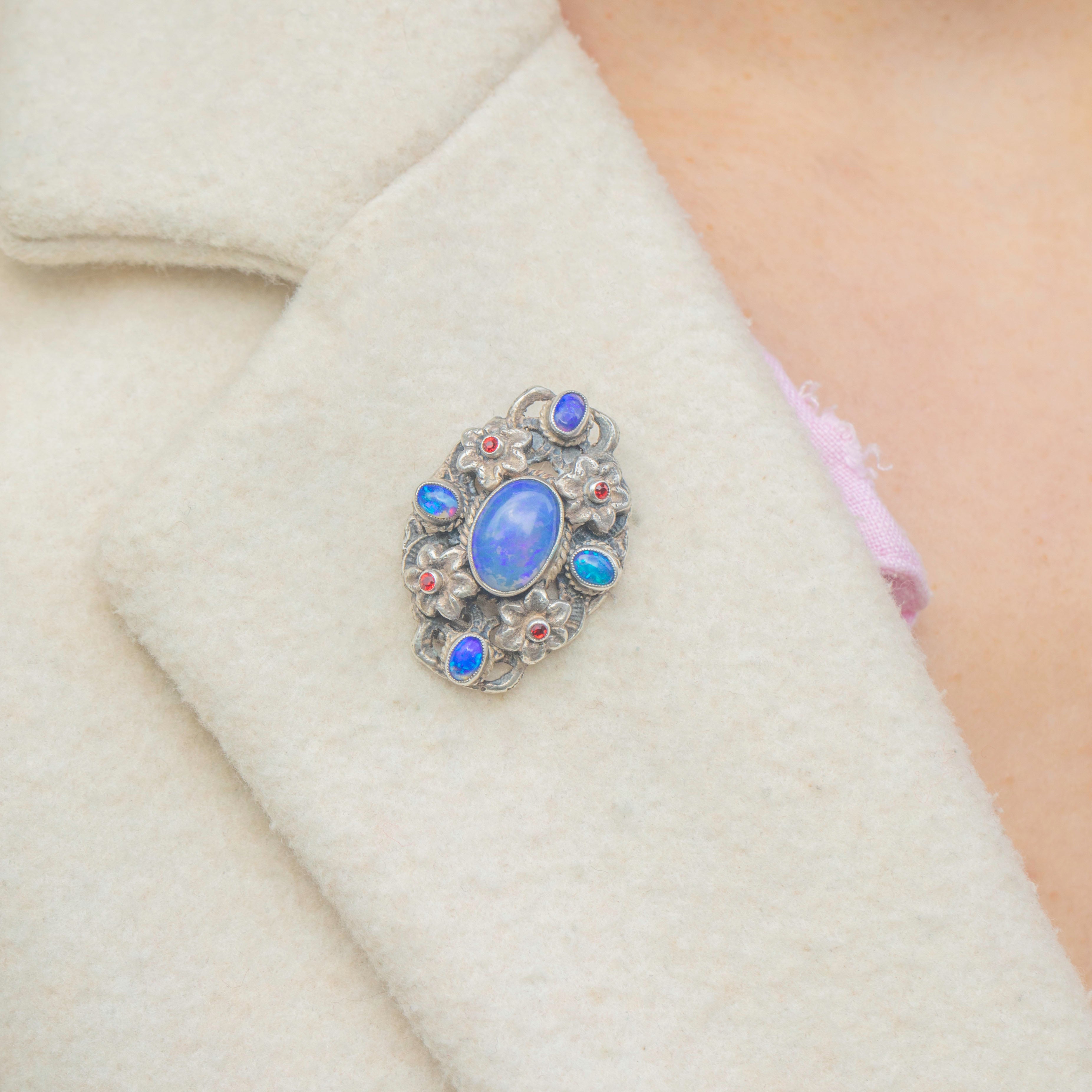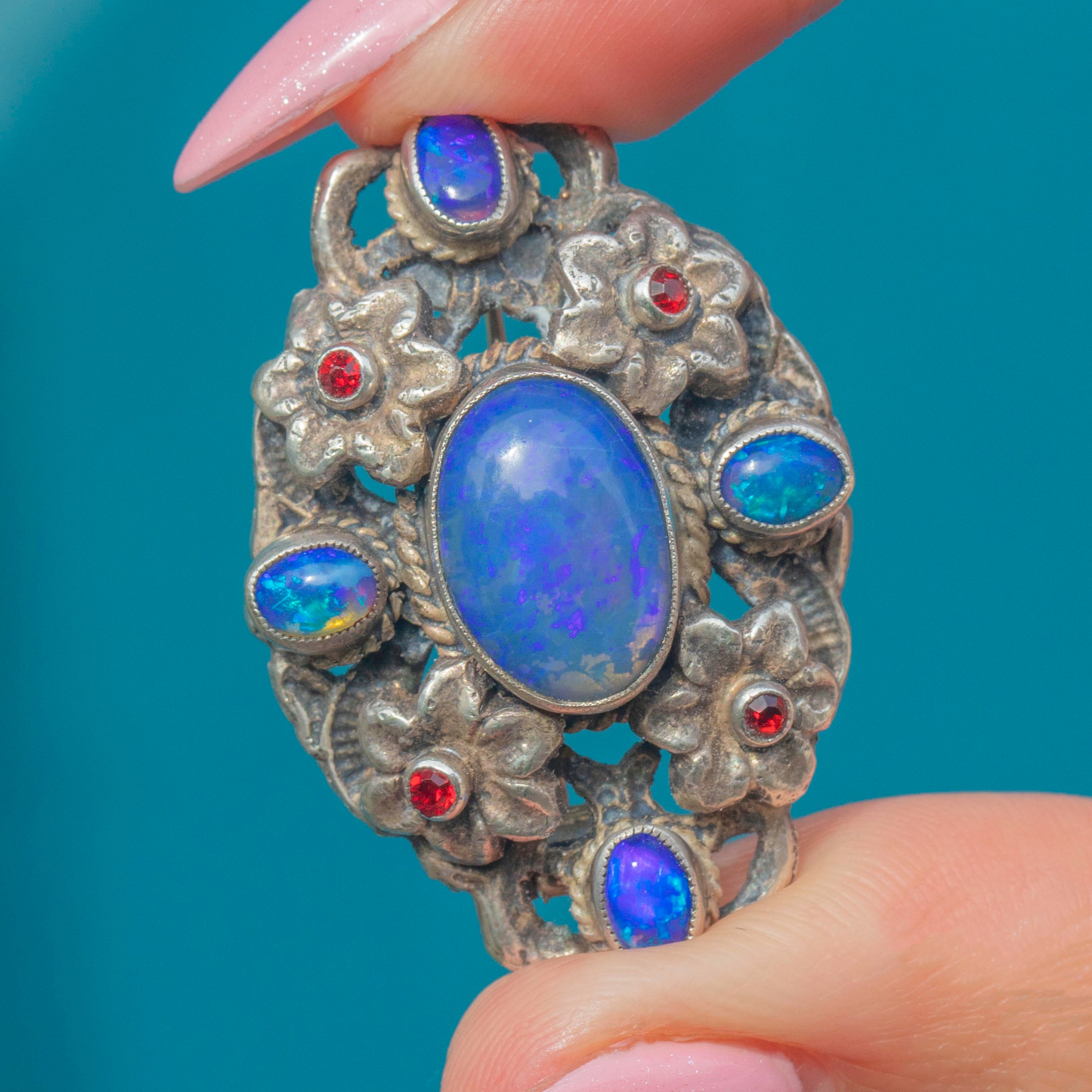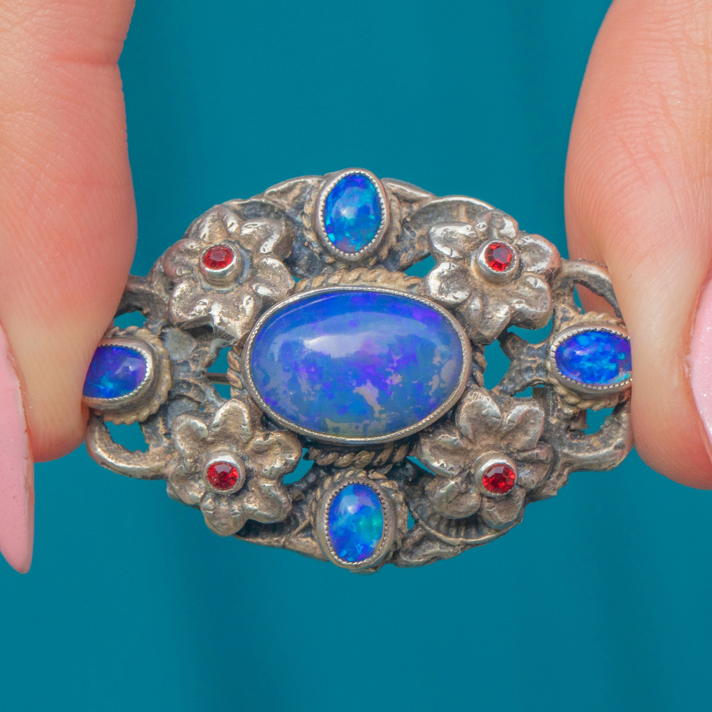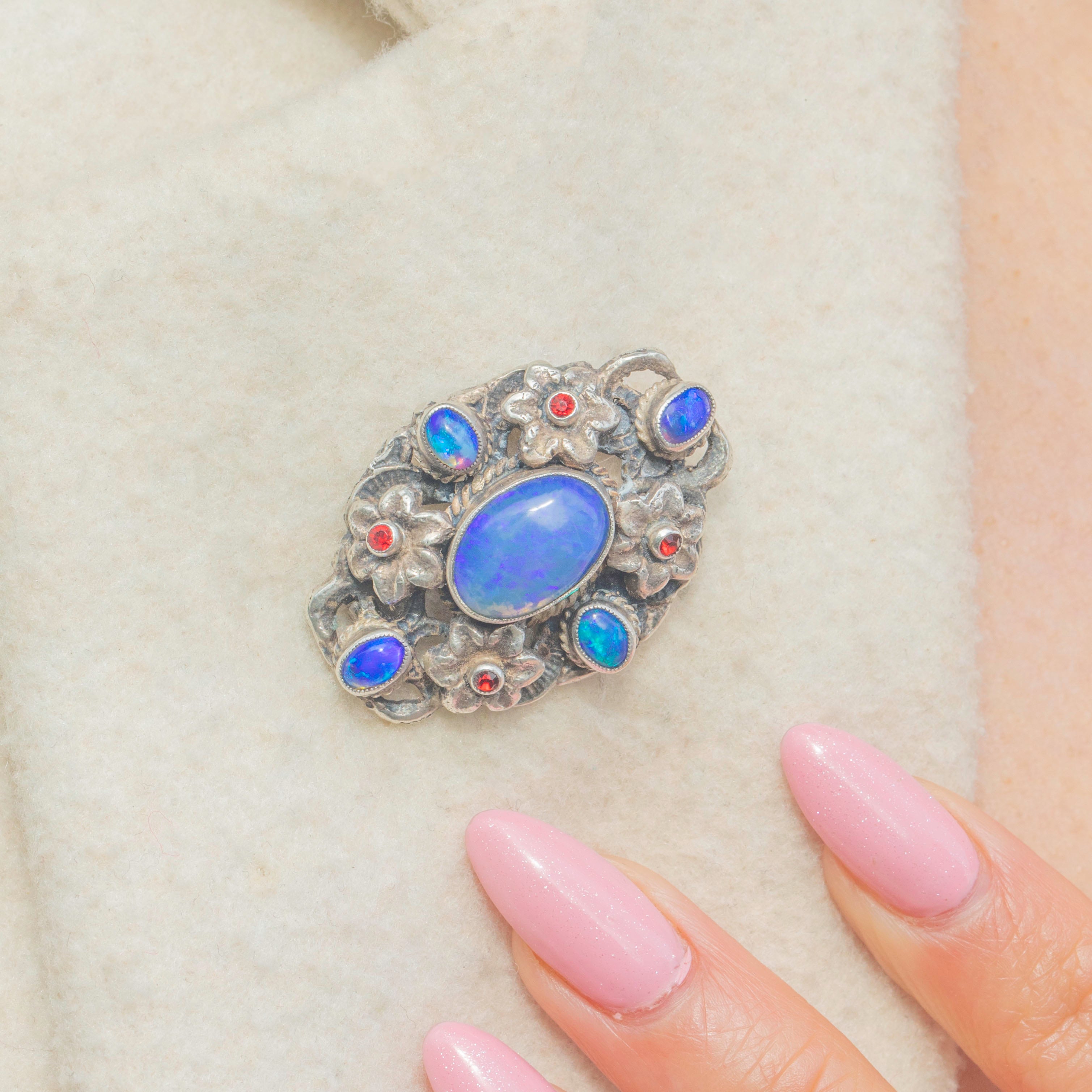 This Arts & Crafts Silver Opal floral brooch is an enchanting piece! Crafted from solid Silver, this antique brooch is inlaid with 1.54cts of Opals and dotted with dainty red Paste, enhanced by the moody patina accrued within the floral details.
