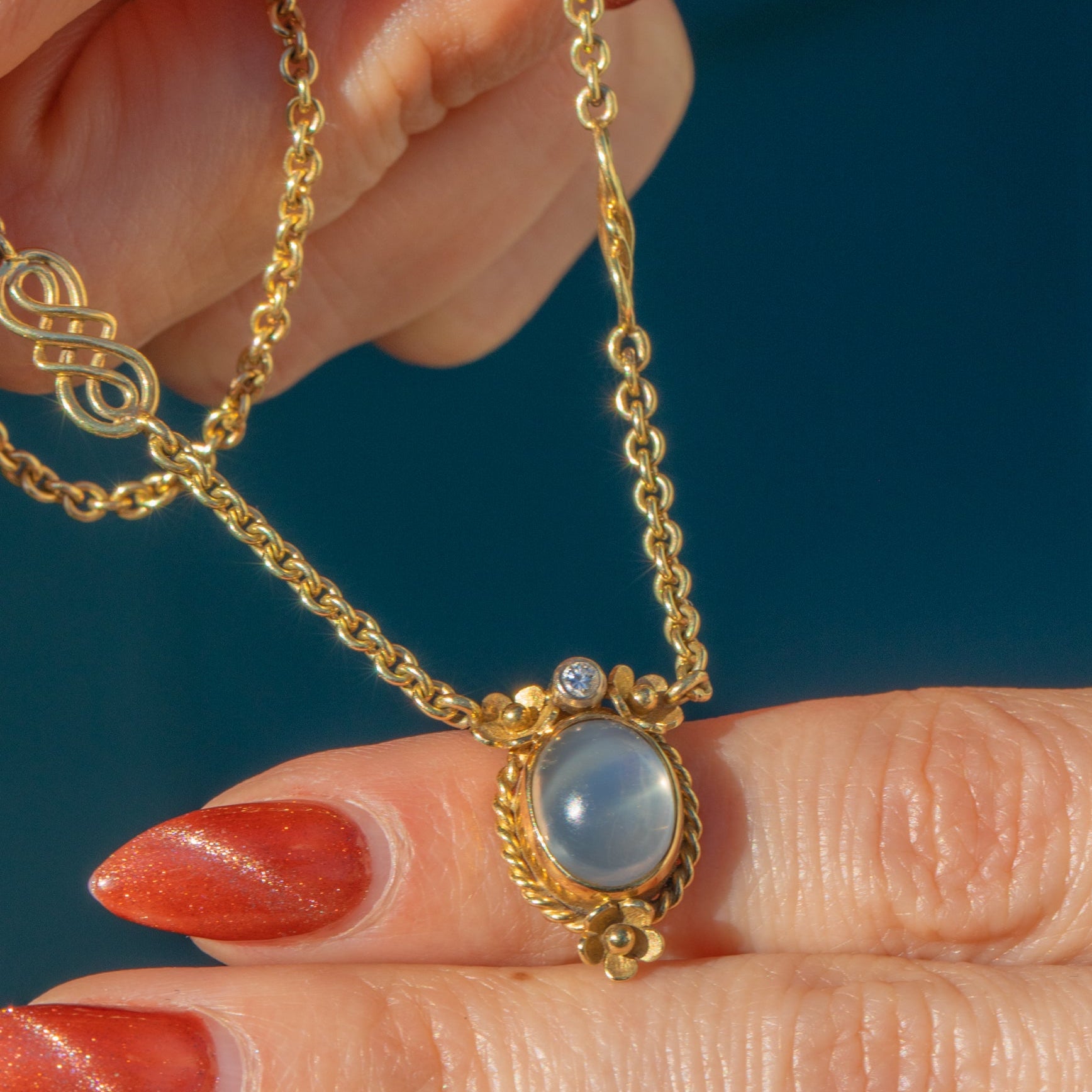 She is complete with a petite Diamond resting above the central Moonstone, adding a subtle touch of glamour and refined elegance in quintessential Art Nouveau style. With a gorgeous detailed chain, this antique necklace is a wonderful piece to incorporate into your collection!