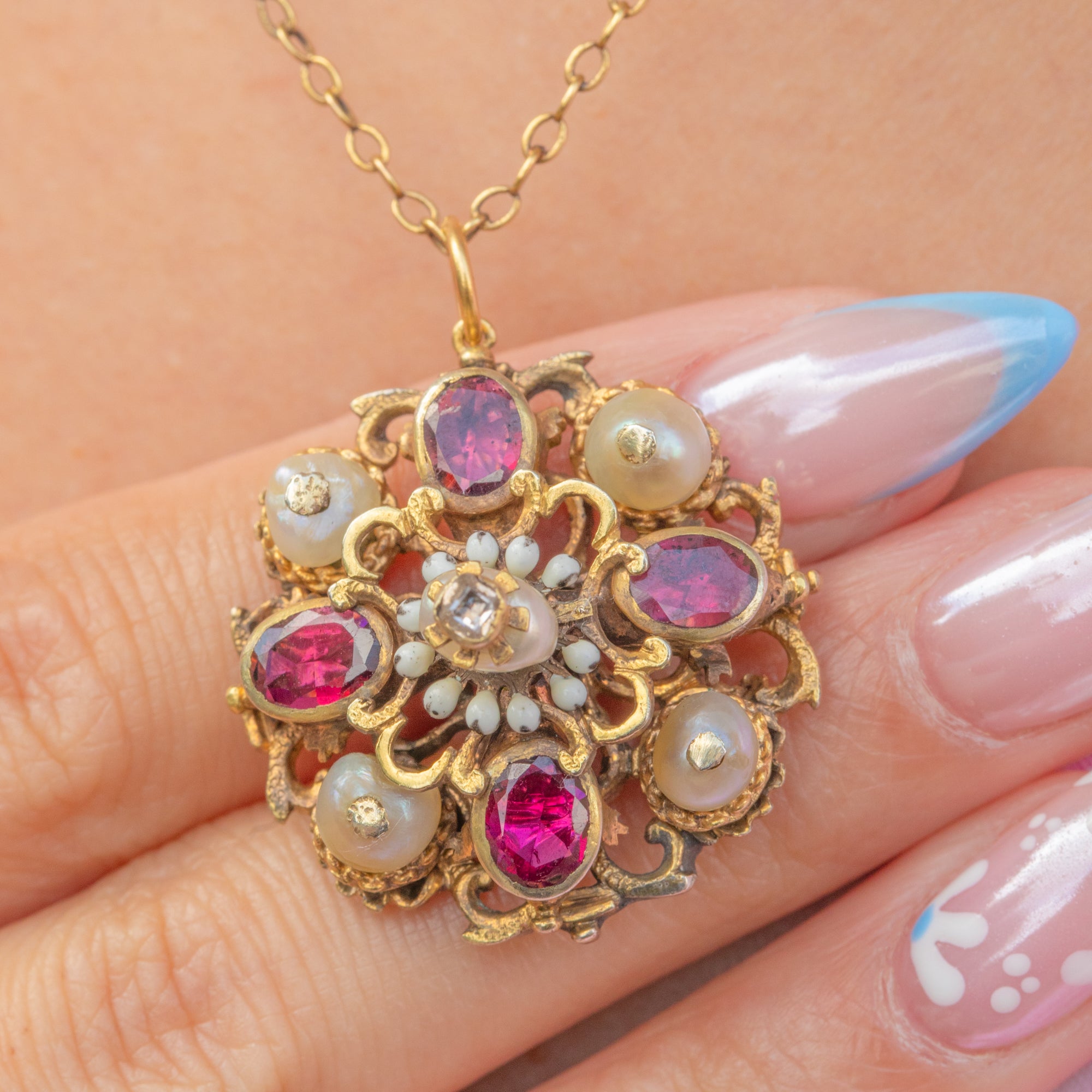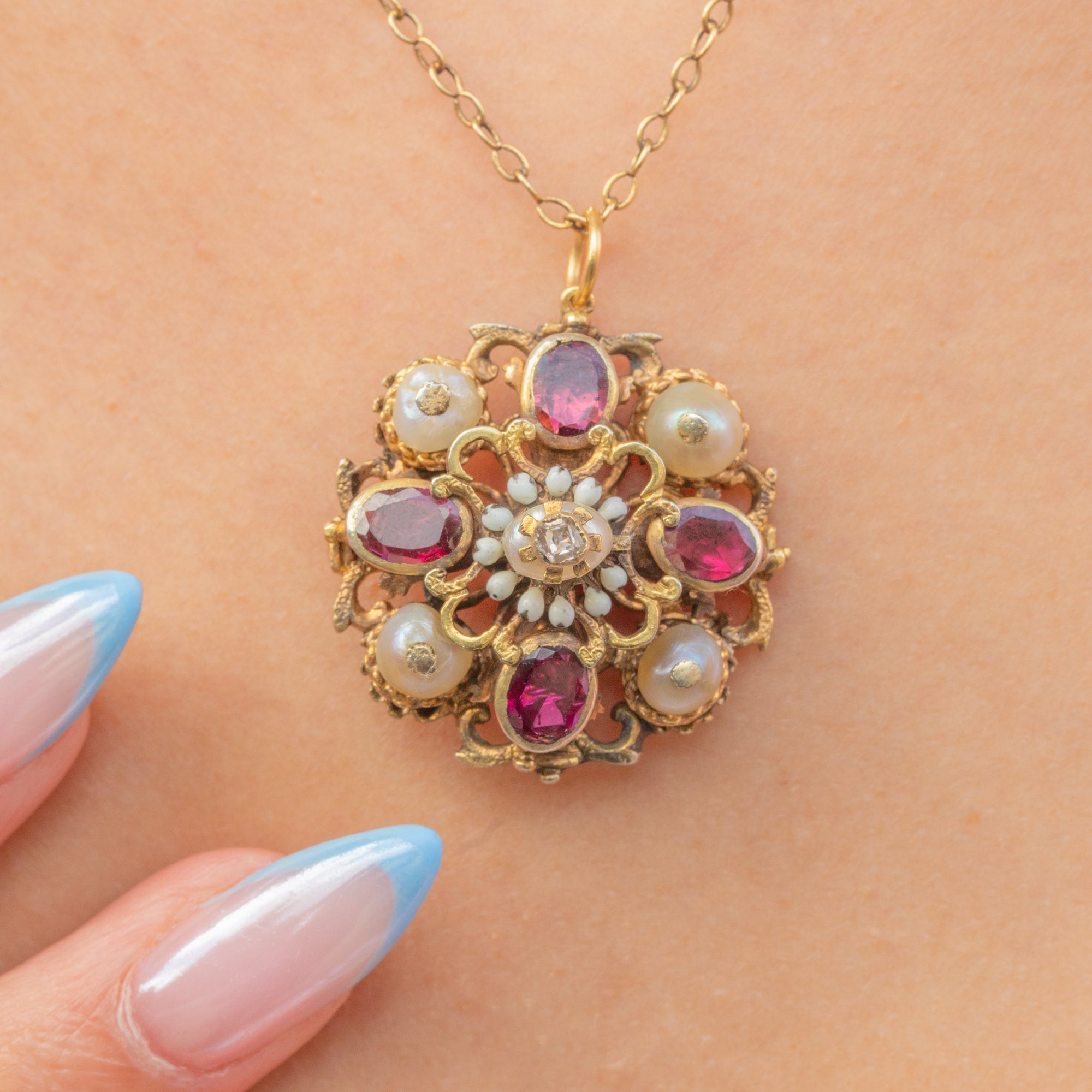 A rare table-cut Diamond sits in the centre, poised on top of a baroque Pearl, surrounded by white Enamel details and framed by alternating shimmering Pearls and seductive crimson Garnets.