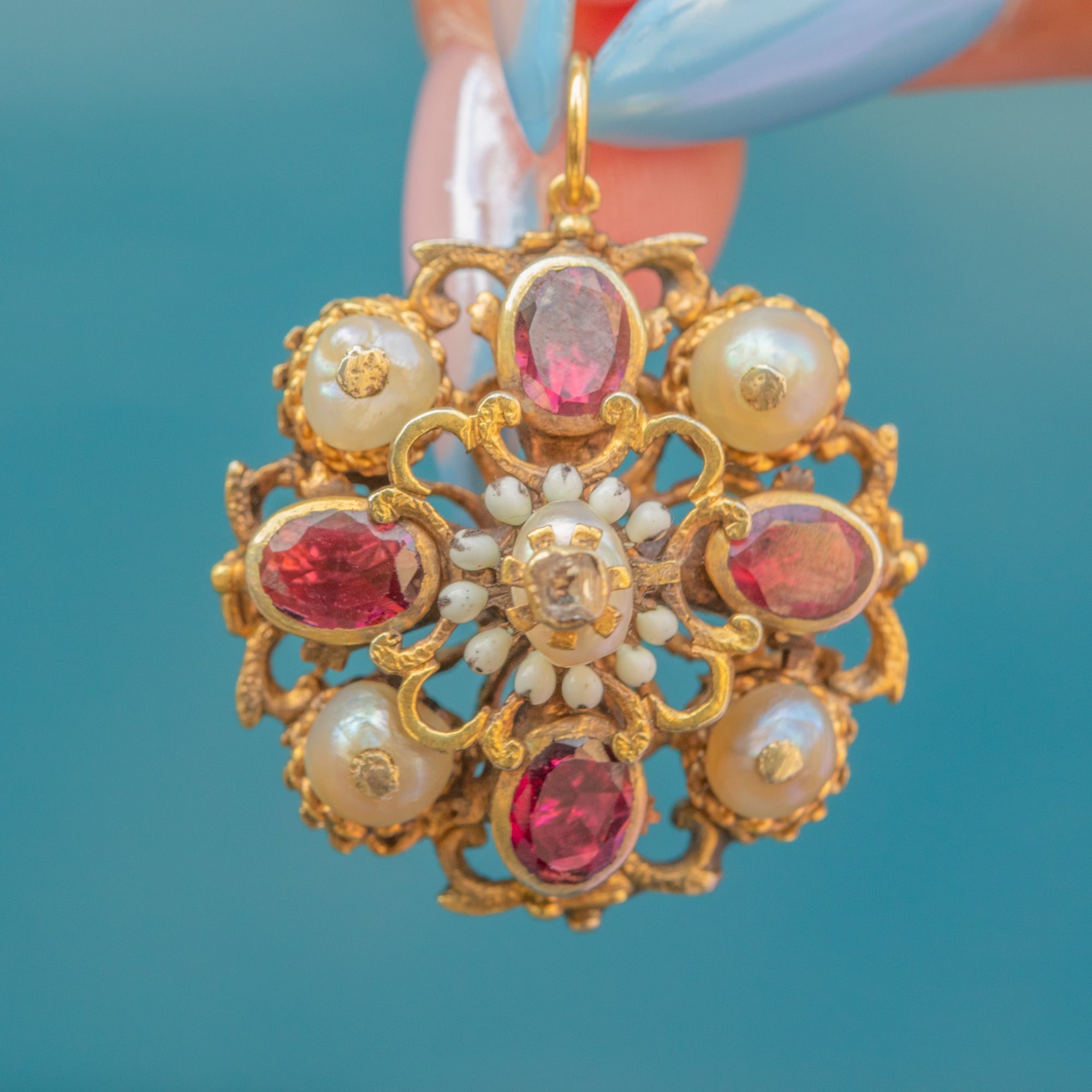 MATERIALS: Tests as Silver, Gilded with 18ct Gold, Garnets, Pearls, RARE Table Cut Diamond, Enamel.