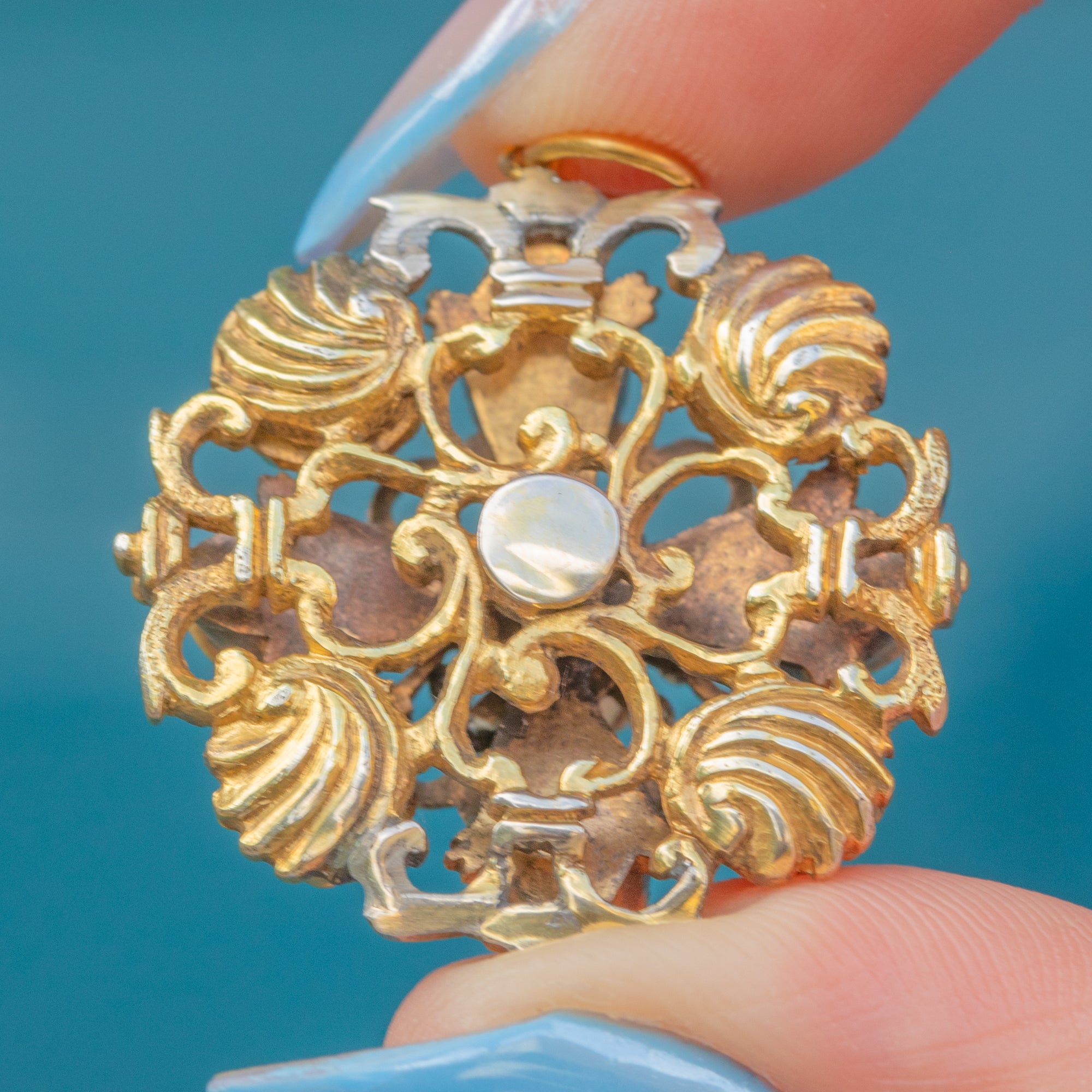 The intricate craftsmanship of this lavish antique pendant can be admired from every angle - even the back displays whimsical shell details!