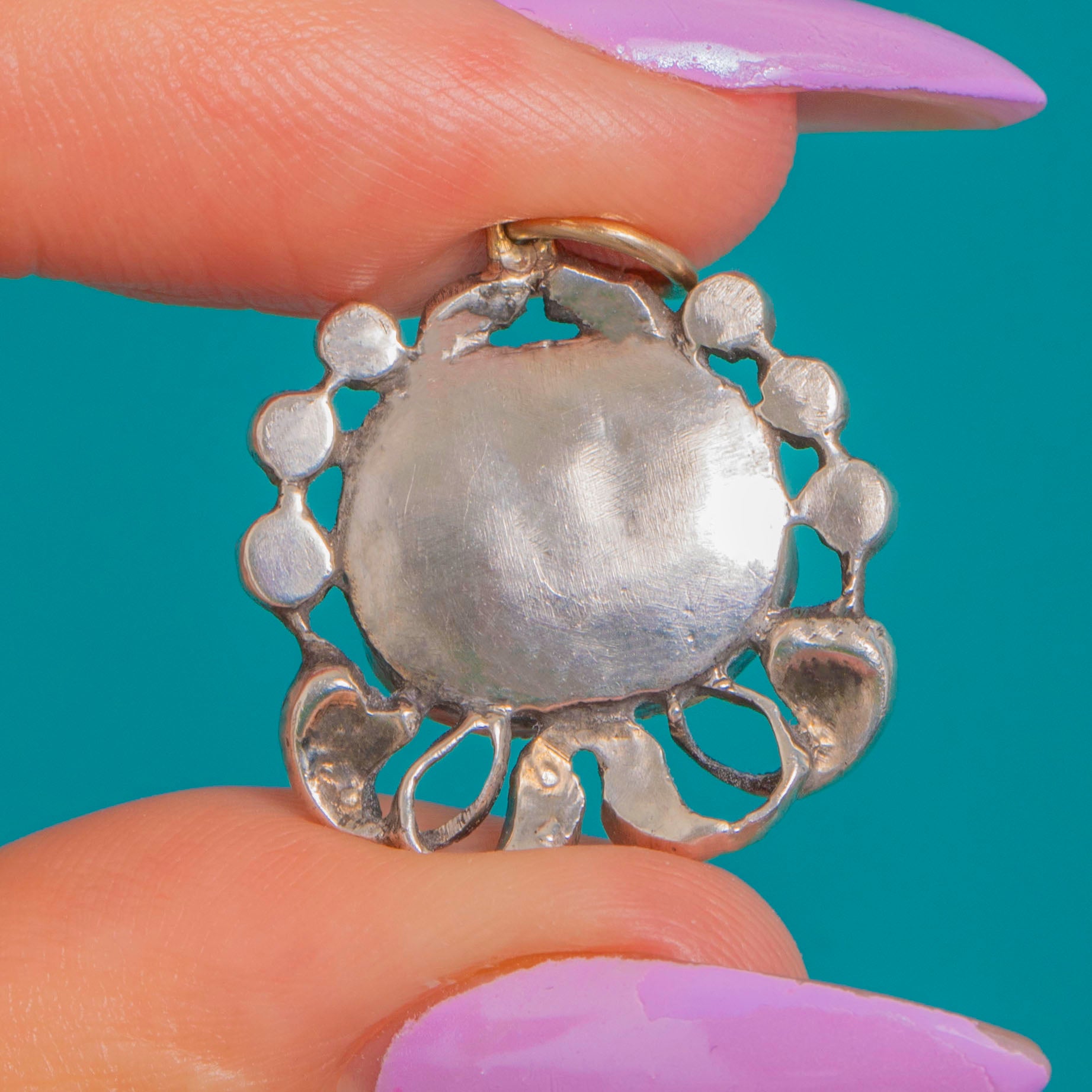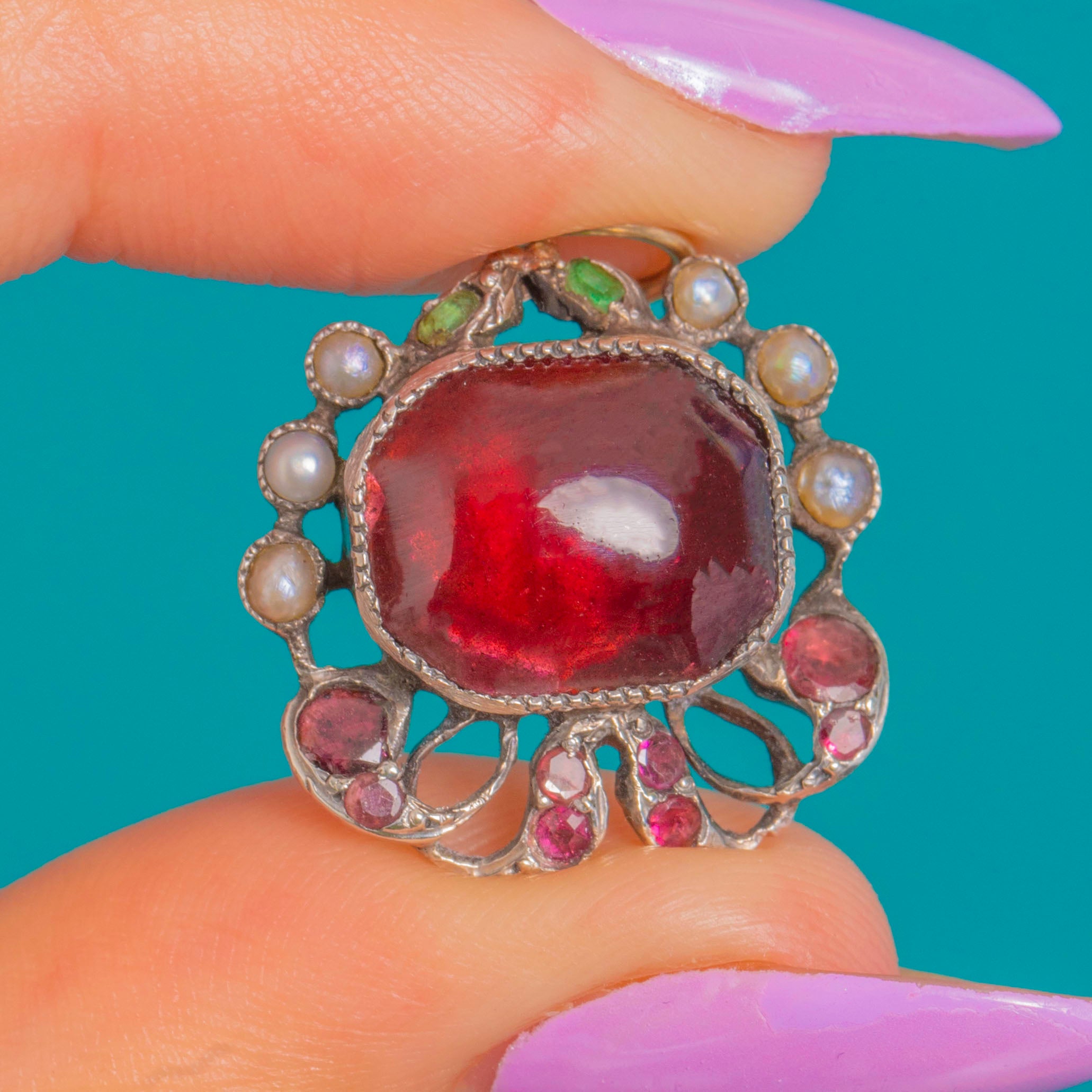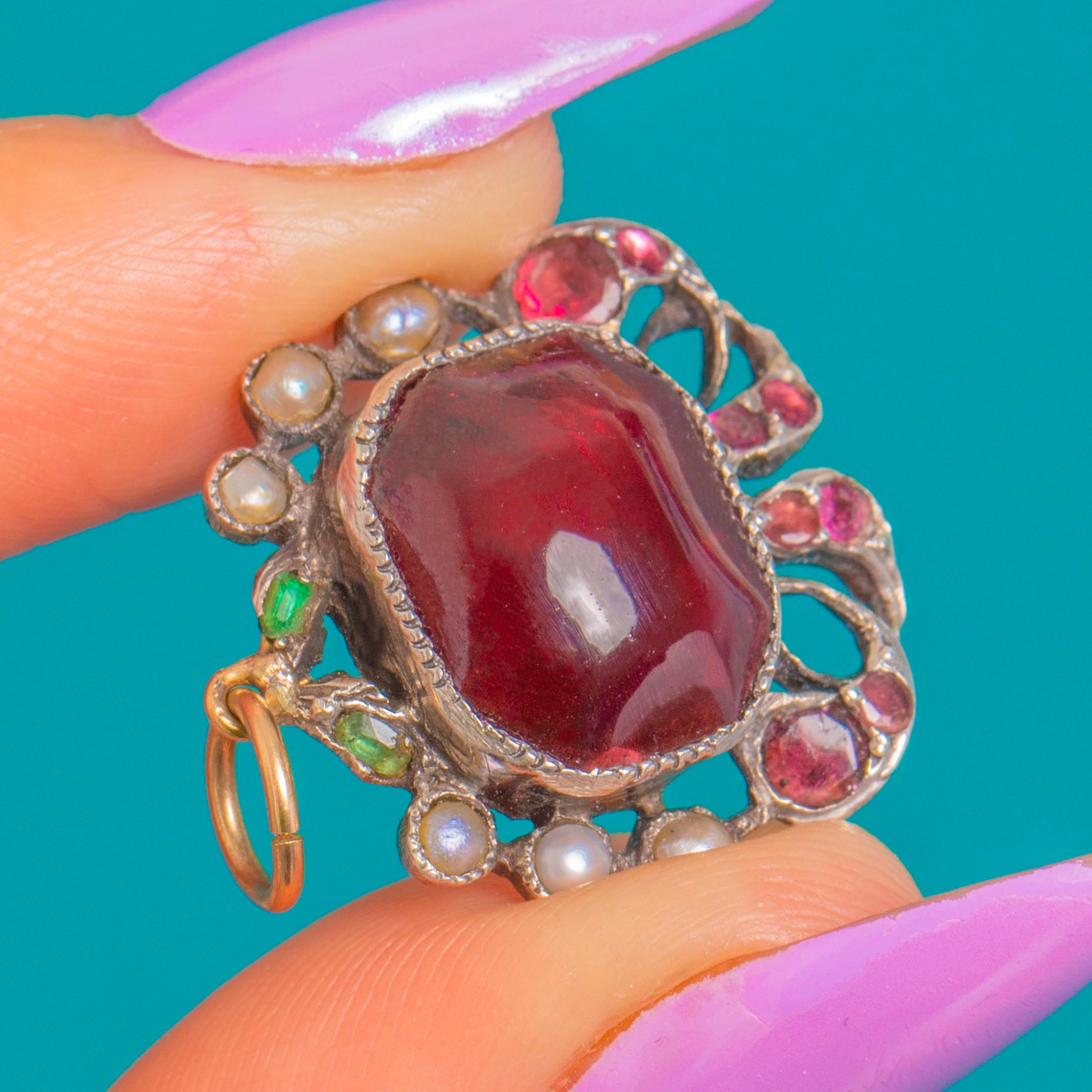 A rich and romantic Austro-Hungarian cherry-red Garnet pendant! Crafted by hand in solid Silver, the glowing domed Garnet cabochon is framed by a dainty halo of creamy Seed Pearls. The openwork foliate and scroll motifs, finished with delicate Emerald accents, create a lace-like silhouette that feels both ornate and exquisitely refined.