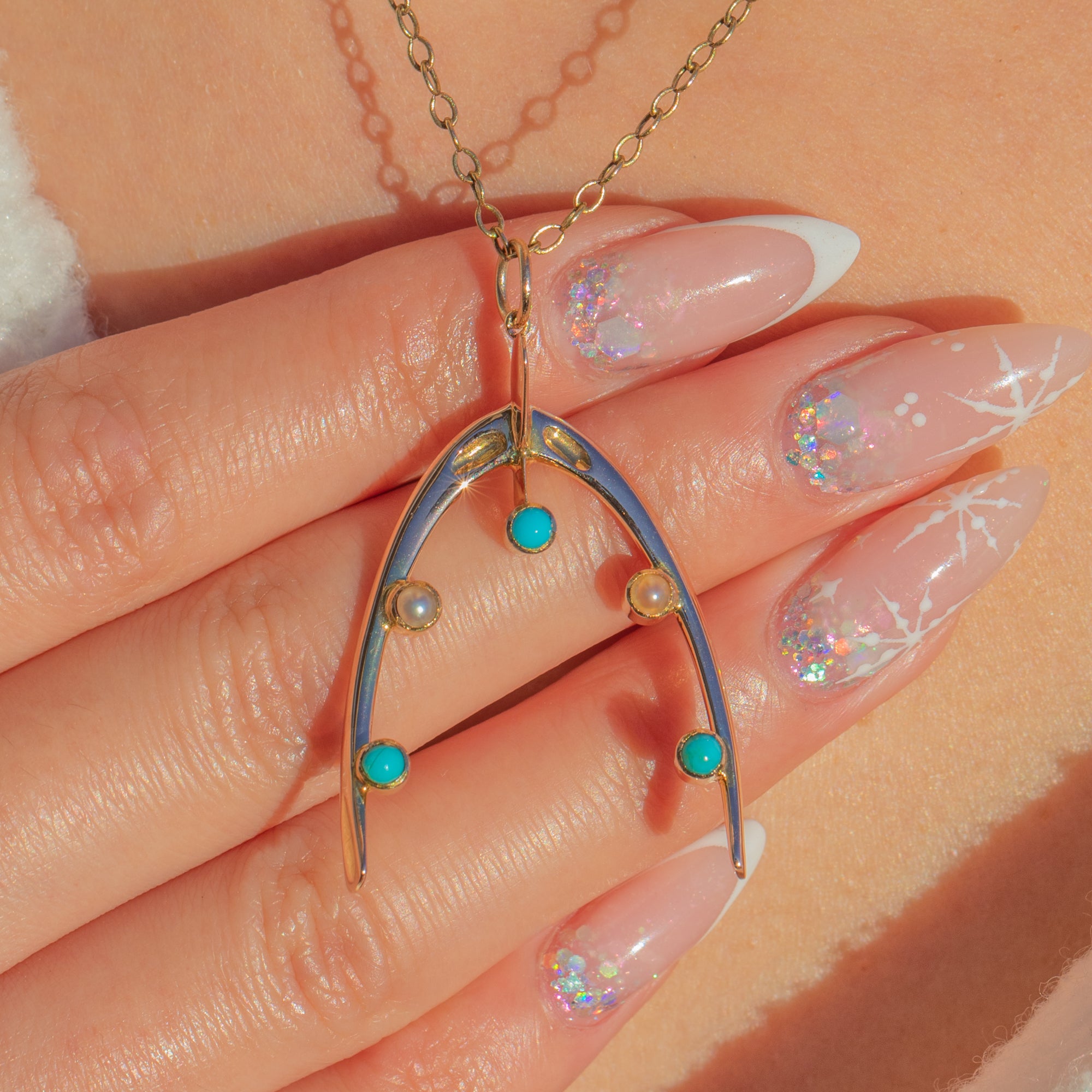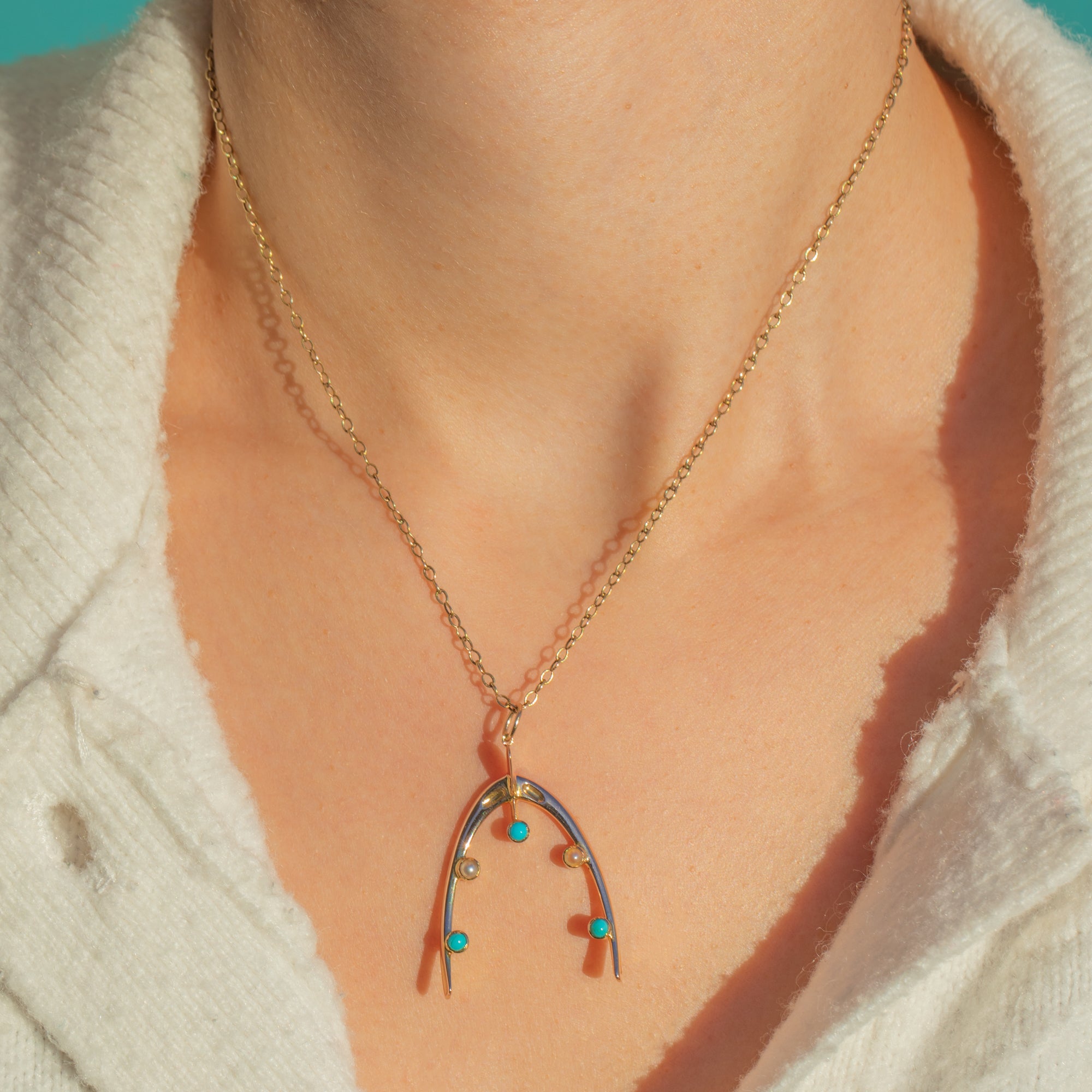 A charming Edwardian wishbone pendant crafted in rich 15ct Gold, set with petite Turquoise and a creamy Pearl along the inner arc. The open-frame silhouette feels airy and refined, and will add a touch of luxury to every outfit.