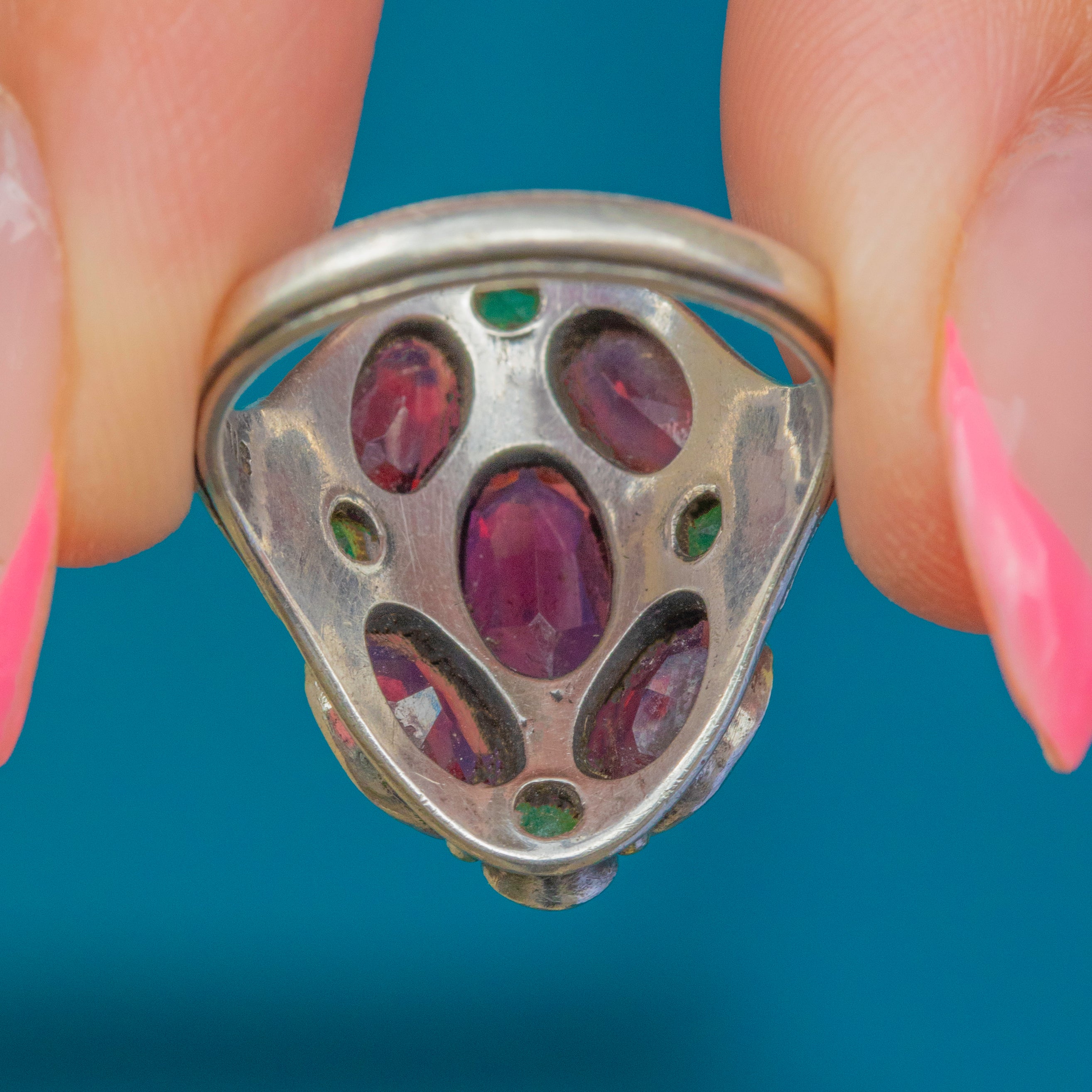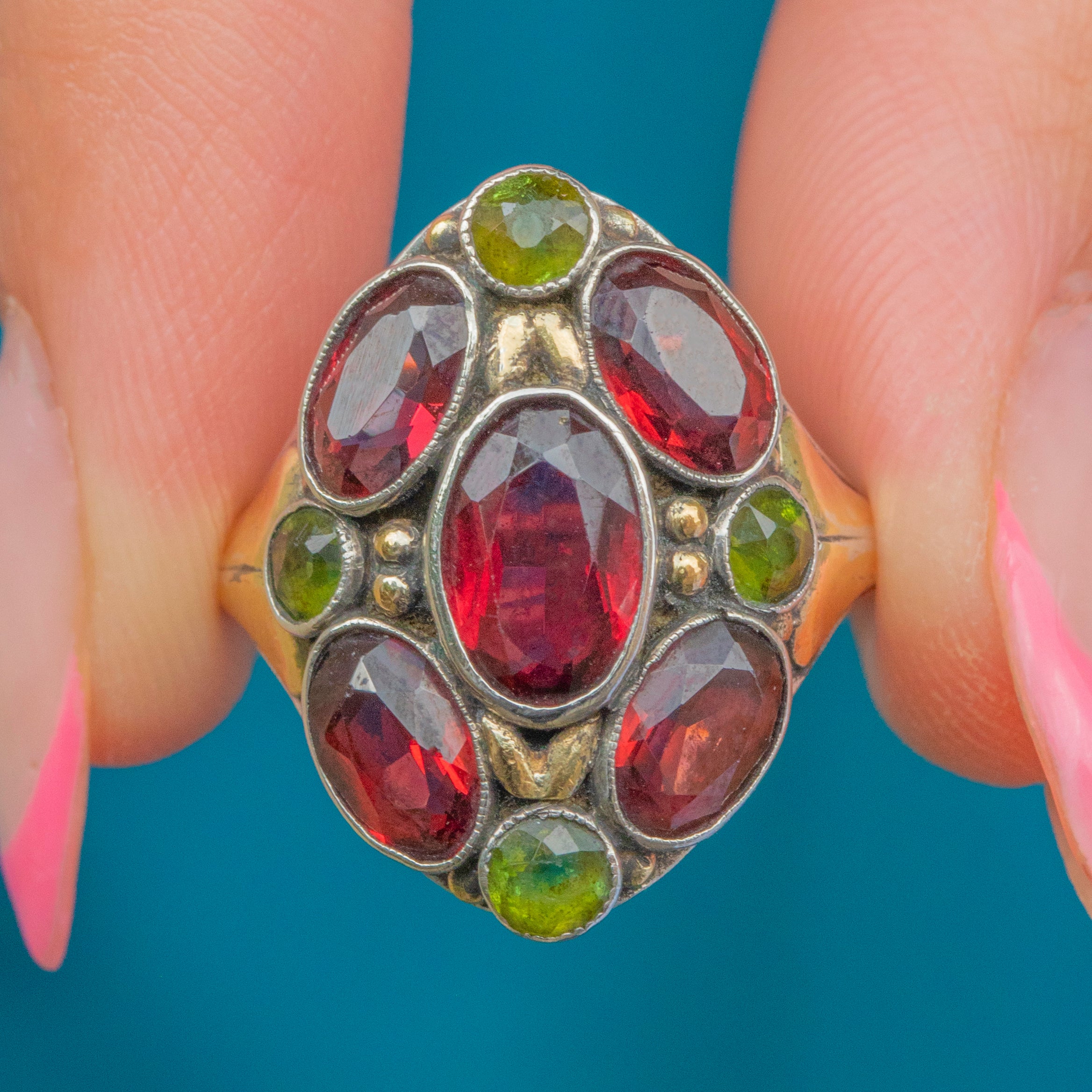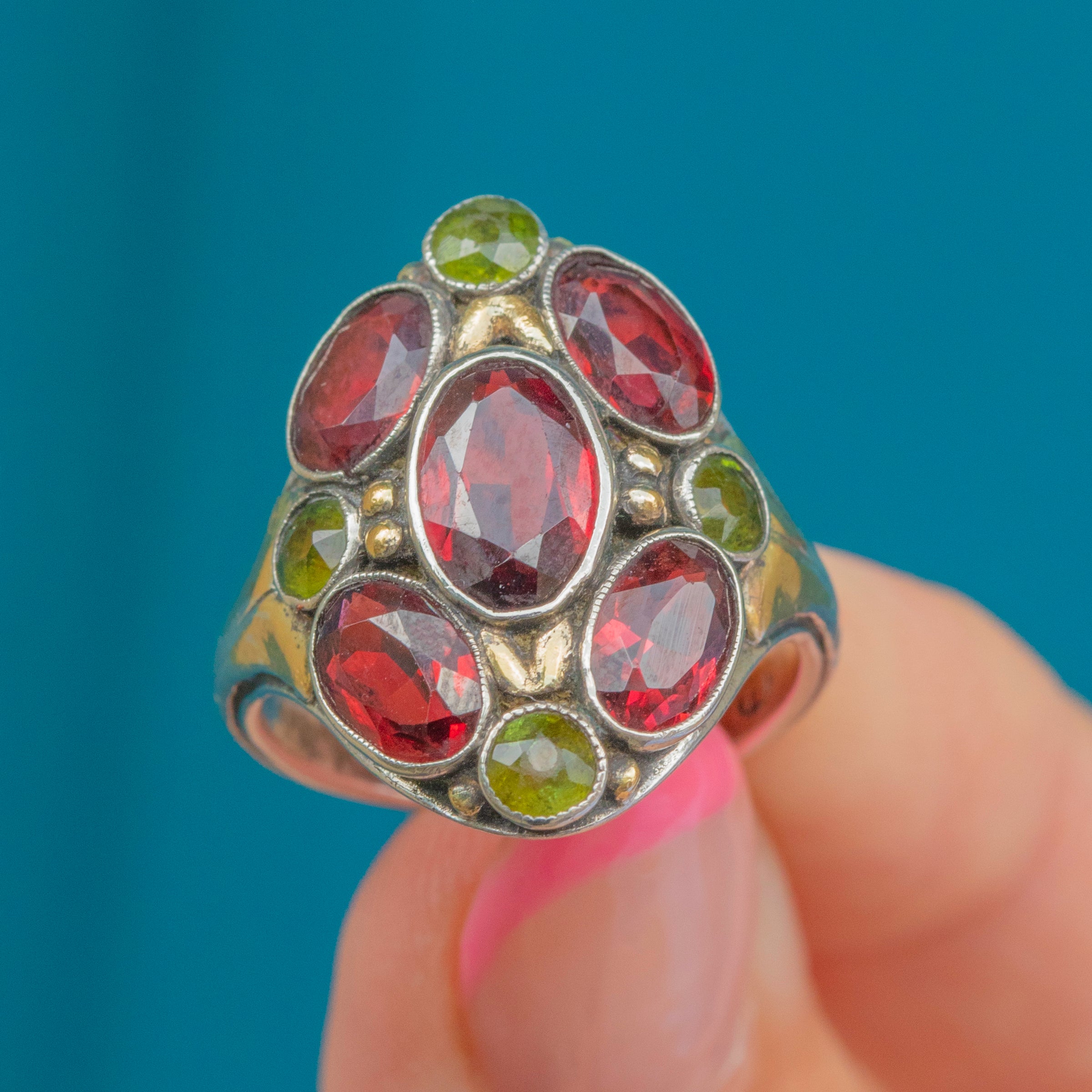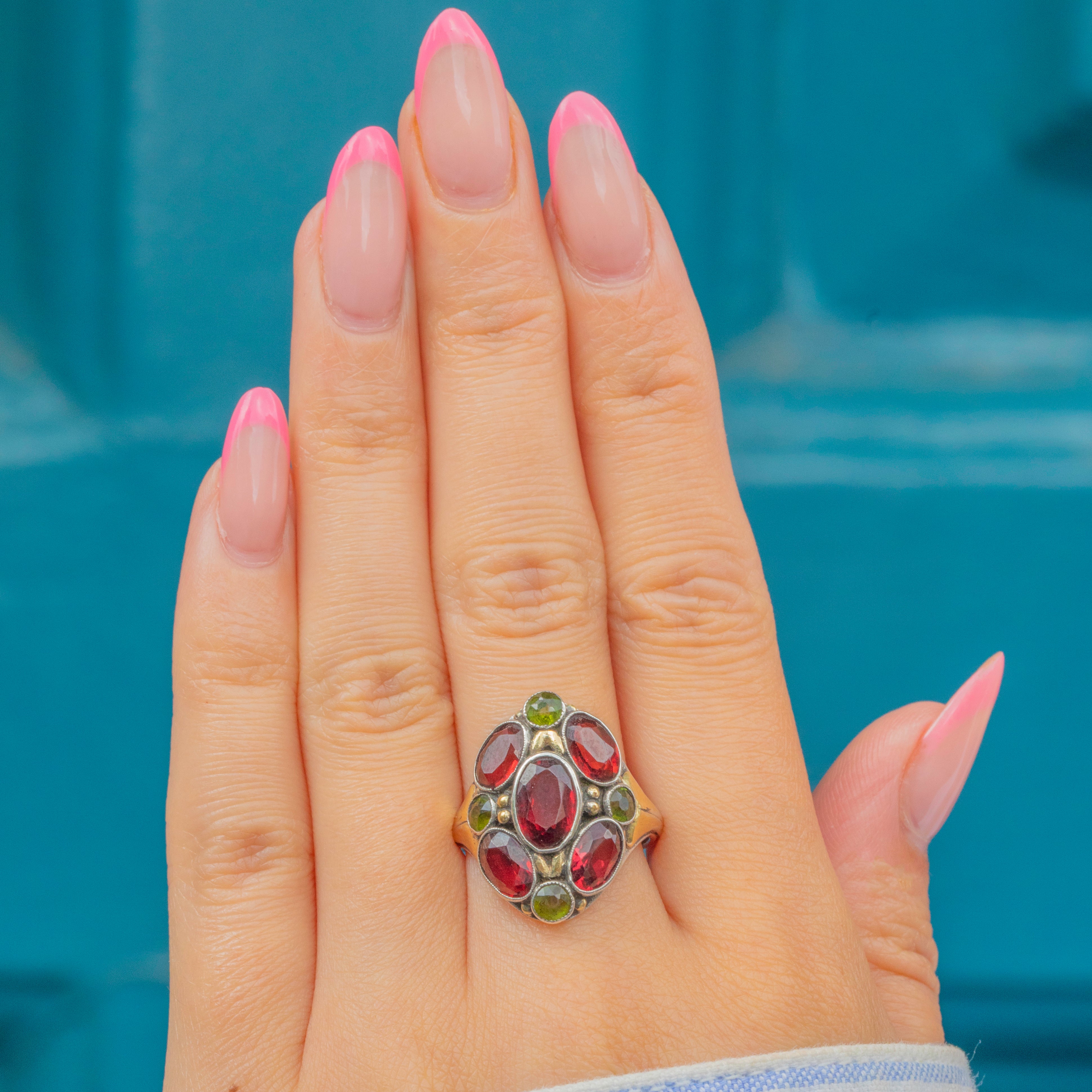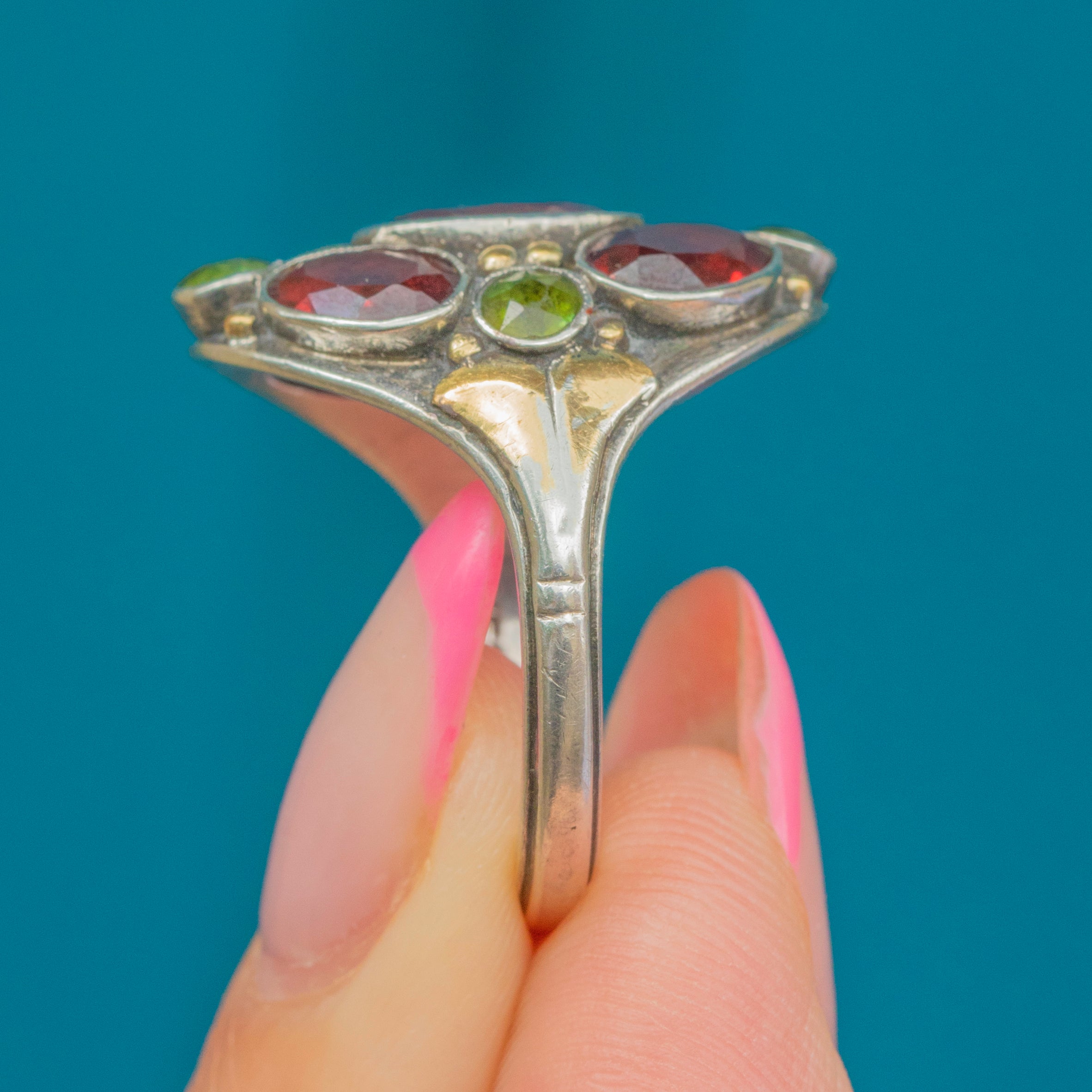 Signed by Bernard Instone, this Arts & Crafts Garnet cluster ring is so distinctive. Taking a naturalistic form, this Silver ring is inlaid with cherry red and chartreuse green Garnets!