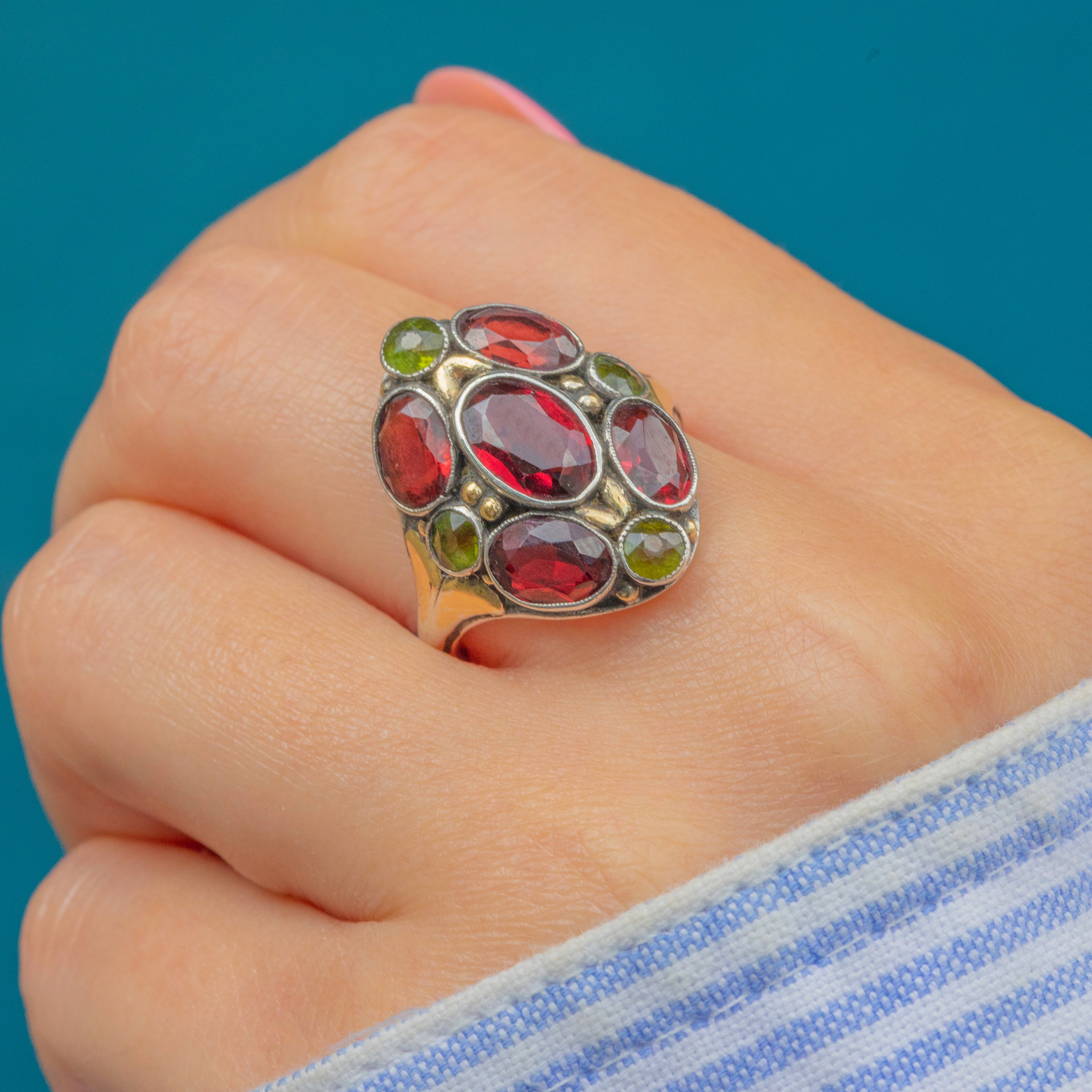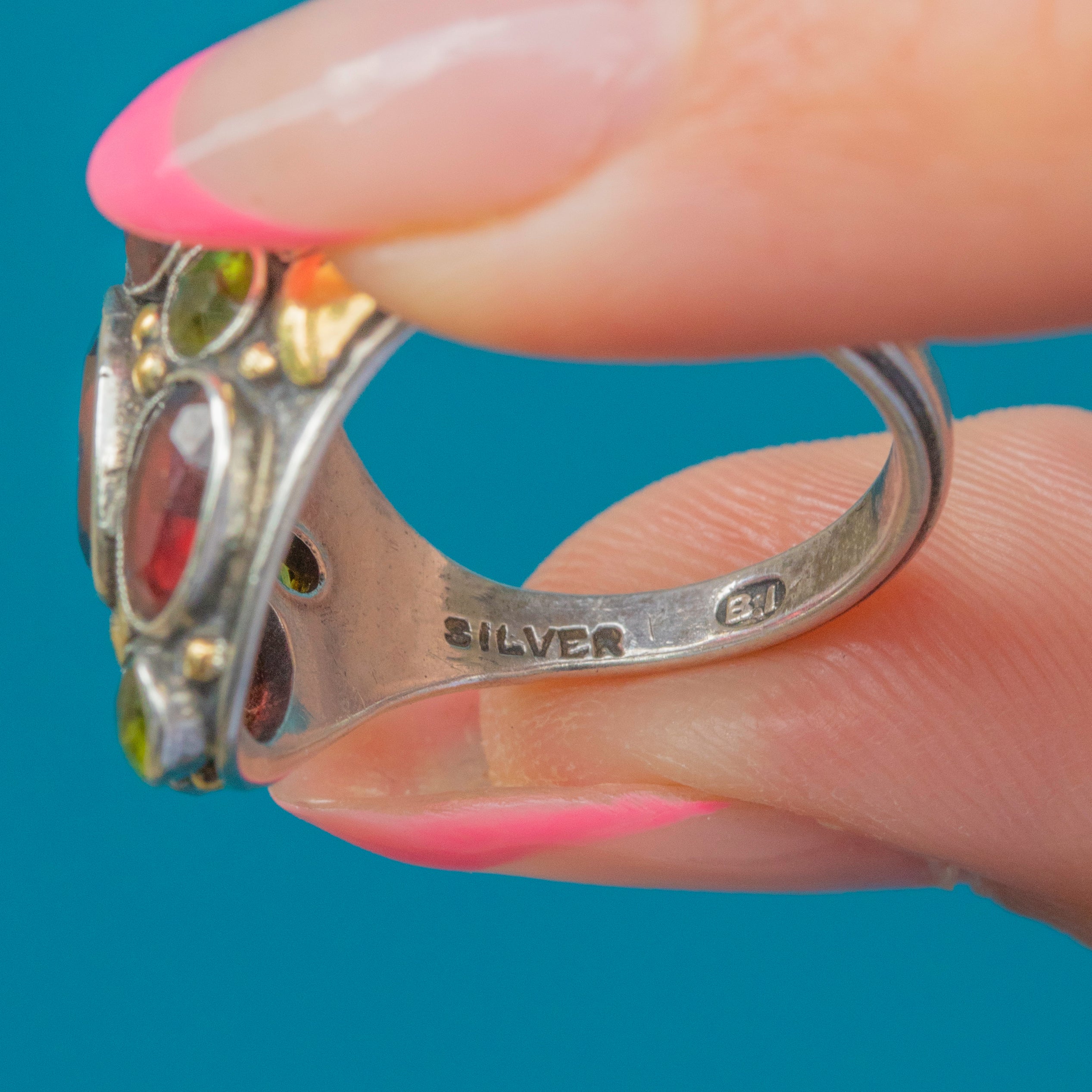 MATERIALS: Sterling Silver, Green Garnets, Red Garnets.
