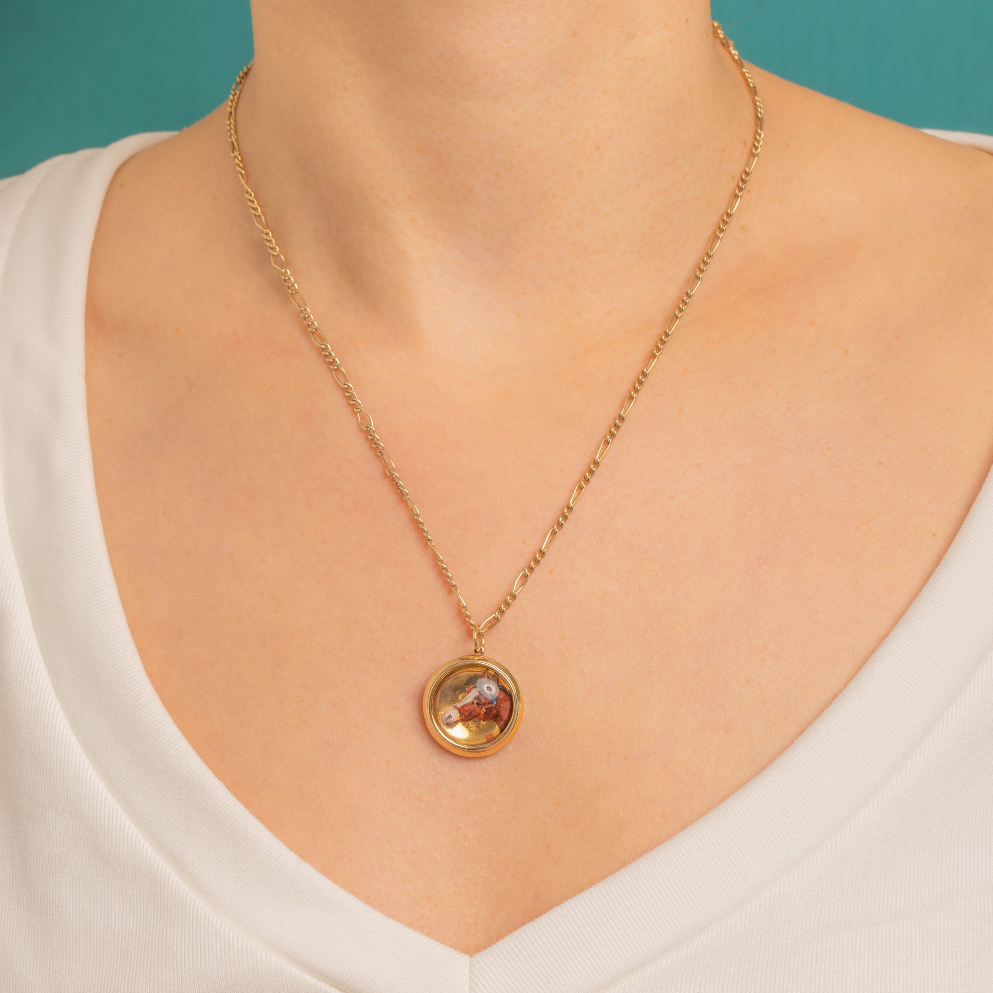 EXCELLENT: The Essex Crystal dome is bright with only light surface scratches and natural age-related abrasions; no chips or cracks observed. The painted equestrian miniature remains crisp with minimal wear, with a small area of age-related softening near the muzzle. The 15ct Gold bezel and jump ring are secure with gentle surface wear; solder at the bail is visible and stable. Overall, well cared for and beautifully preserved.