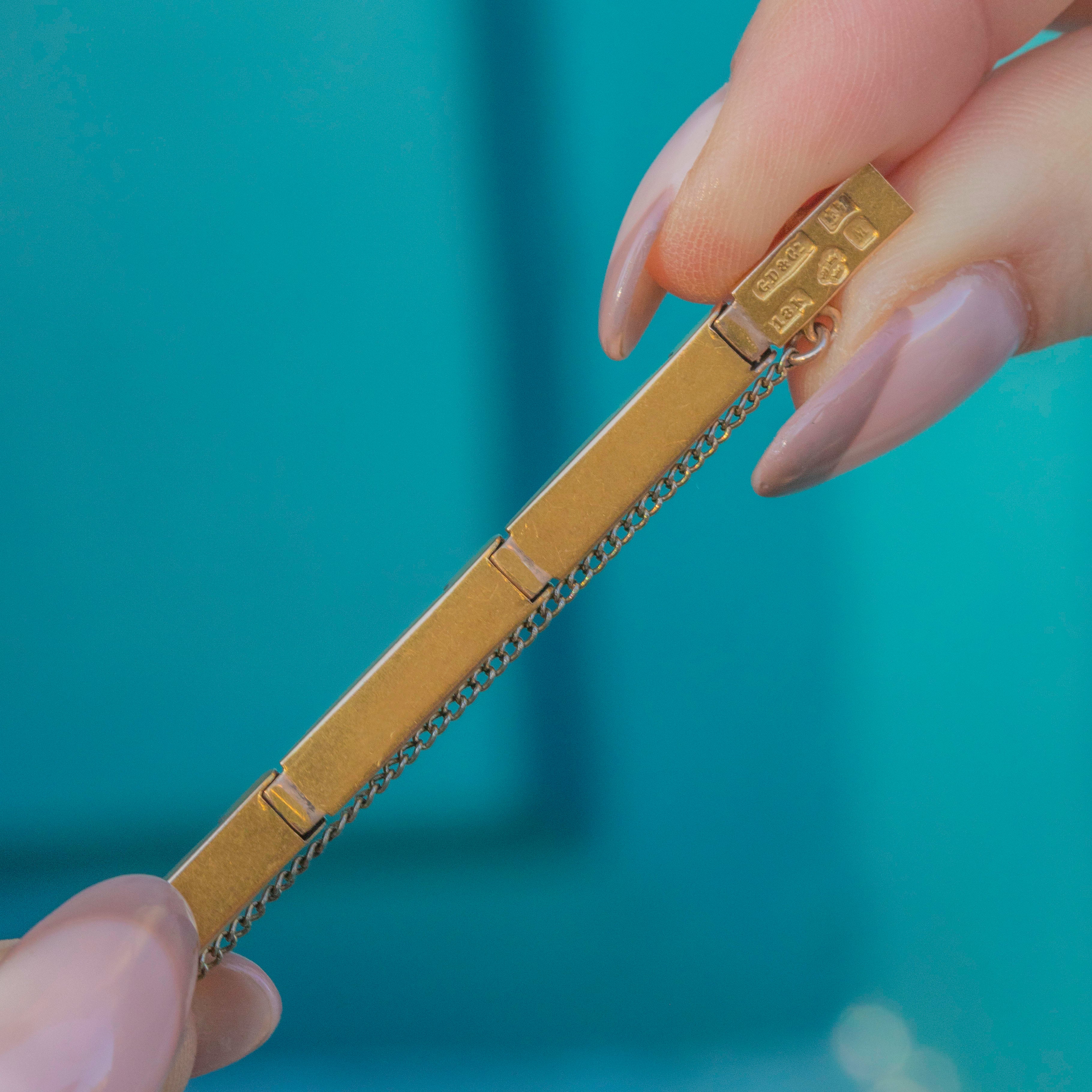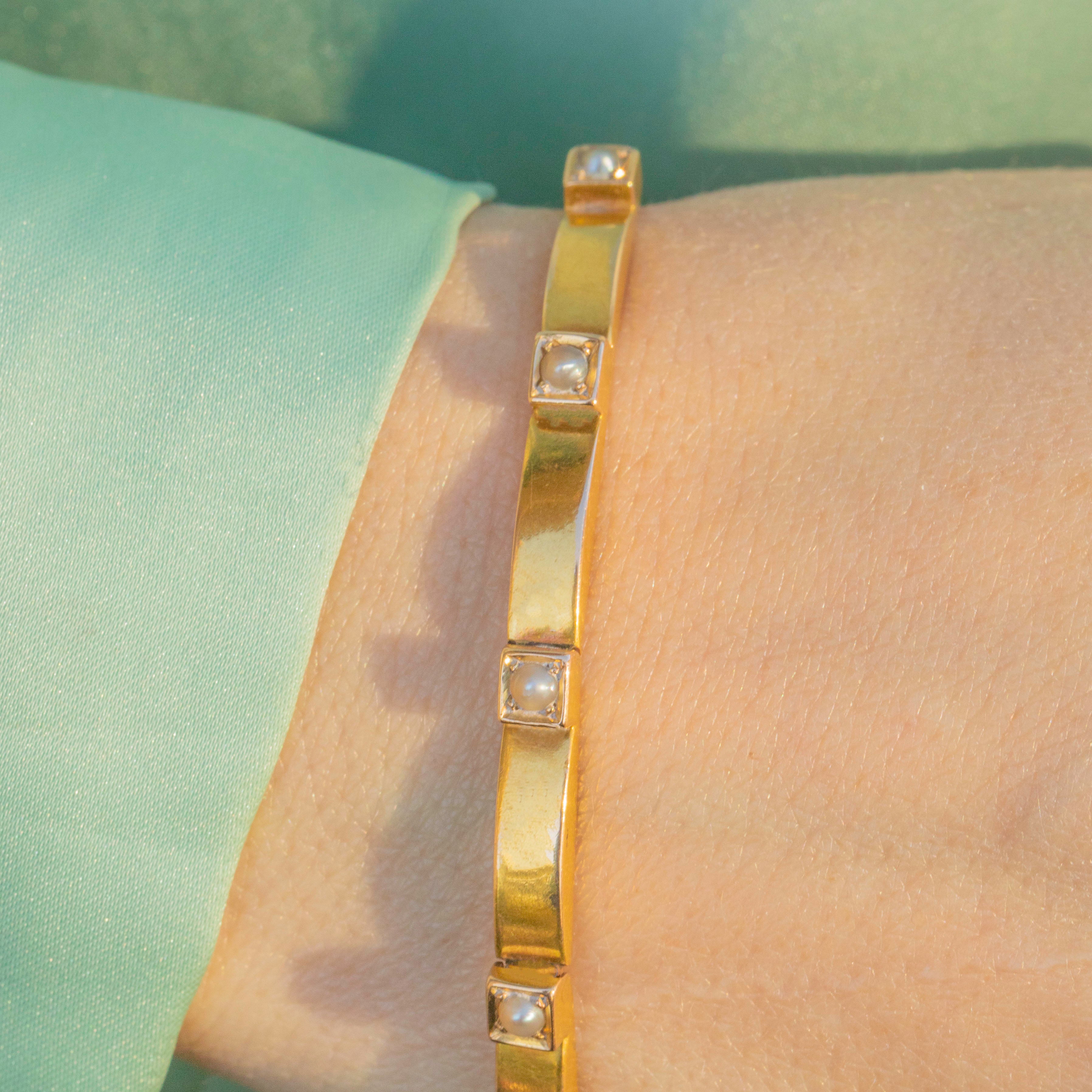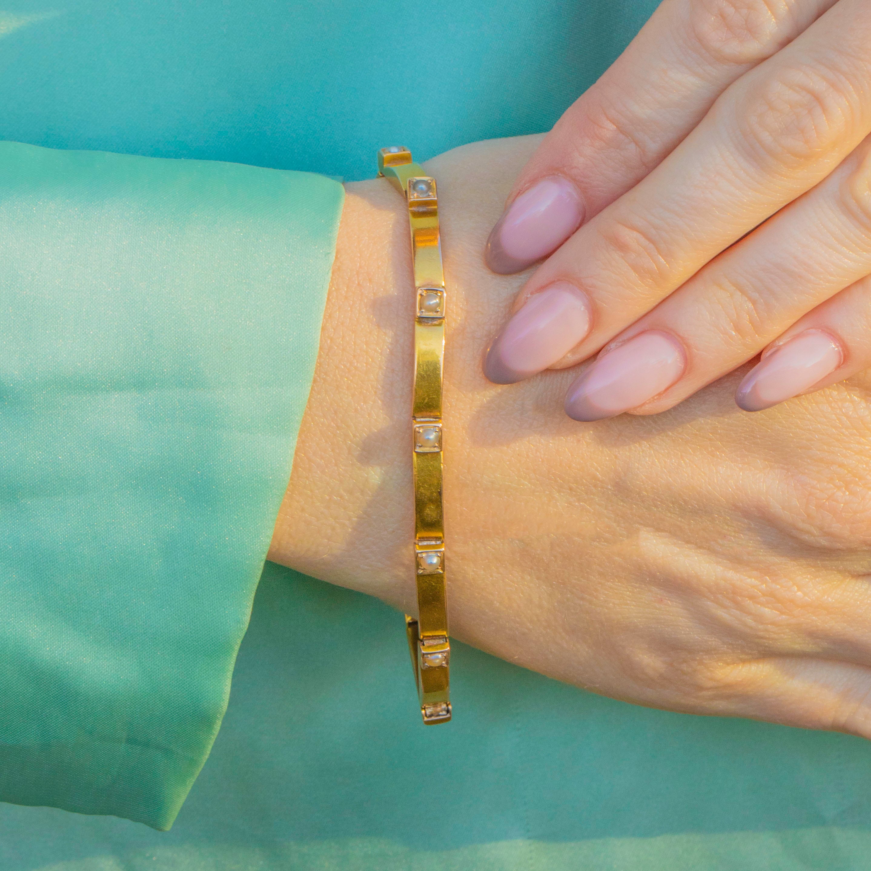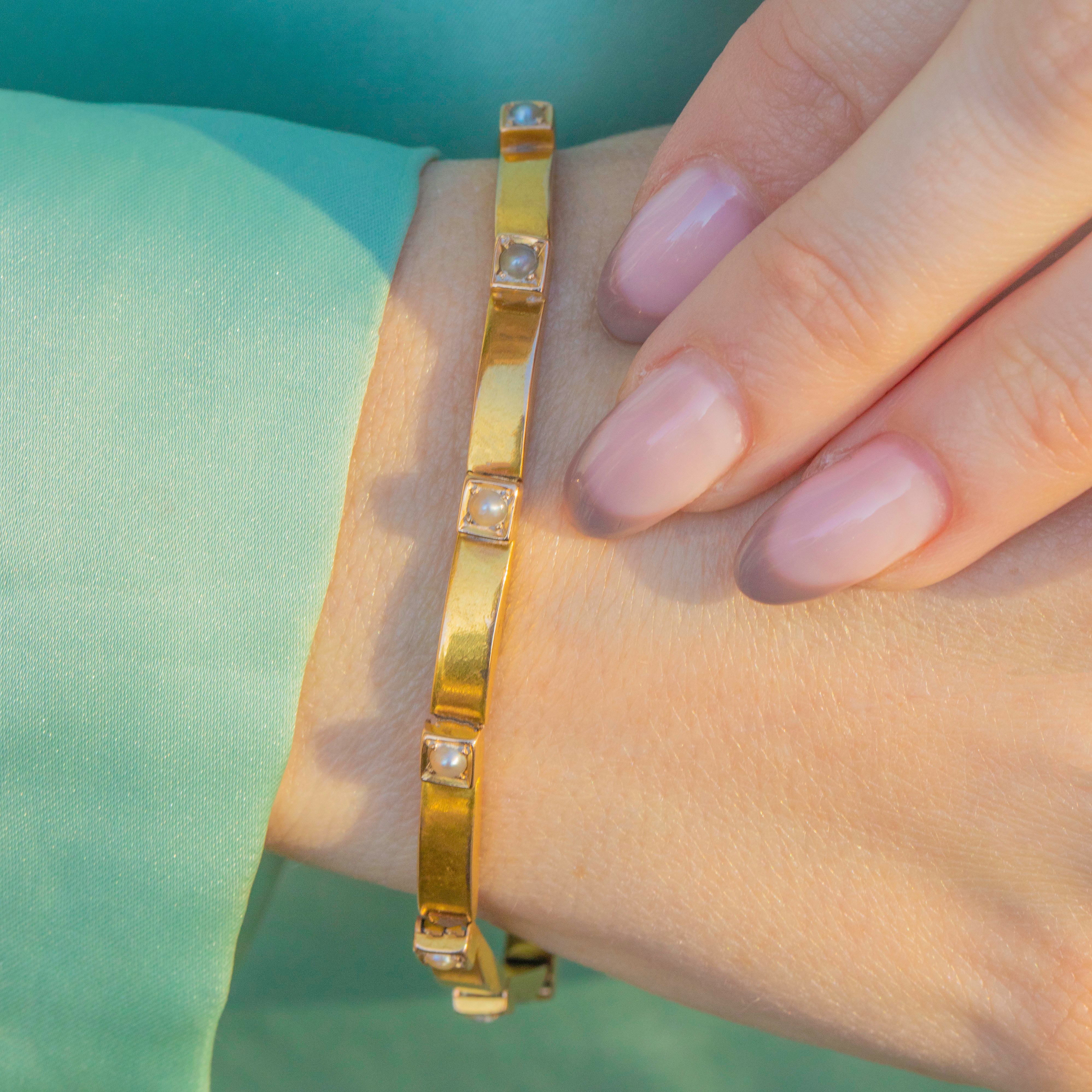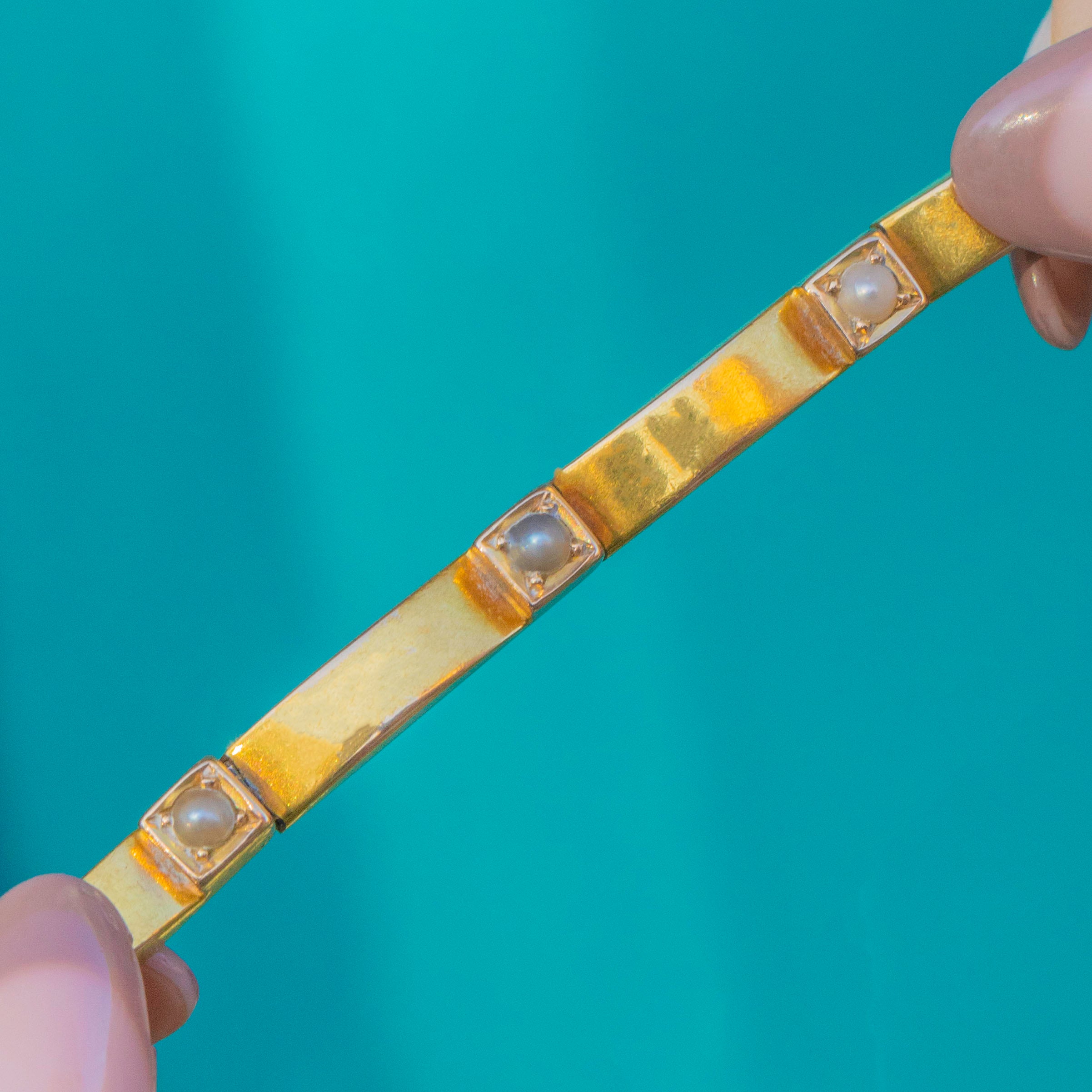 This chic antique 18ct Gold Pearl bracelet captures the elegance of a bygone era with her finely crafted design of alternating Pearls and 18ct Gold bar links. Her 18ct Gold has a luxurious, saturated tone, you could easily see her placed delicately around the wrist of a regal queen.