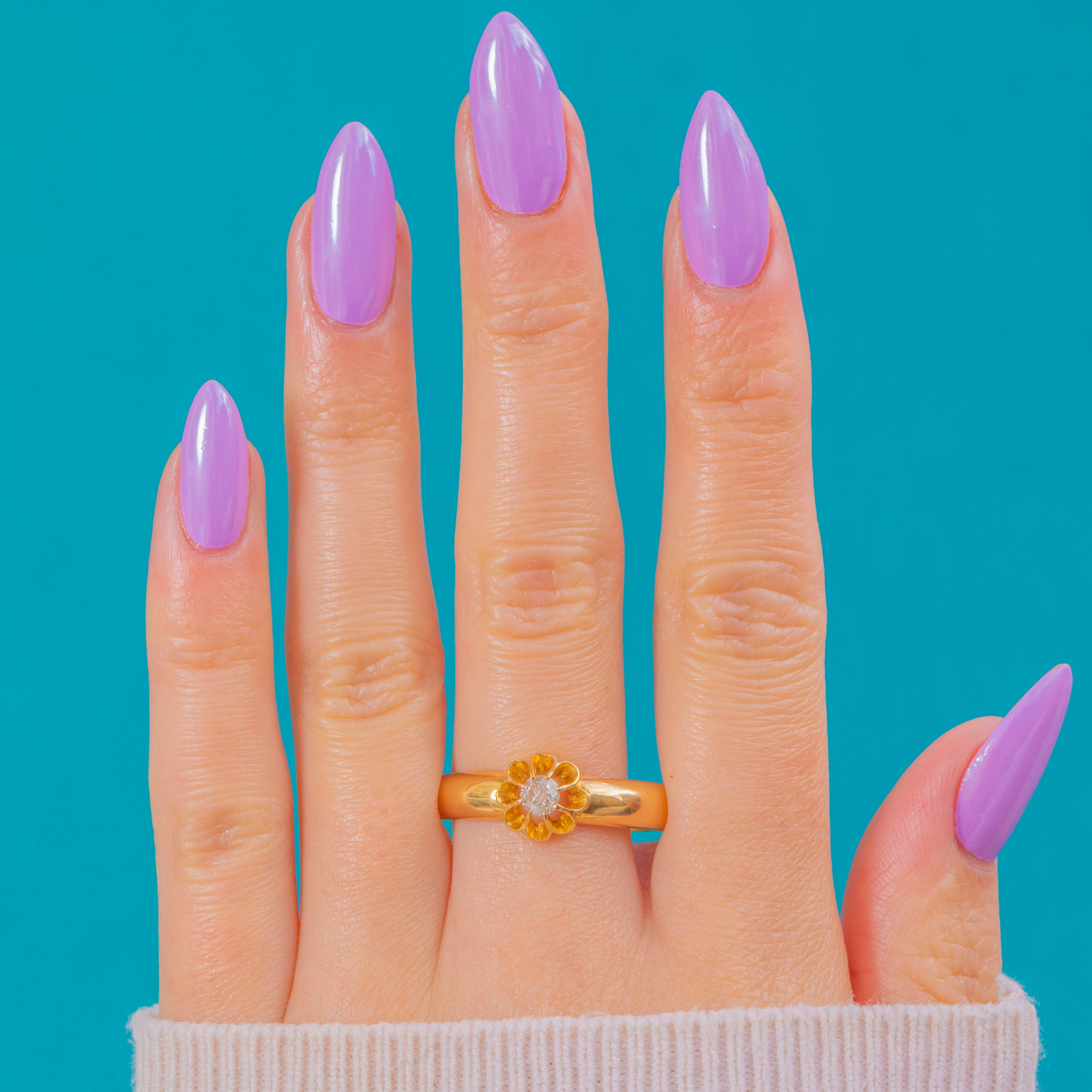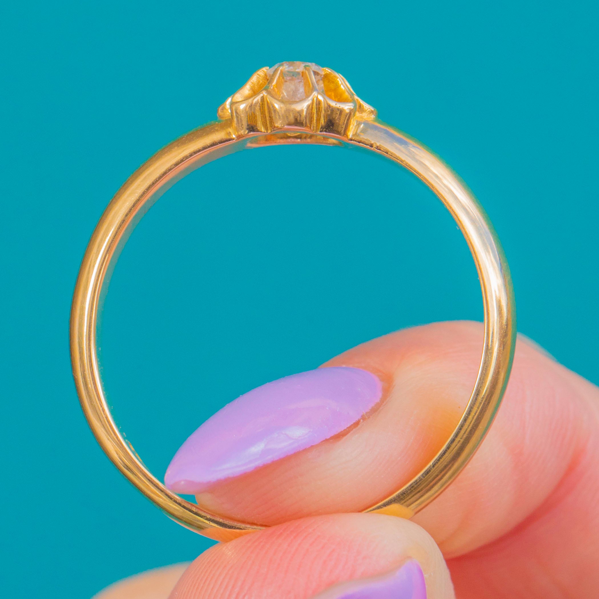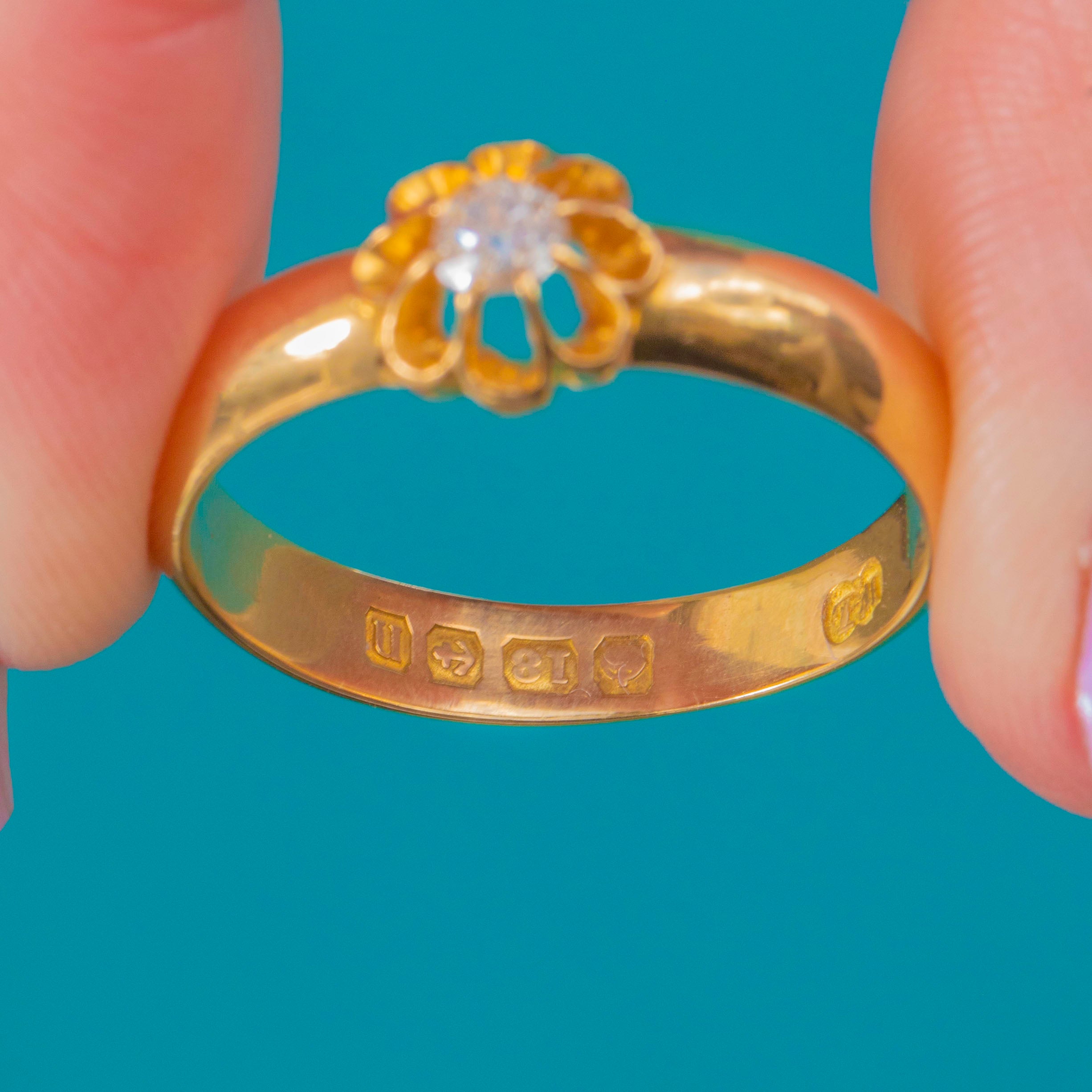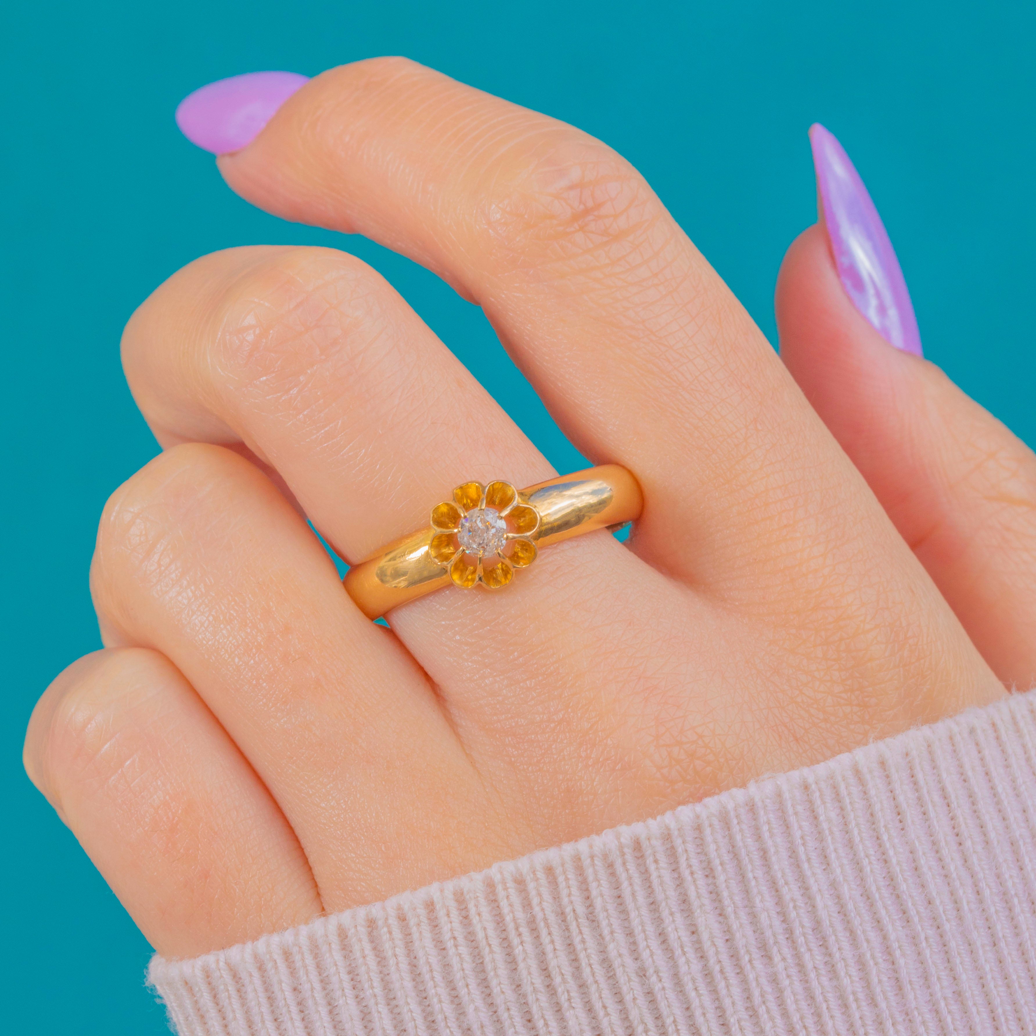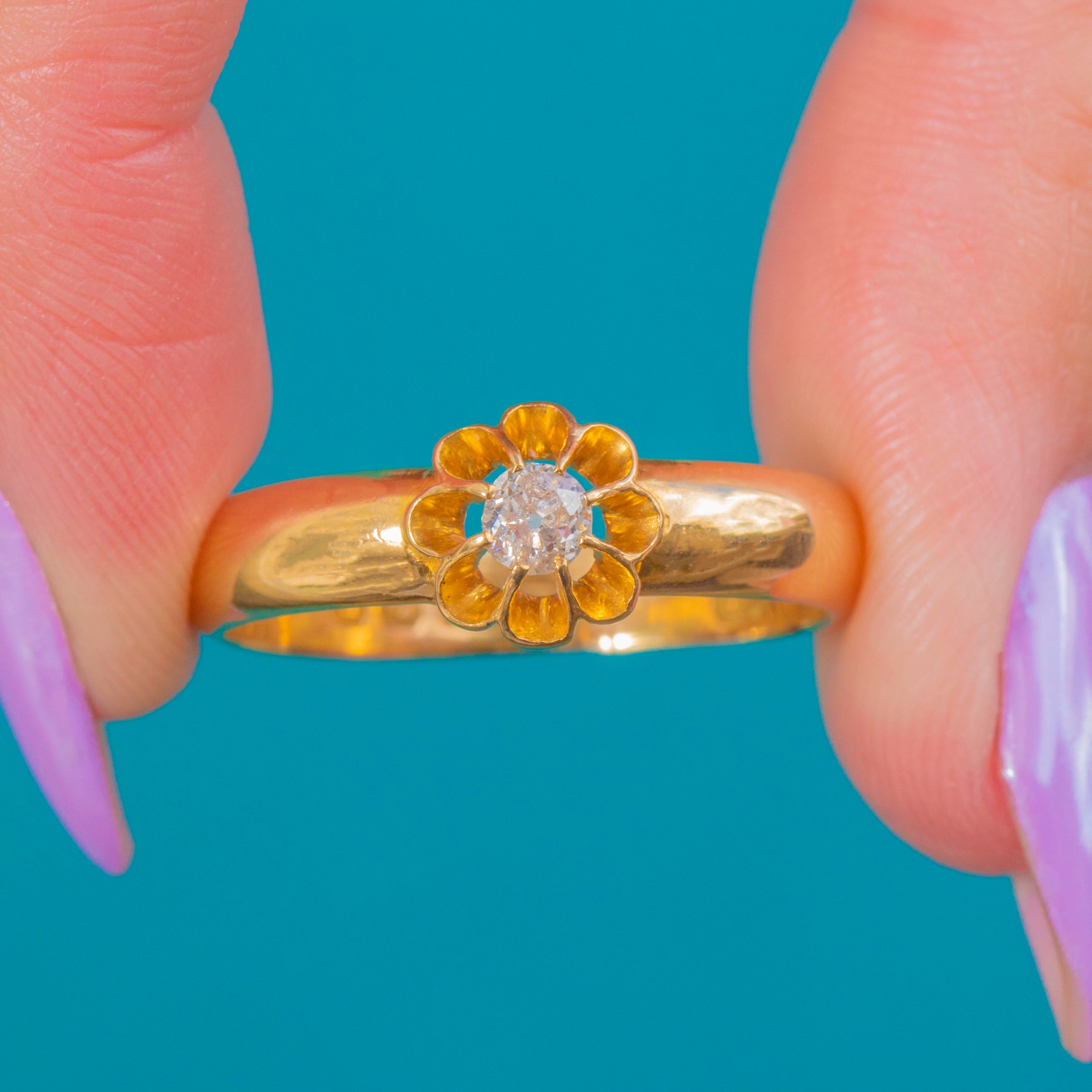 Crafted in rich 18ct Gold, this chunky buttercup belcher ring pairs enduring British craftsmanship with timeless elegance. A softly scalloped buttercup collet cradles an Old Mine cut Diamond, its antique facets lending a subtle, romantic sparkle against the warm glow of Gold.