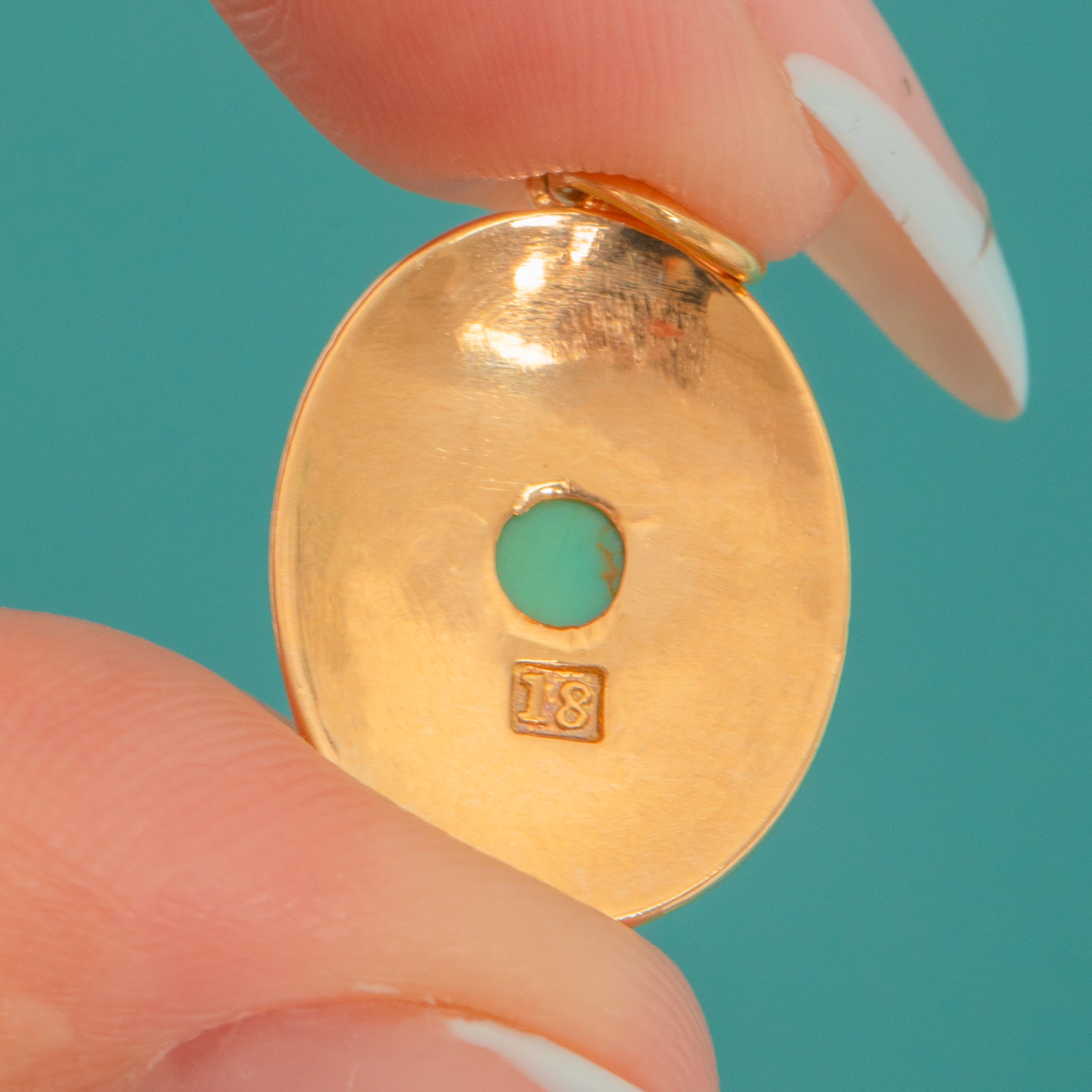 VERY GOOD: The Turquoise cabochon is smooth with the surface intact and securely set. The Gold retains a bright, glossy polish with light hairline scuffs and a minute edge ding visible under close inspection. The soldered hasp and jump ring are sound, with no visible repairs or alterations.