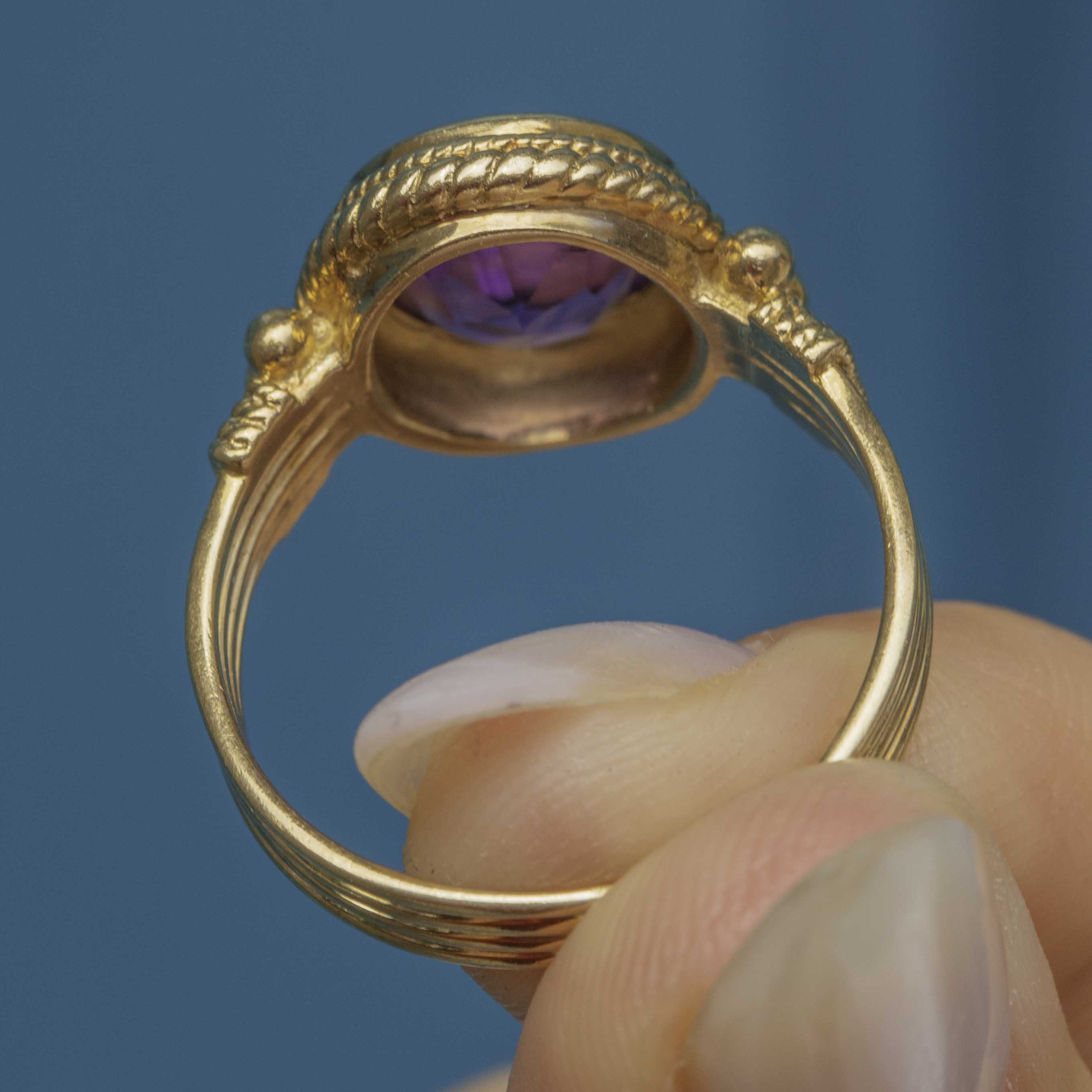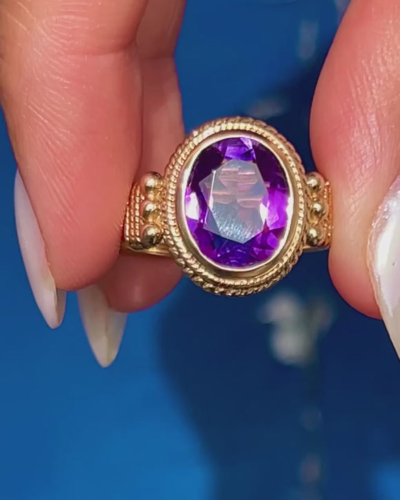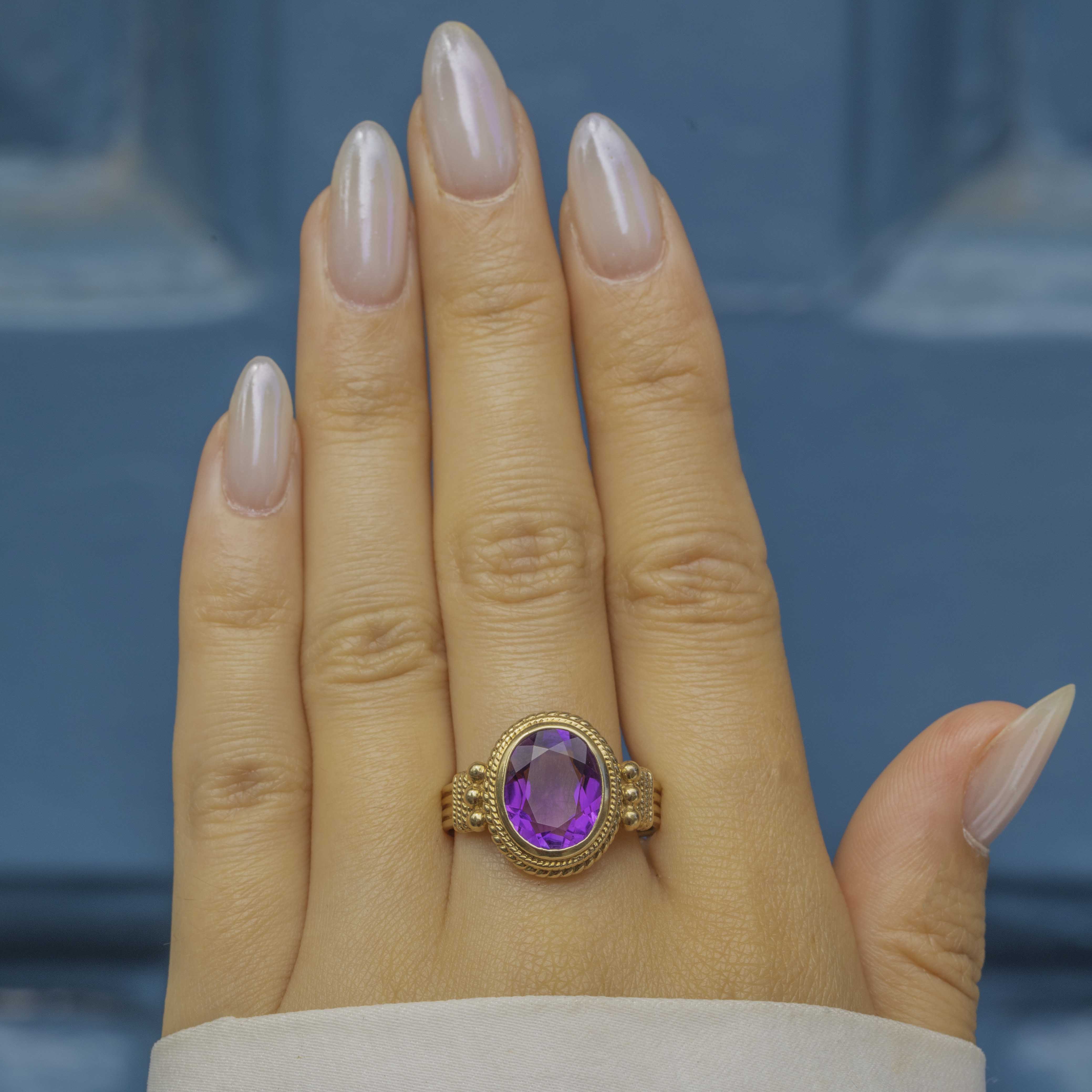 The gemstone is set in a glossy 9ct Gold bezel, haloed by textured rope details and beaded edges, and rests on a chunky band which provides ample finger coverage. Complete with a full set of English hallmarks, this Amethyst ring radiates vintage allure!