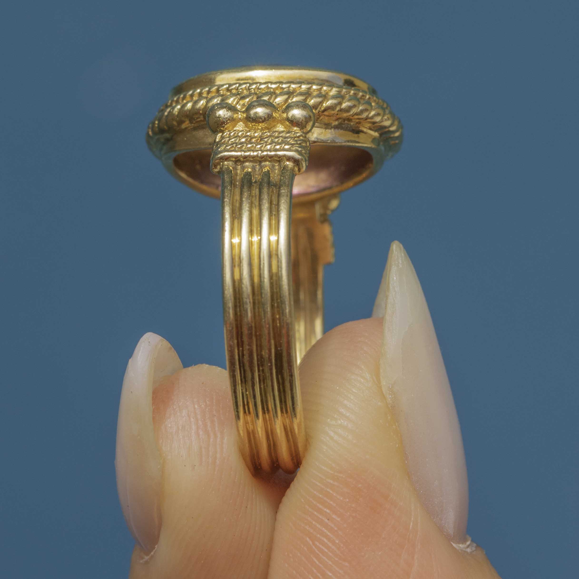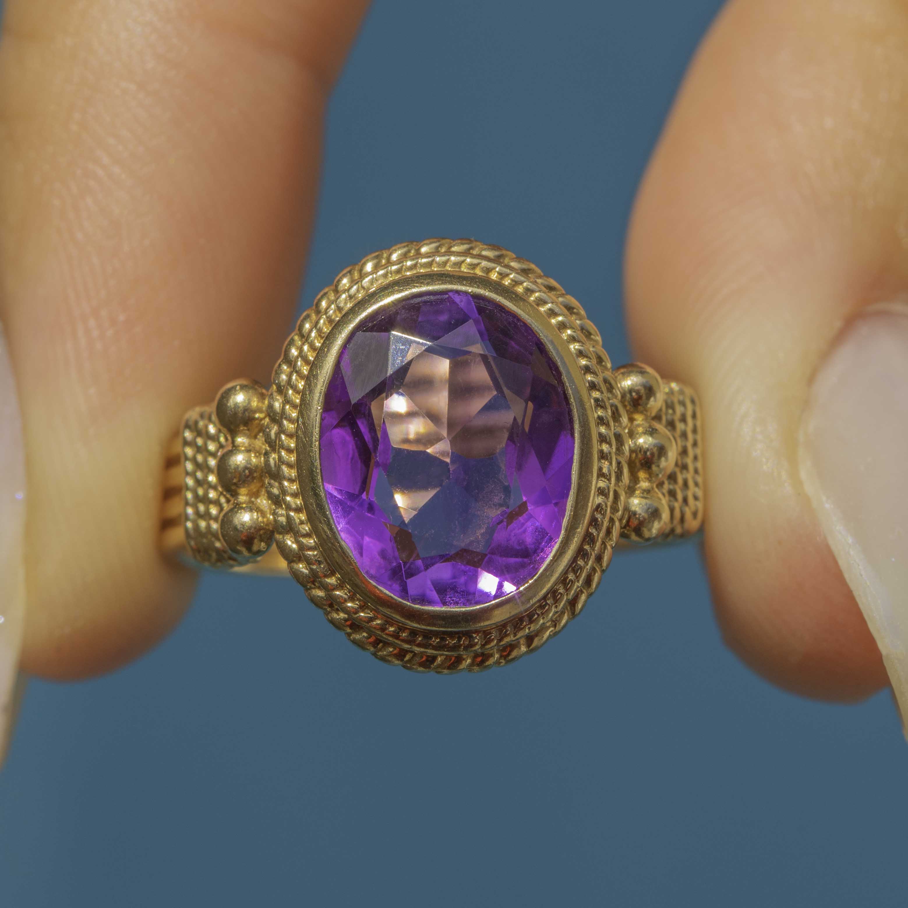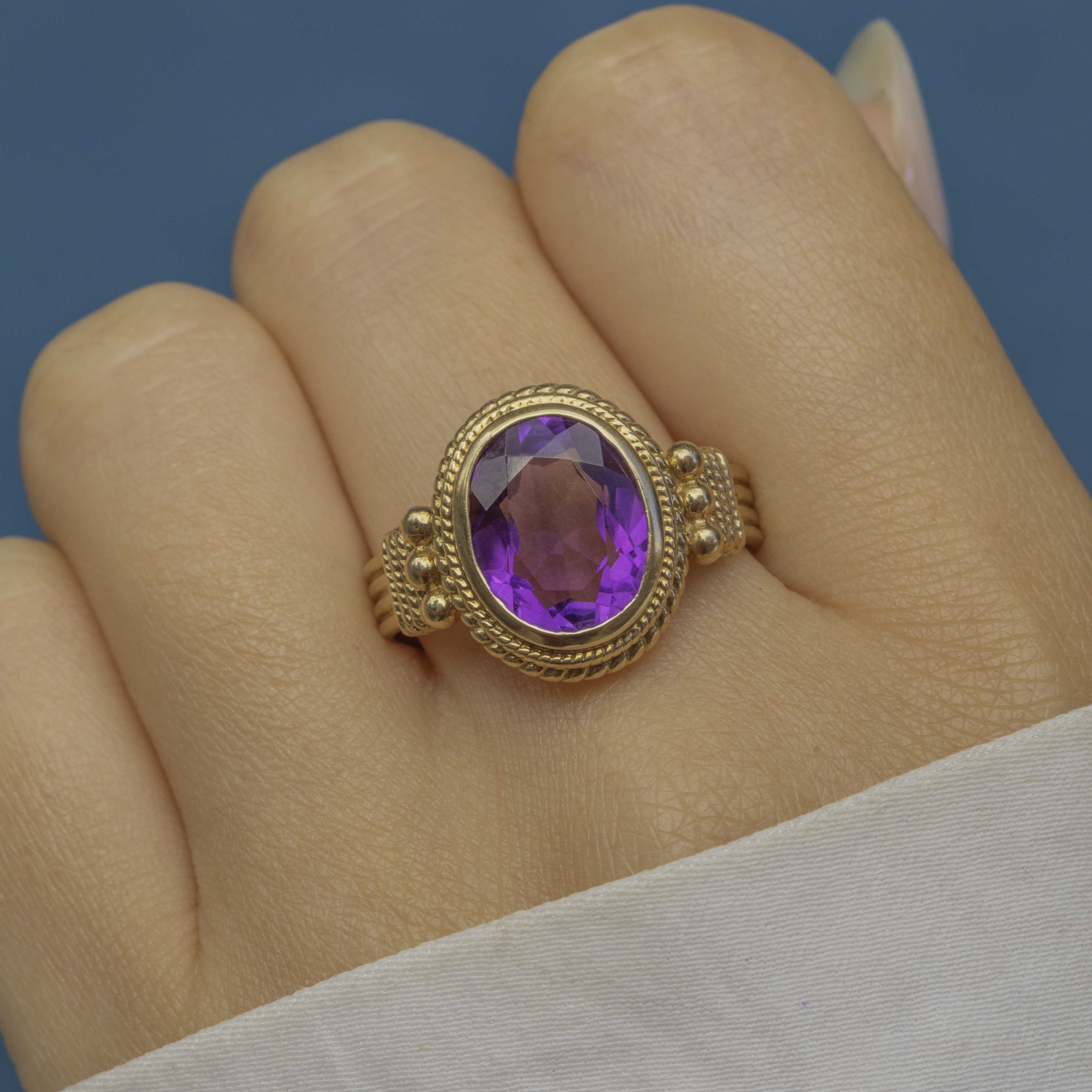 The gemstone is set in a glossy 9ct Gold bezel, haloed by textured rope details and beaded edges, and rests on a chunky band which provides ample finger coverage. Complete with a full set of English hallmarks, this Amethyst ring radiates vintage allure!
