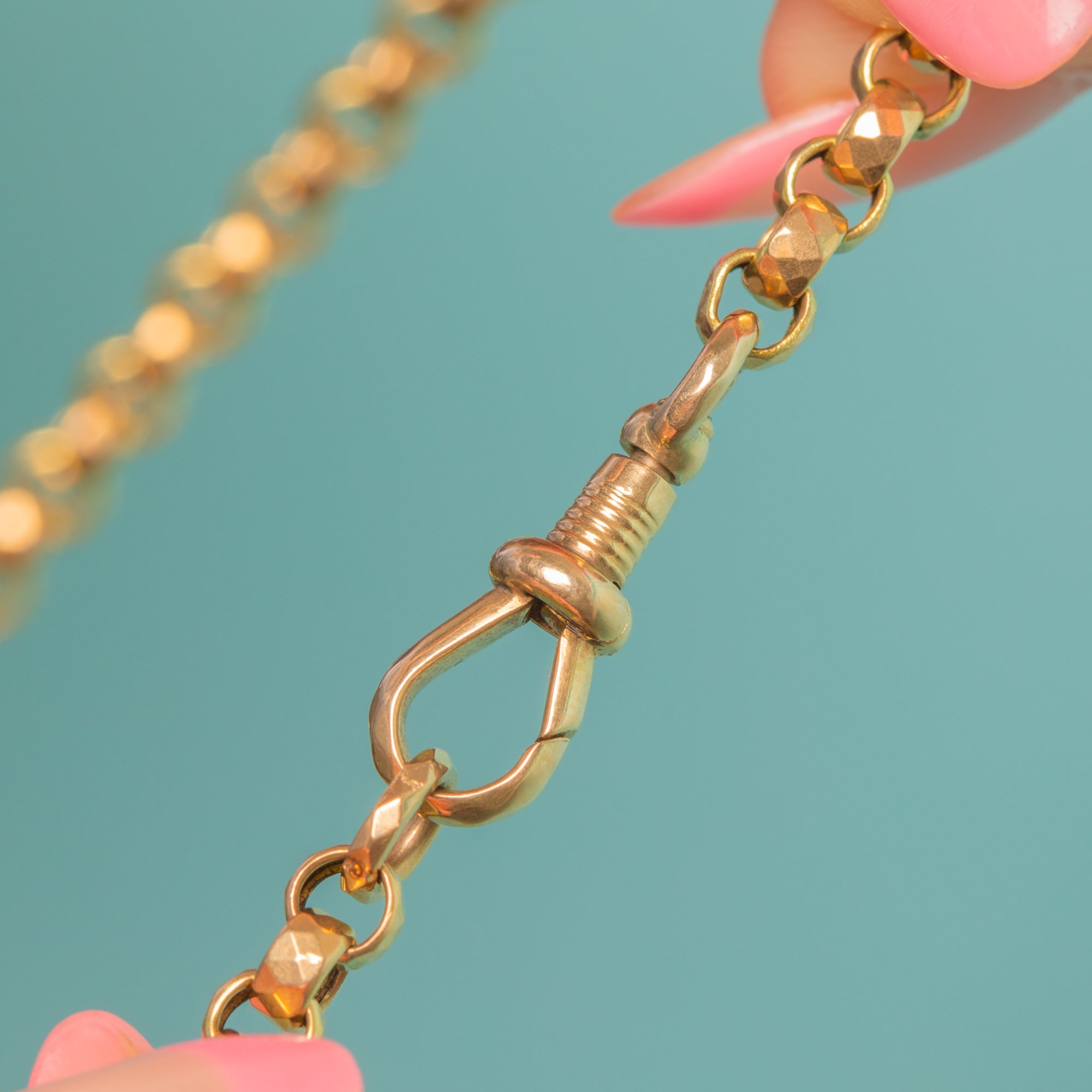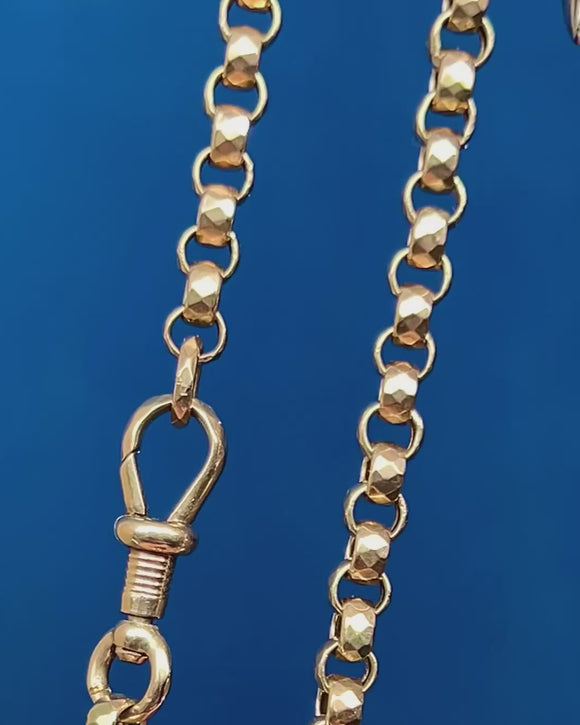 VERY GOOD-EXCELLENT: This 9ct Gold Victorian chunky belcher chain is in great condition. The faceted links are uniform and secure, with only mild wear, commensurate with age. With her dog-clip in perfect working order, allowing you to wear it with utmost confidence!