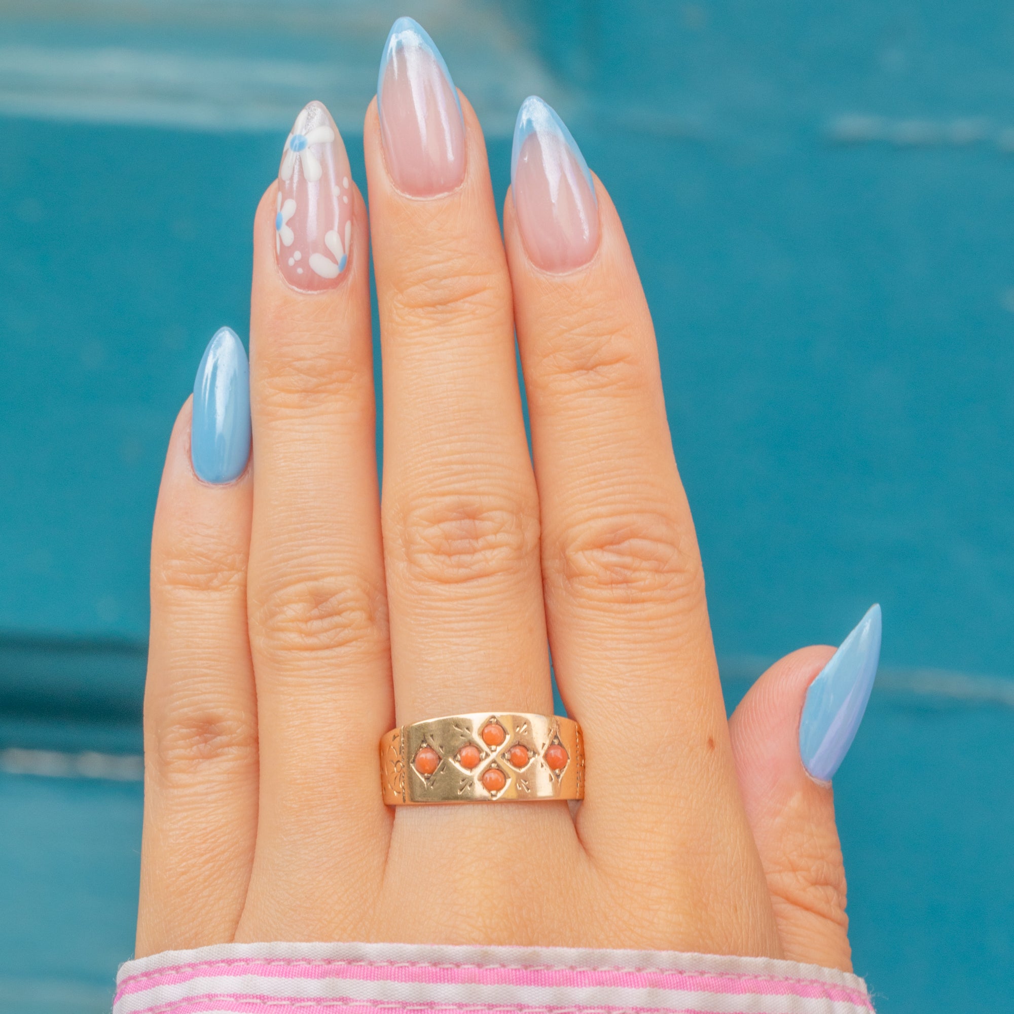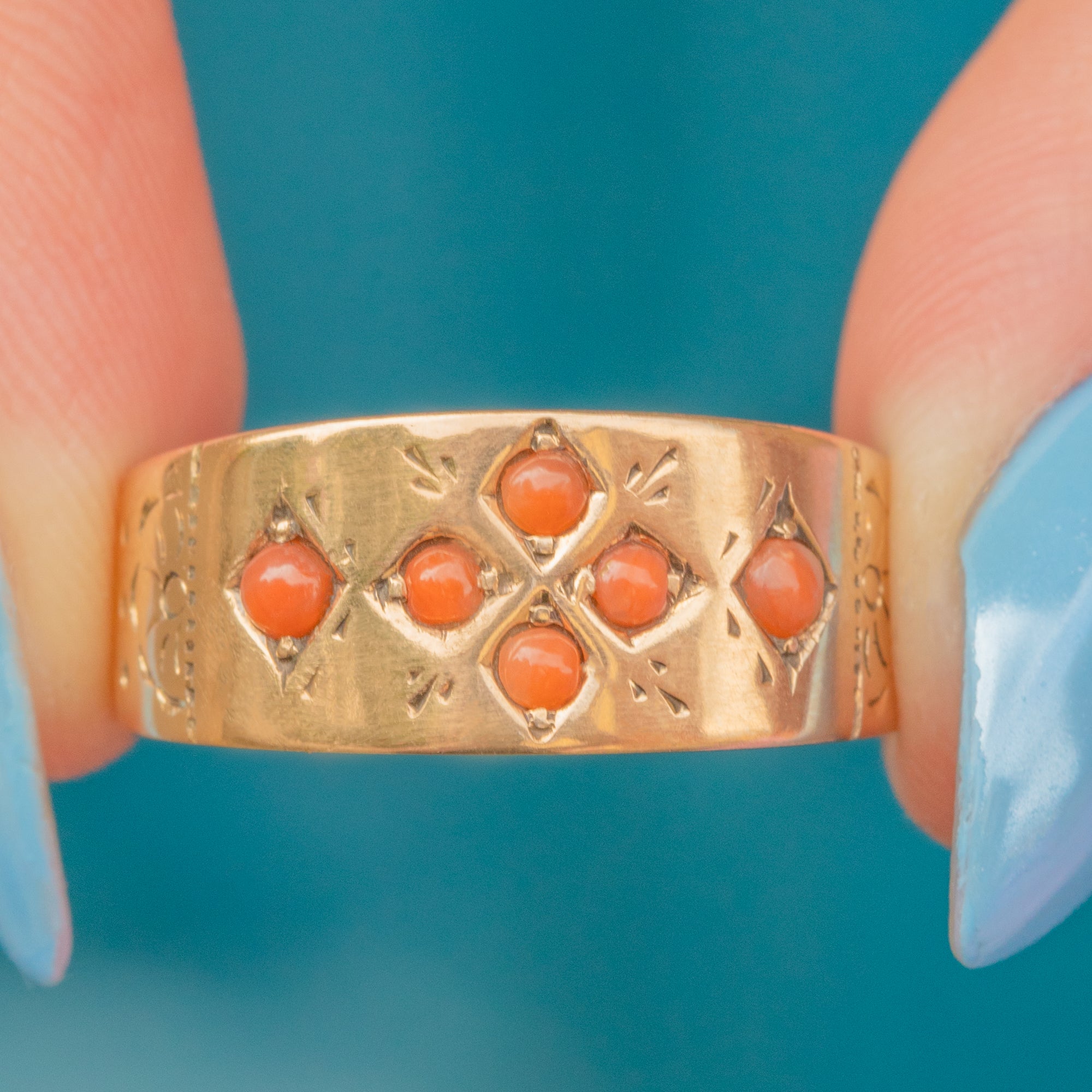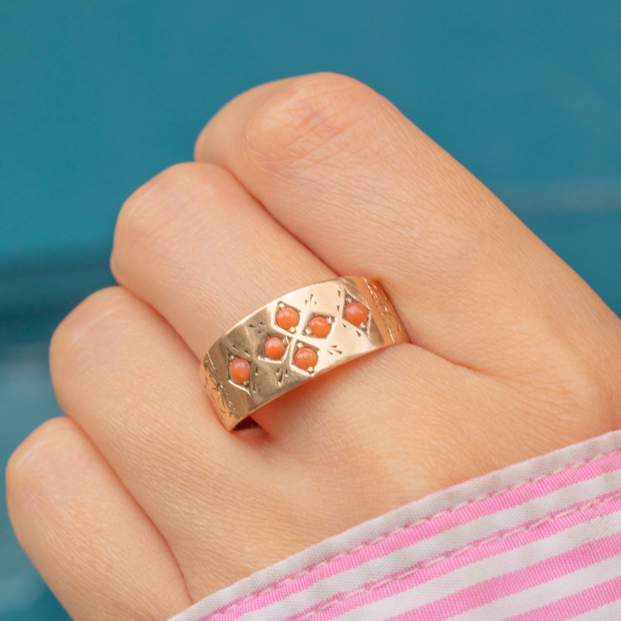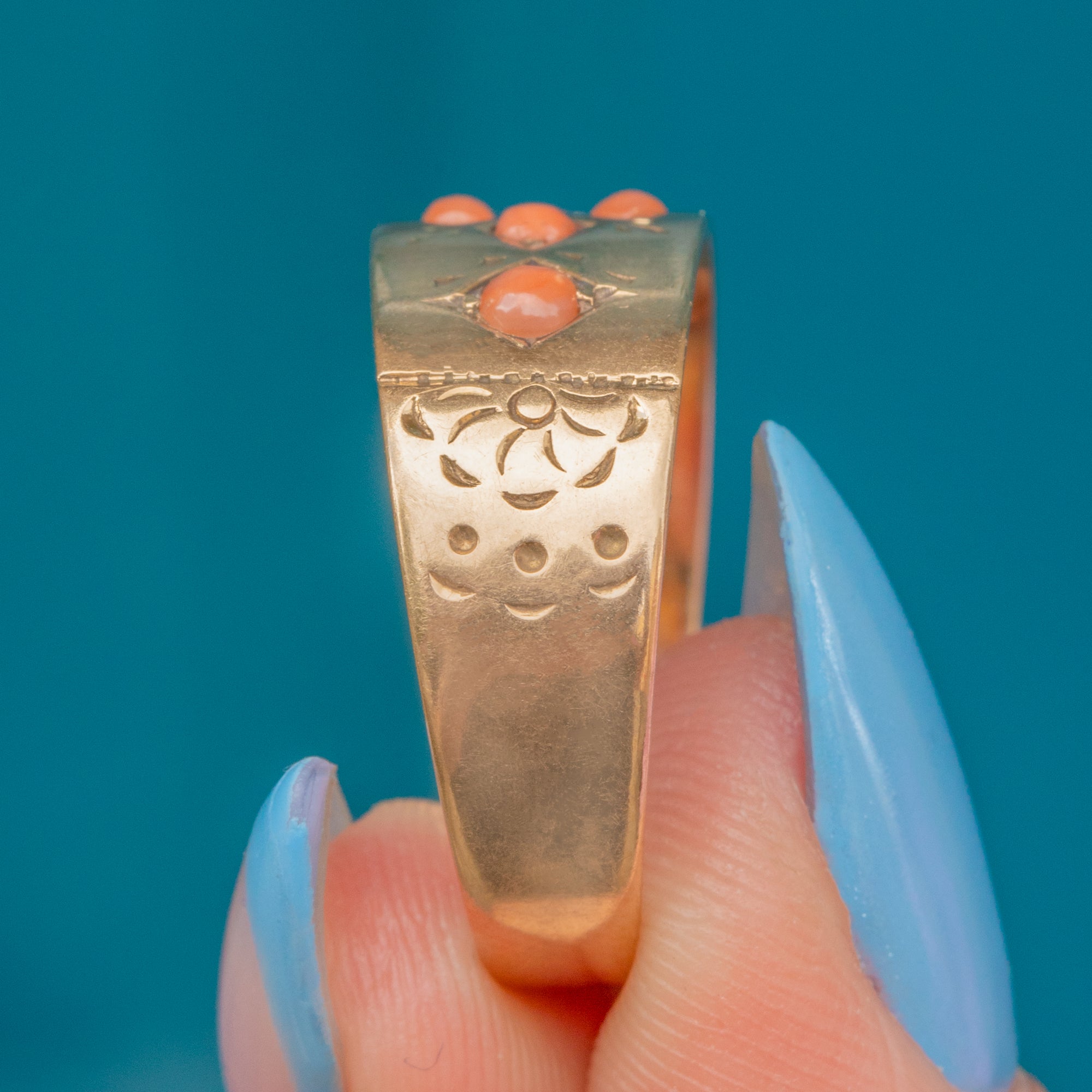 This Victorian gypsy ring is a gorgeous chunky piece, displaying six vibrant Coral stones adorned by intricately engraved details.