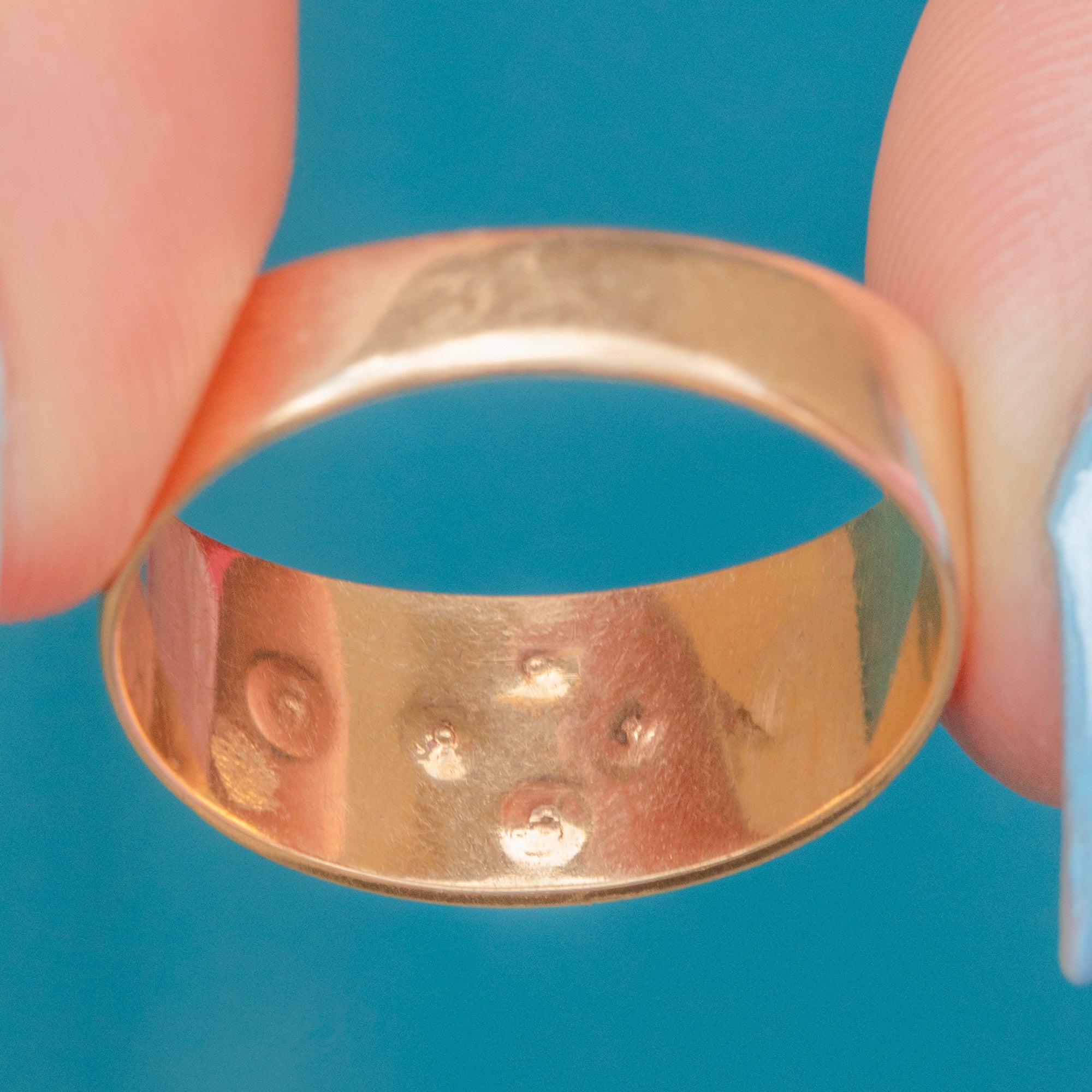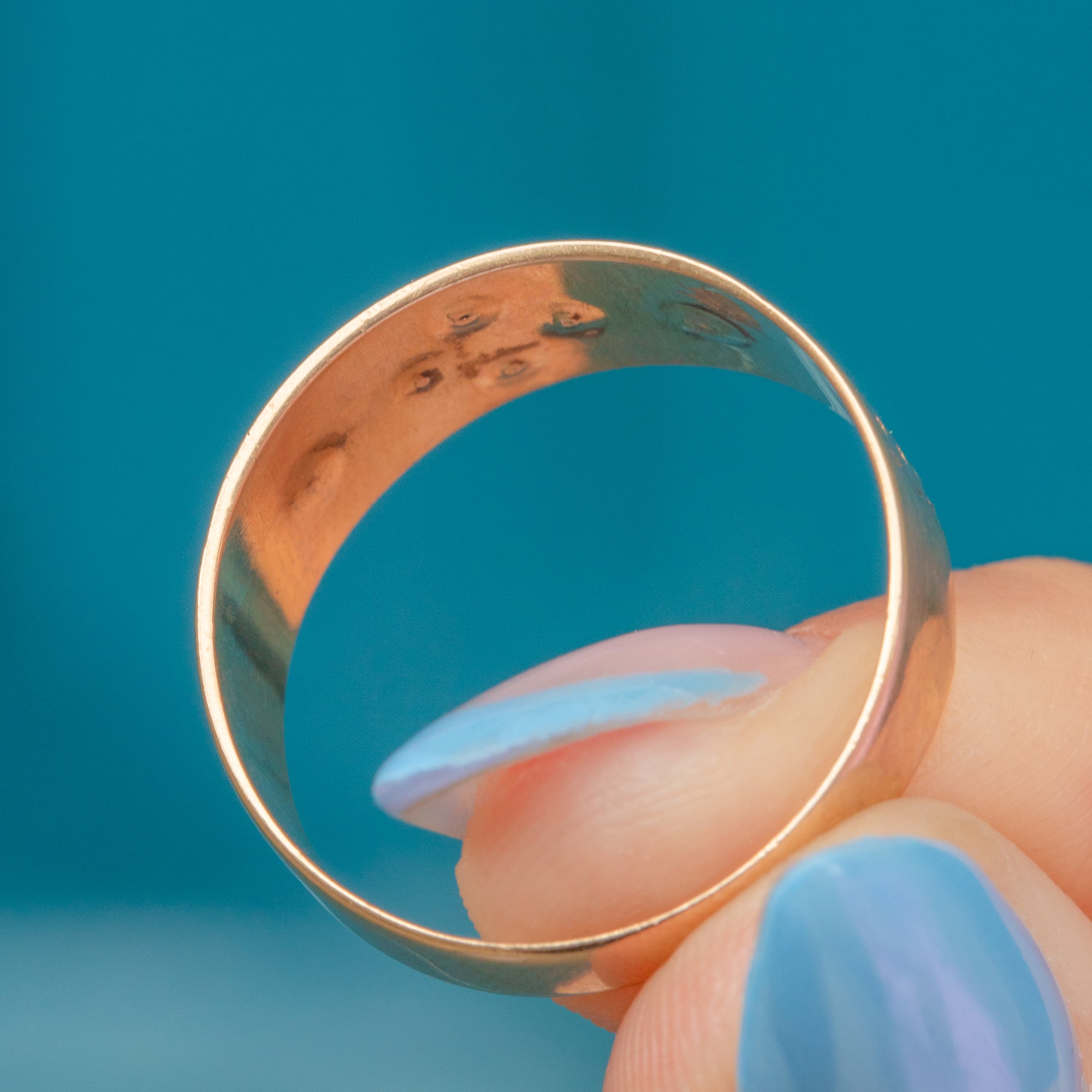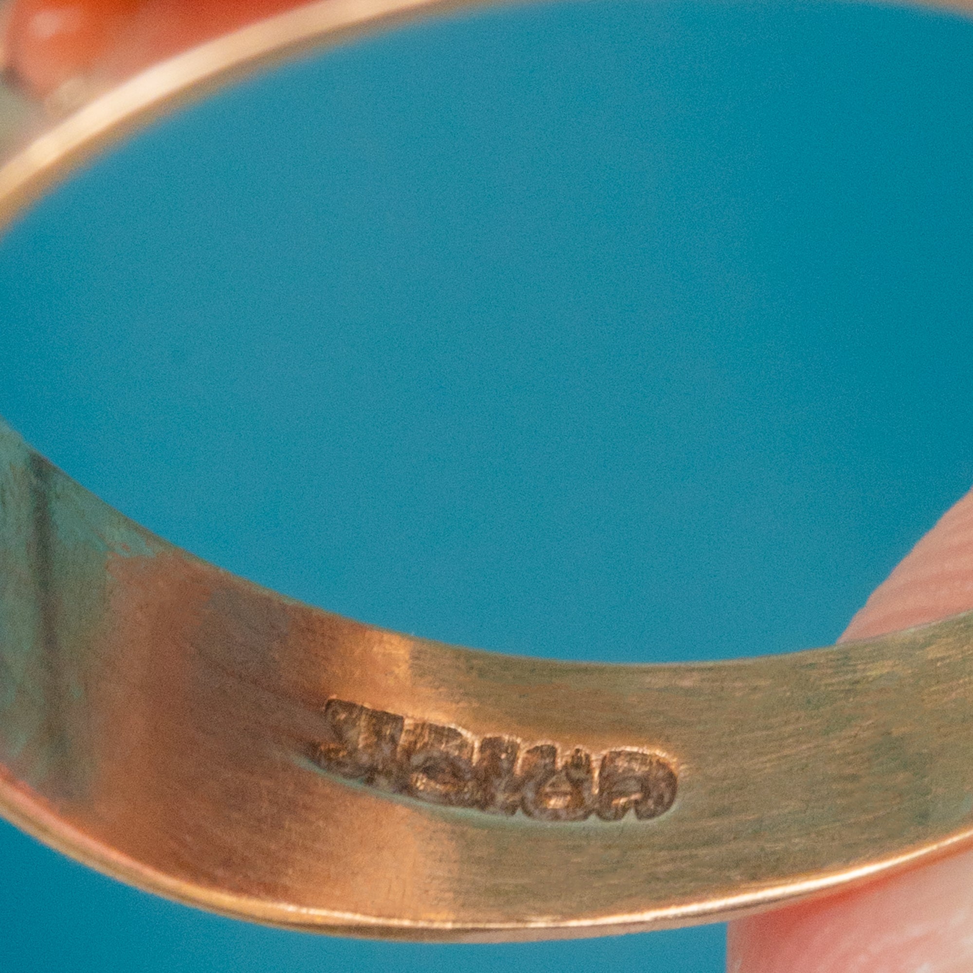 EXCELLENT: The Gold is bright and has retained a wonderful sheen, with its engravings having remained crisp over time. Each Coral is vibrant and set securely within its settings. With little else to note, this chunky gypsy ring can be worn with confidence and comfortability.