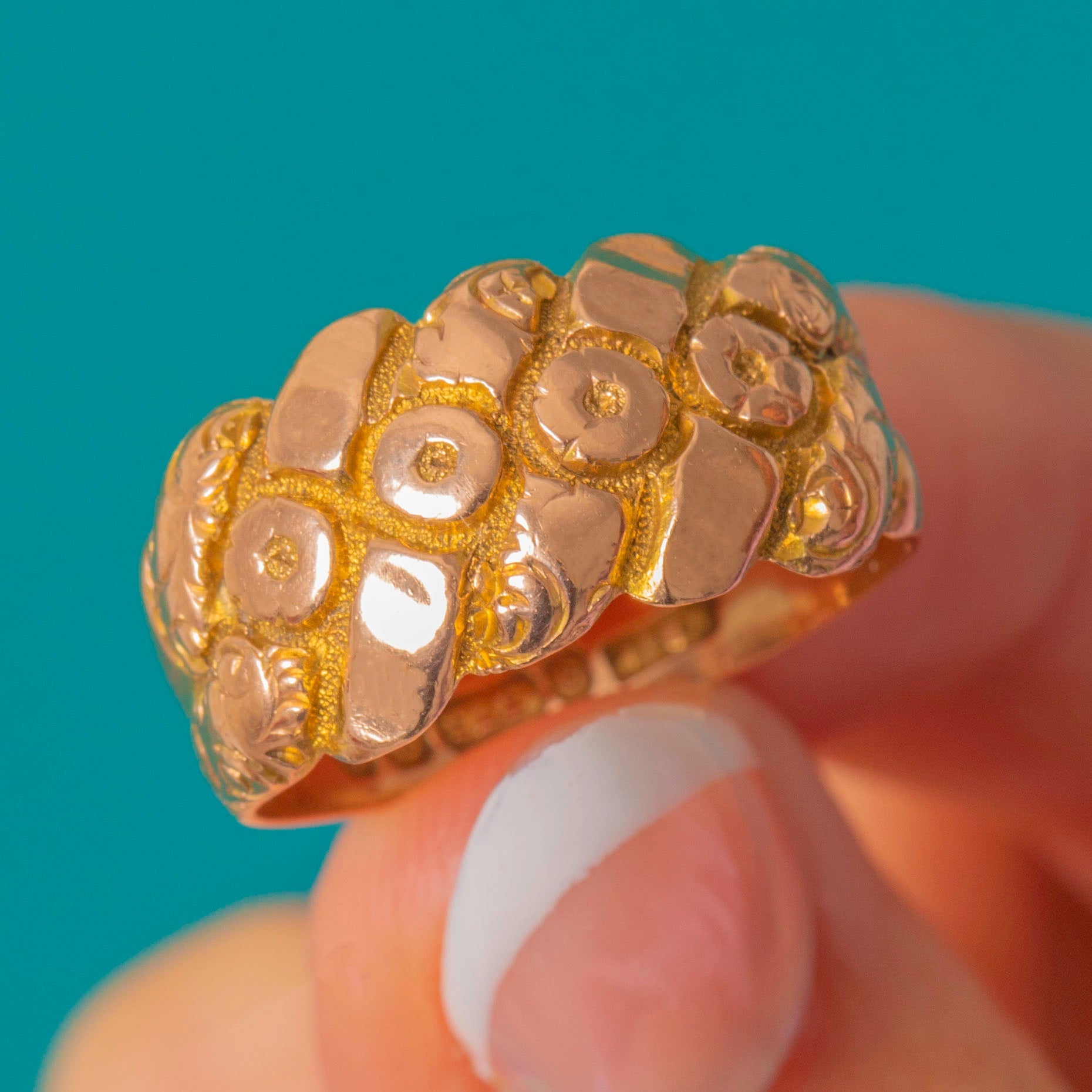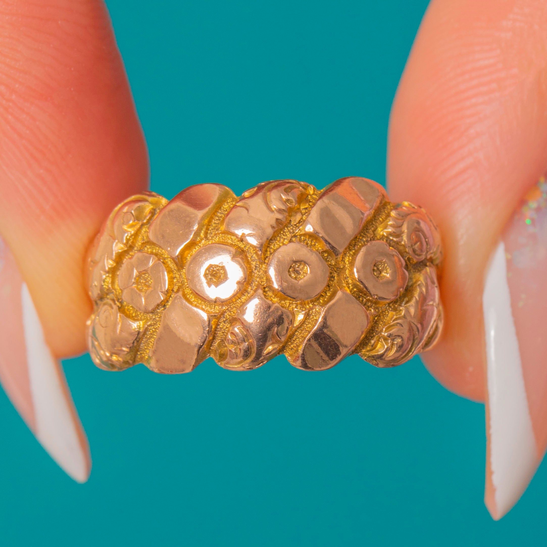 Crafted from 5 grams of solid Gold, this chunky antique ring displays beautiful floral detailing across its front, providing a wonderful texture.