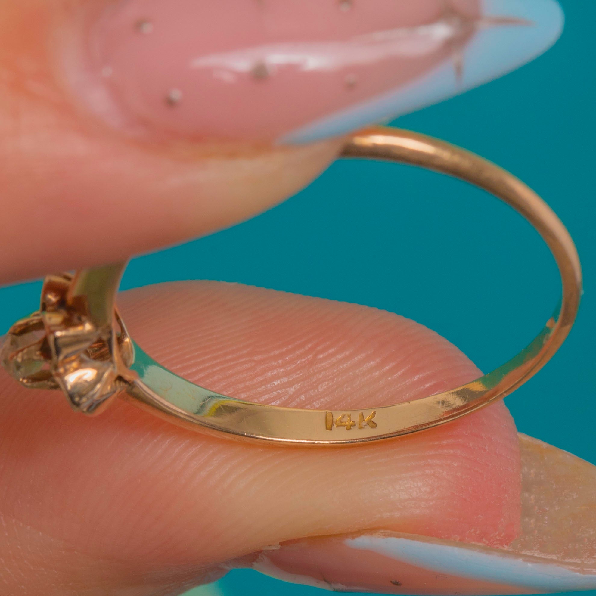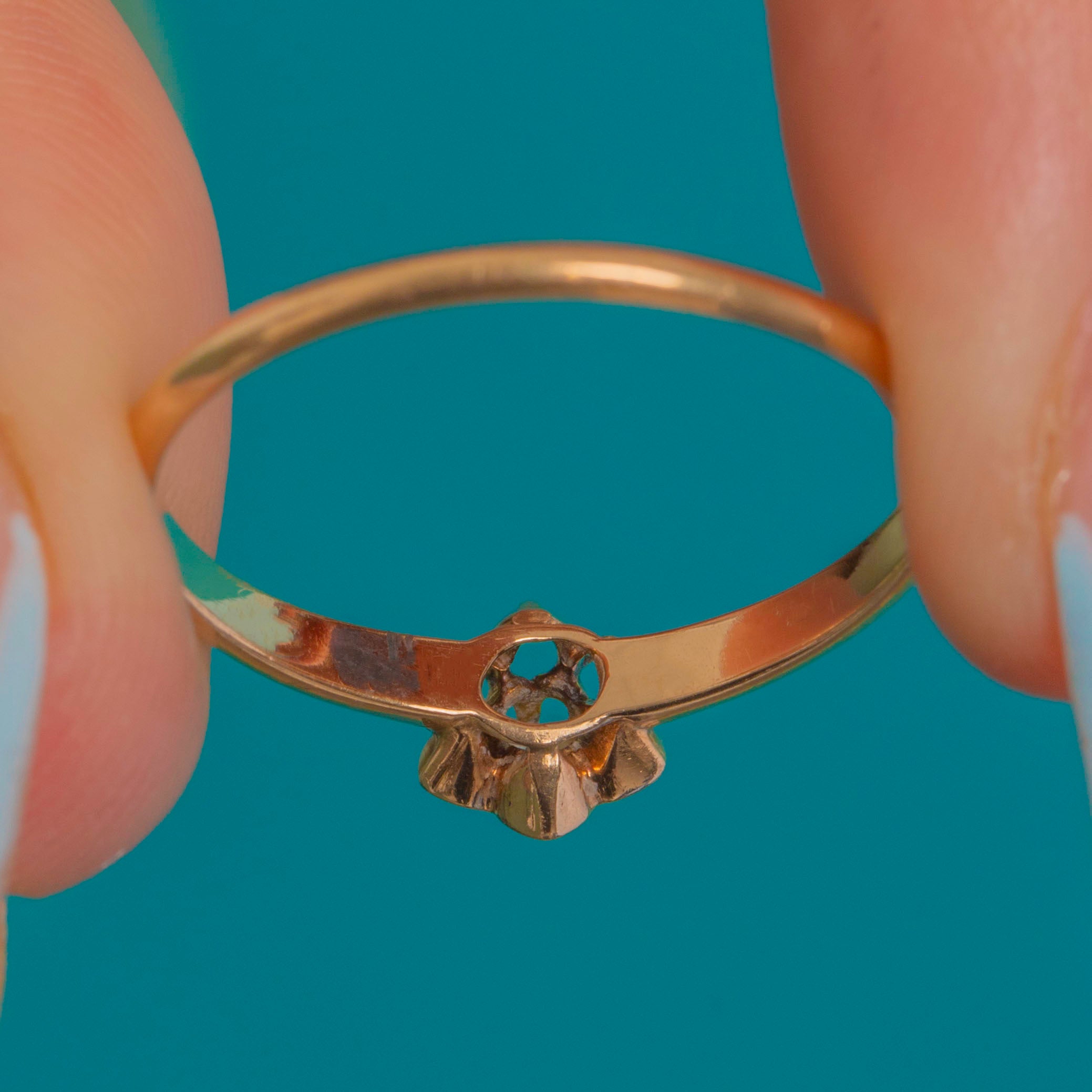 MATERIALS: Tests as 14ct Gold, Old Mine Cut Diamond (0.06ct).