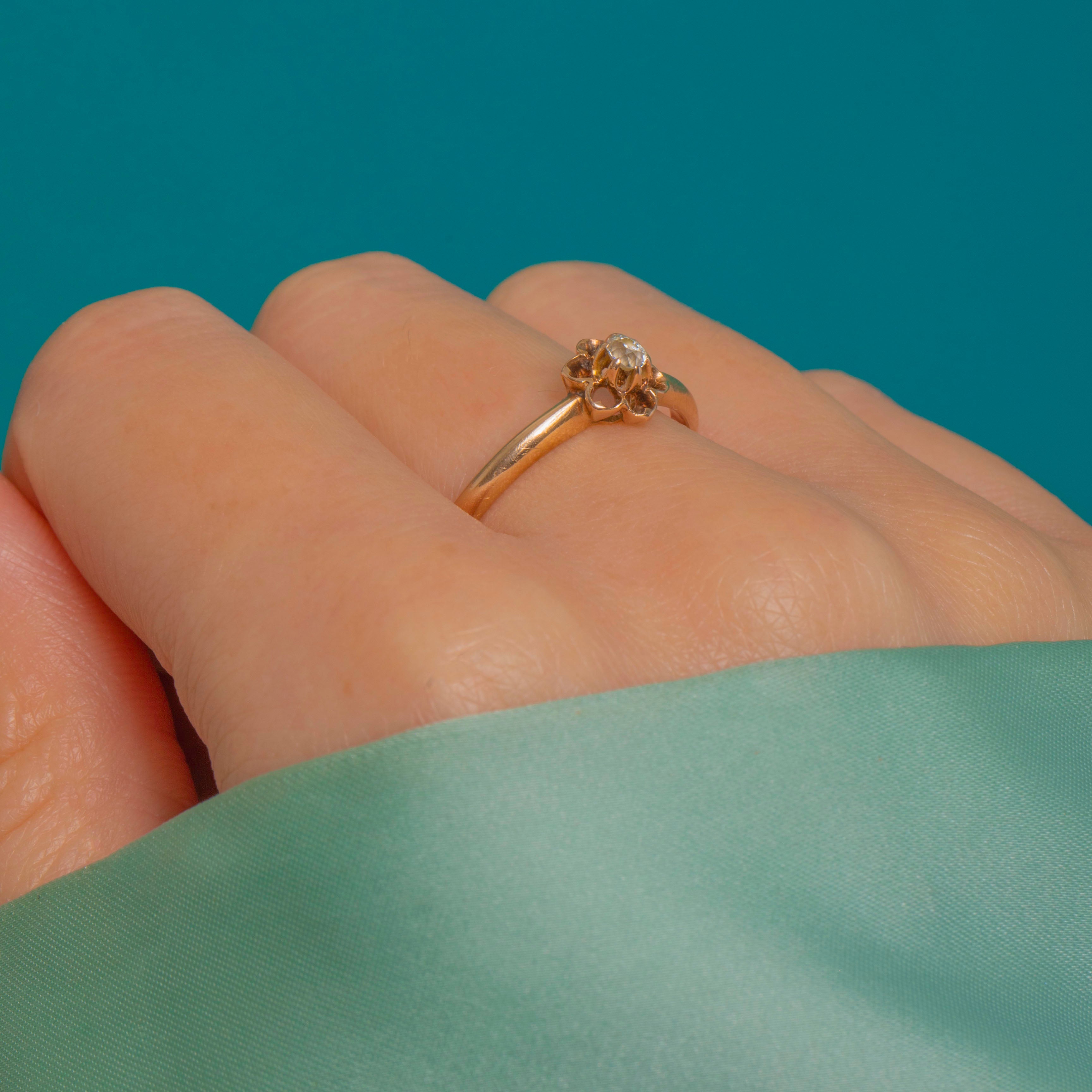 A dainty delight with timeless charm, this Art Deco flower ring blooms in 14ct Gold with a sparkling Old Mine Cut Diamond at its heart. The scalloped buttercup setting cradles the stone beautifully, its cupped “petals” creating a softly romantic silhouette with a low, easy-to-wear profile.