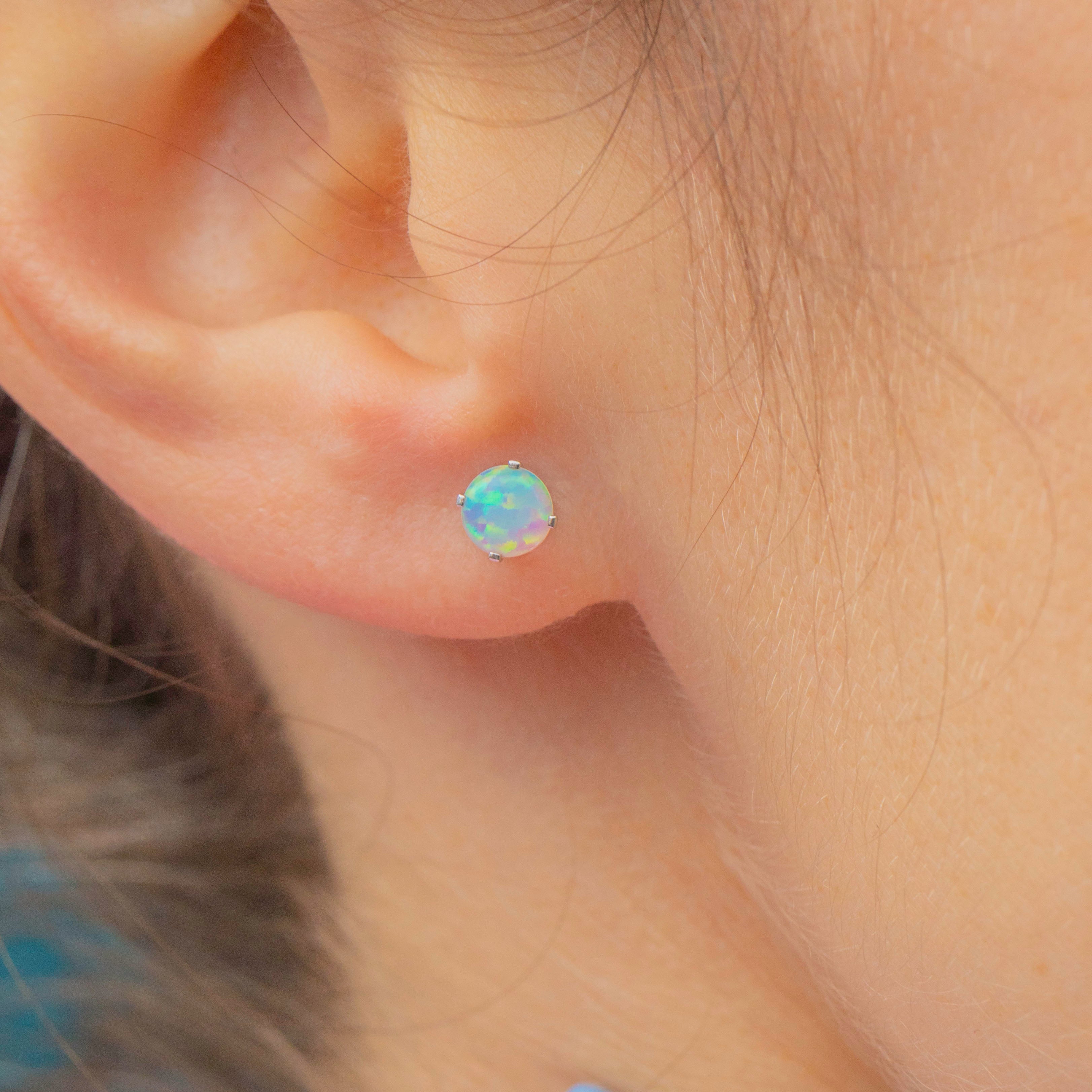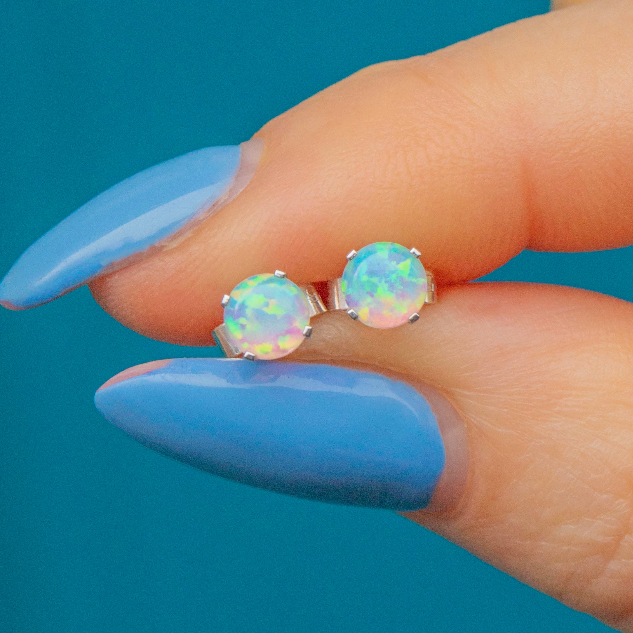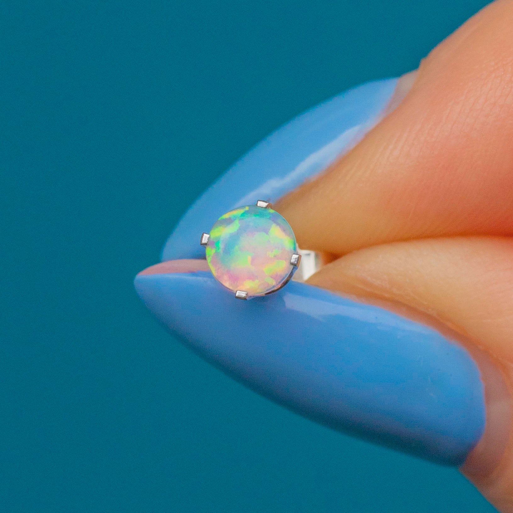 These charming dainty 14ct Gold Opal stud earrings will bring a vibrant pop of colour to your lobes! Crafted from 14ct White Gold, each earring showcases a single vivid Opal set securely in delicate claw settings. The Opals exhibit a vivid play of colour, bound to enchant anyone who lays eyes on them.