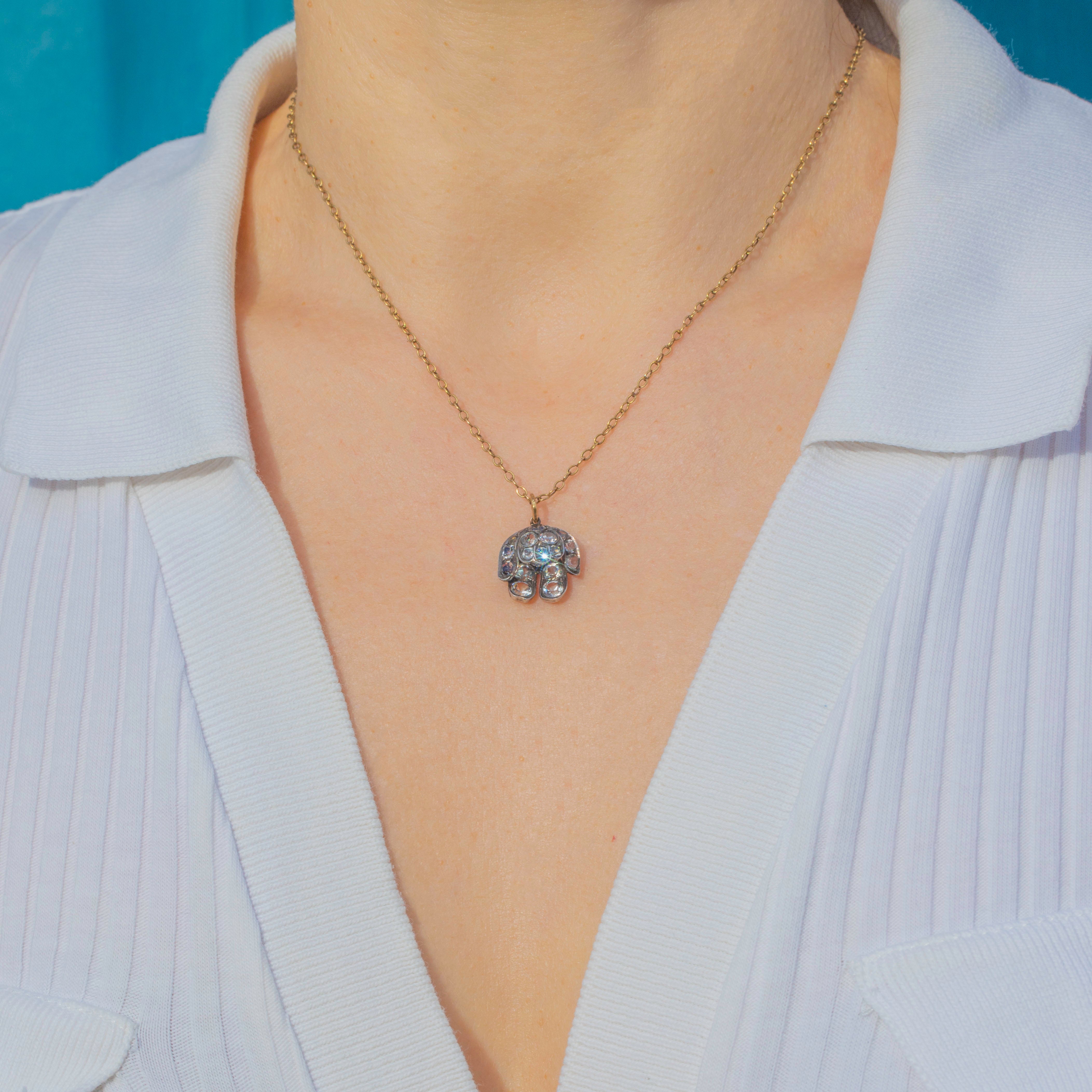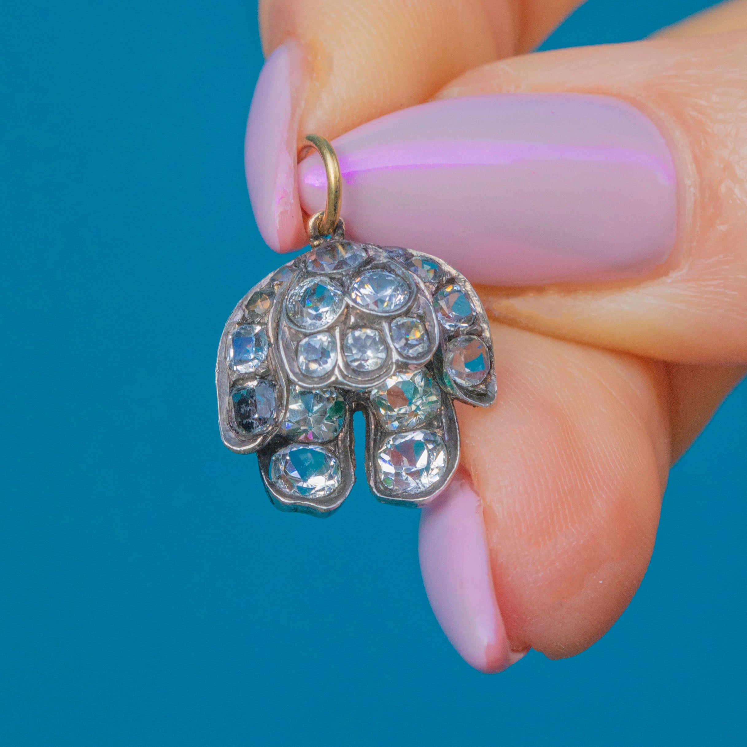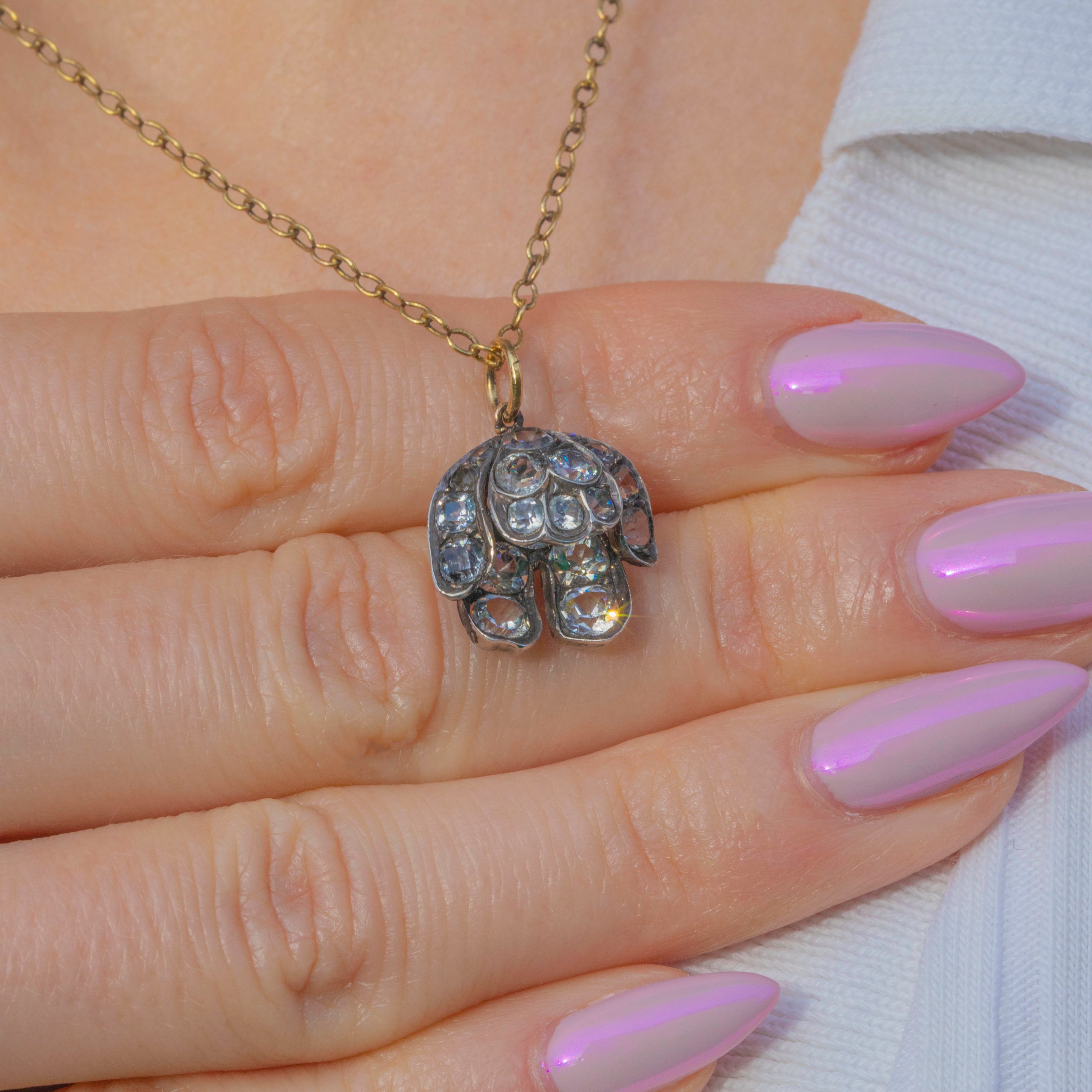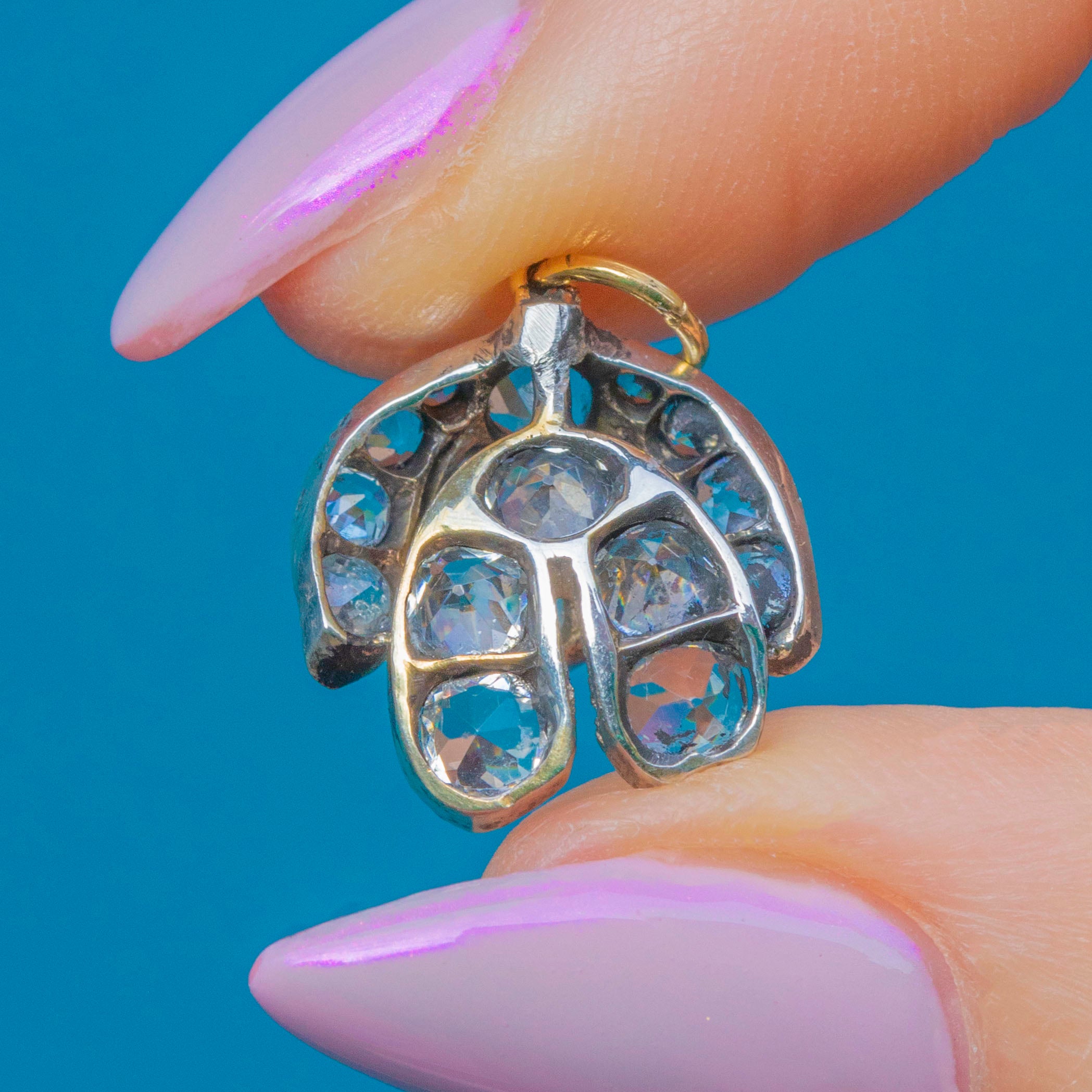 This dainty Victorian flower charm is crafted in a lovely two-tone mix of 18ct Gold and Silver, set throughout with bright white hand-cut Paste. The petals are layered to form a charming three-dimensional bloom, catching the light from every angle with that classic antique sparkle.