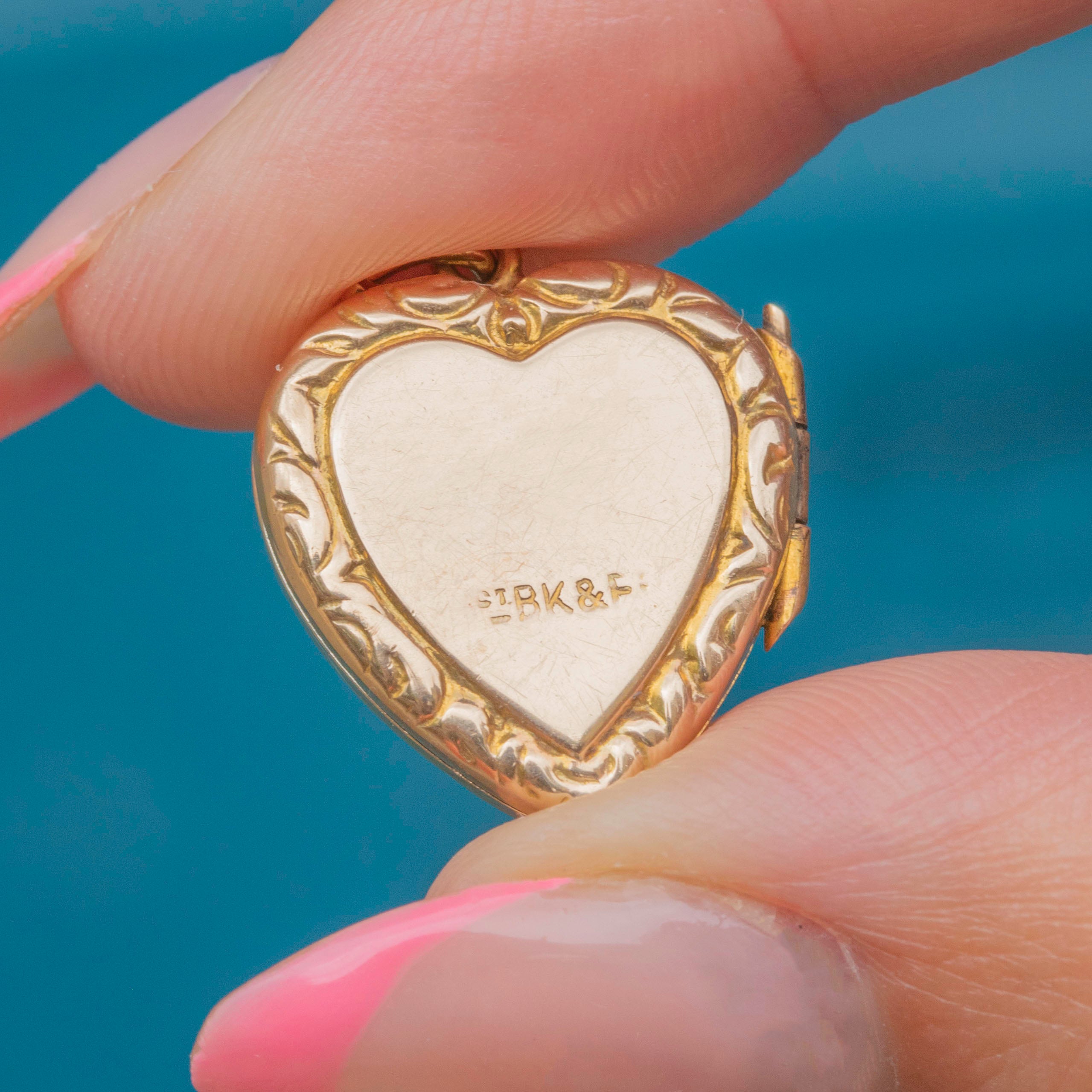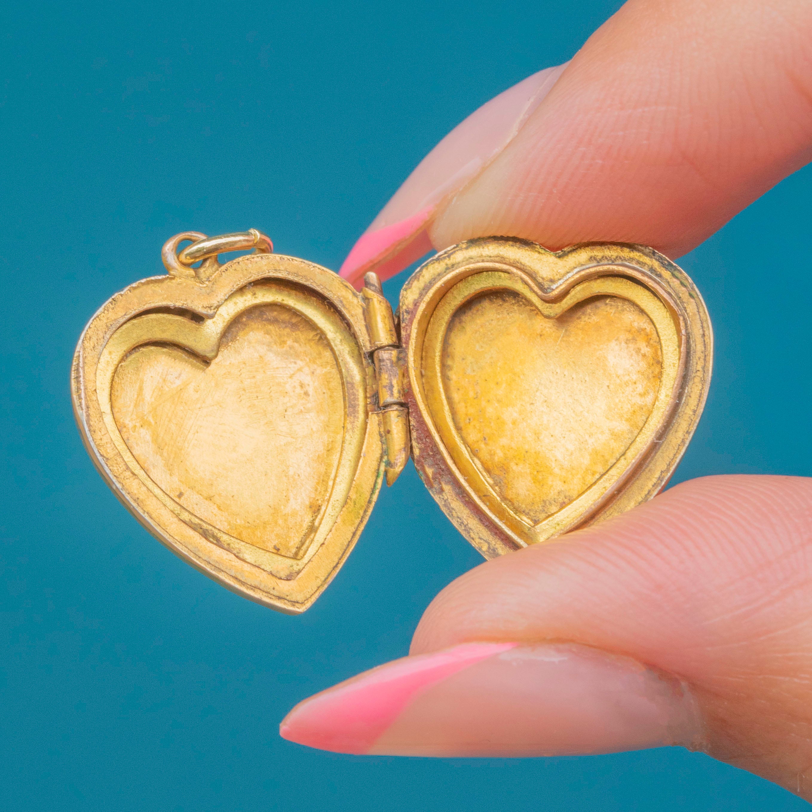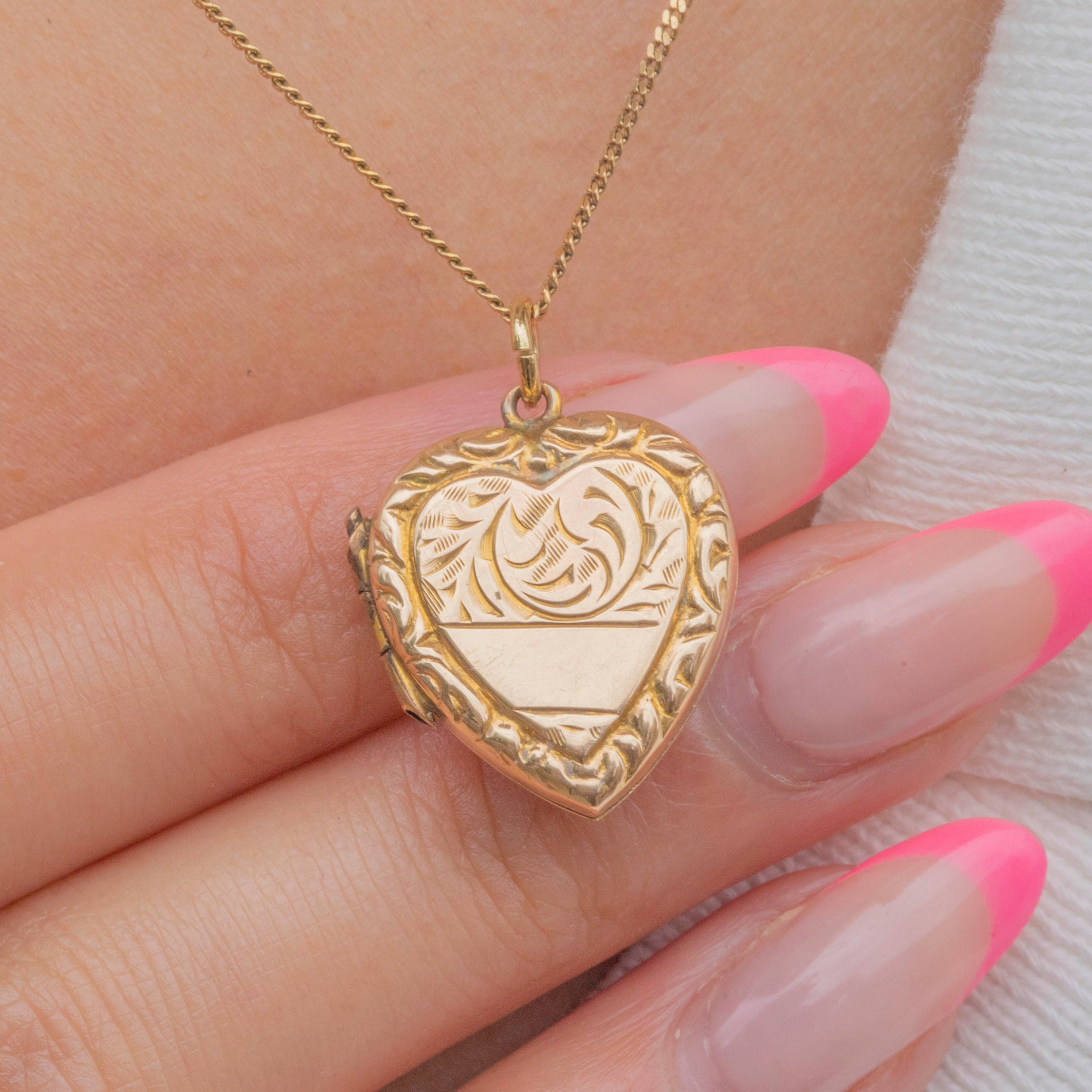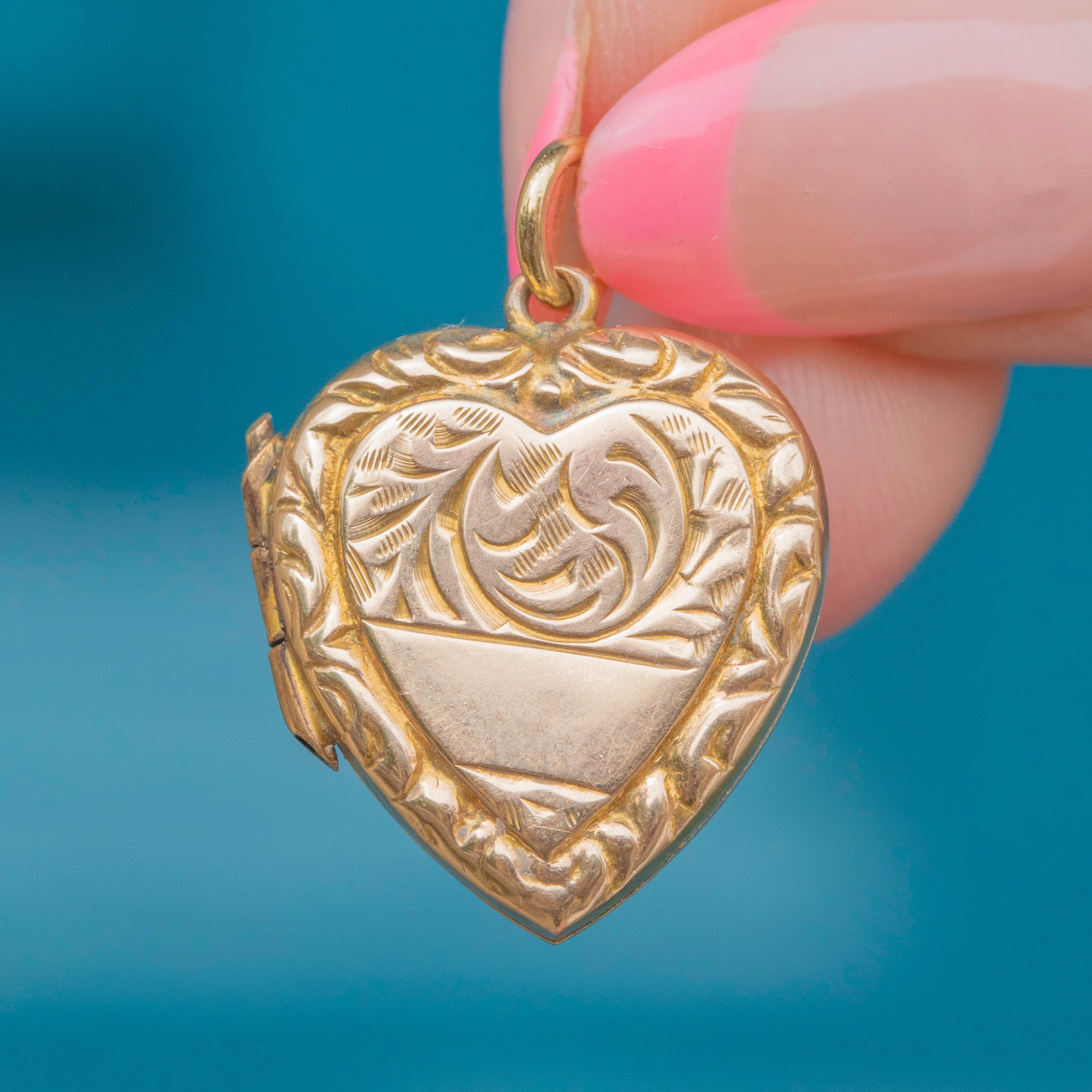 VERY GOOD: This dainty 9ct Gold engraved heart locket is in very good condition. The engravings have lasted well over the years, retaining their original antique allure. The jump ring is firmly attached, so you can wear it with confidence. The two frames are present and she opens and closes well, keeping your treasured photos safe. All in all, a charming little locket!