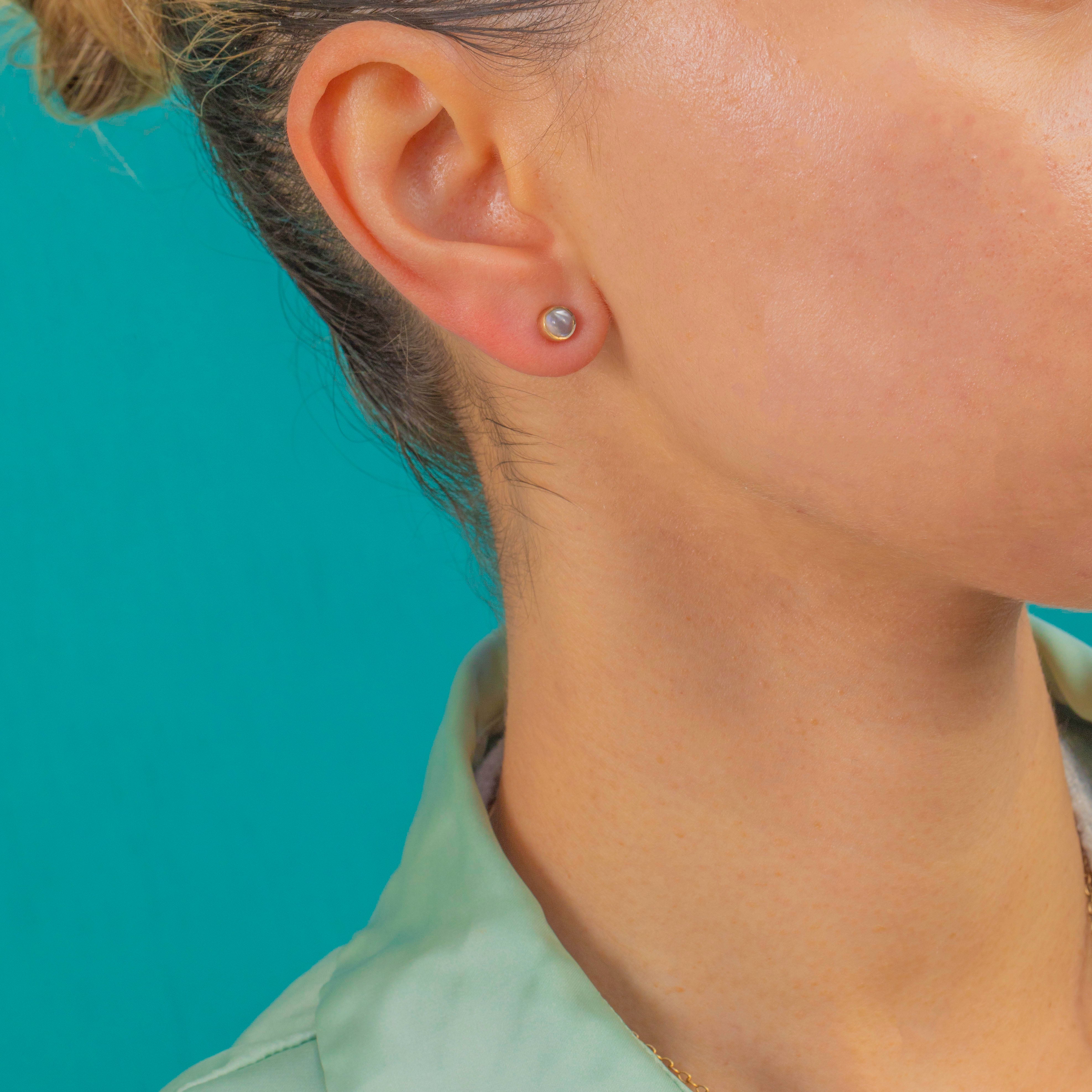 A sweet pair of Vintage Moonstone stud earrings crafted in glowing 9ct Gold. The Moonstones display a soft, ethereal sheen with that gentle shimmer that makes Moonstone such a beloved gem. Their neat size makes them perfect for everyday wear and easy to pair with any jewellery collection.
