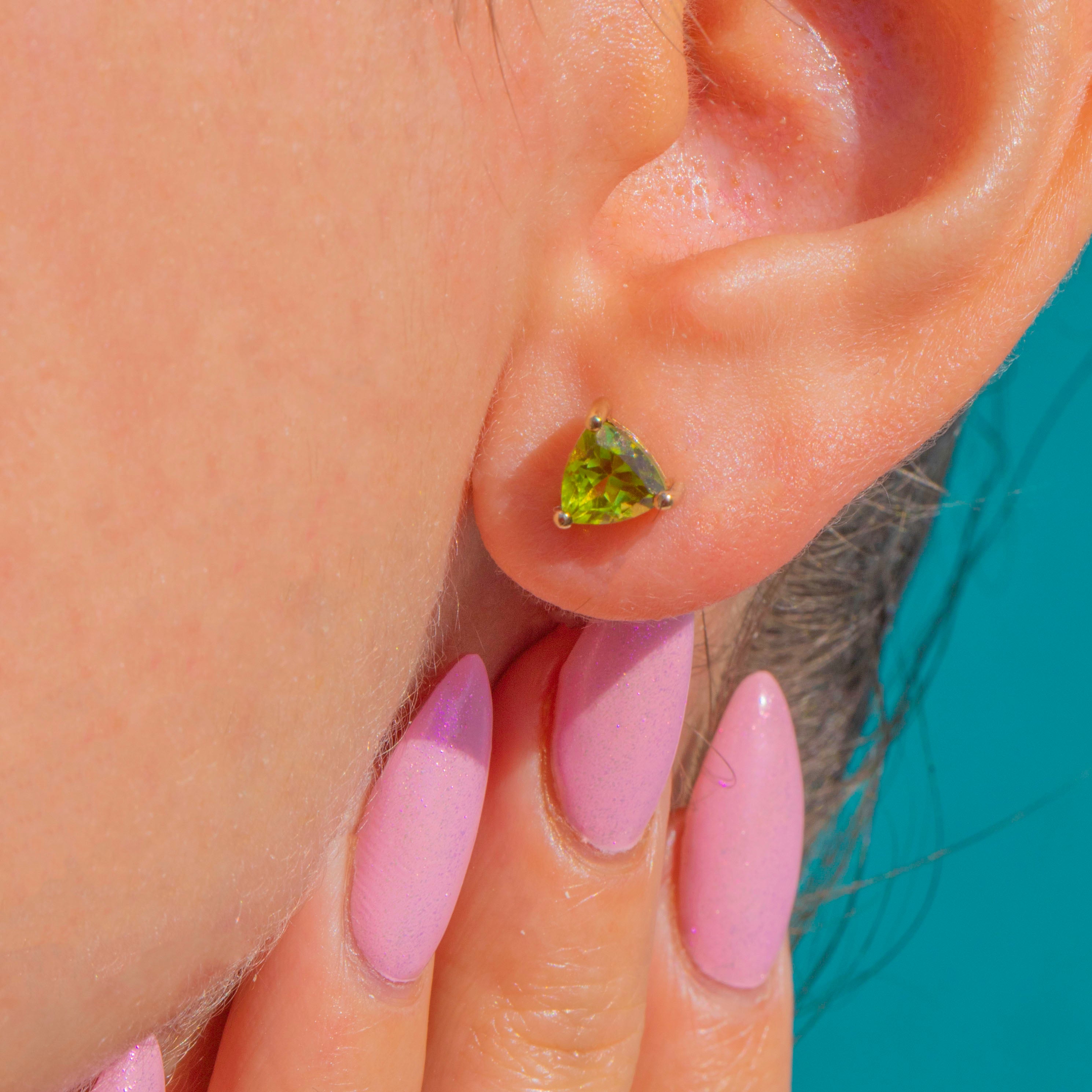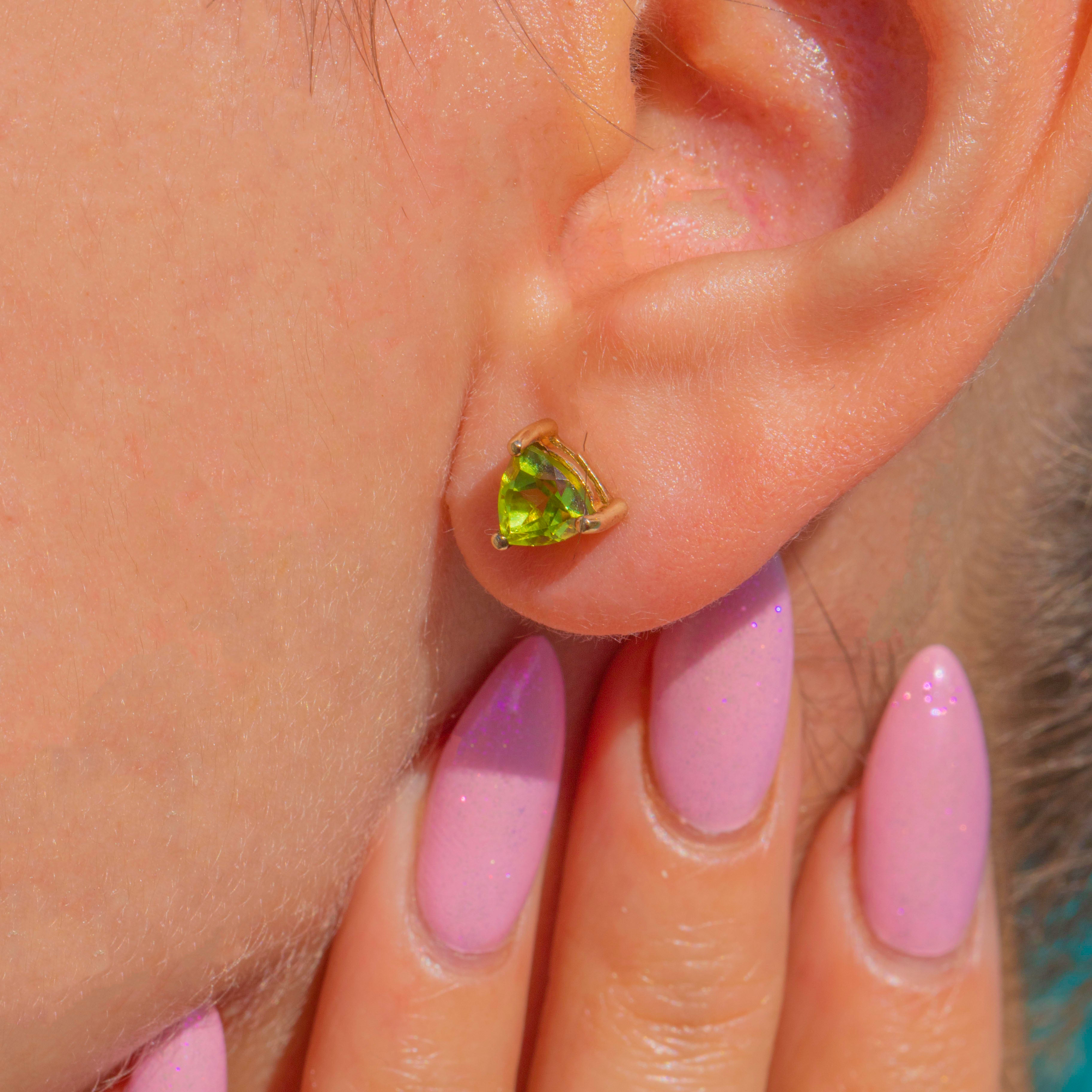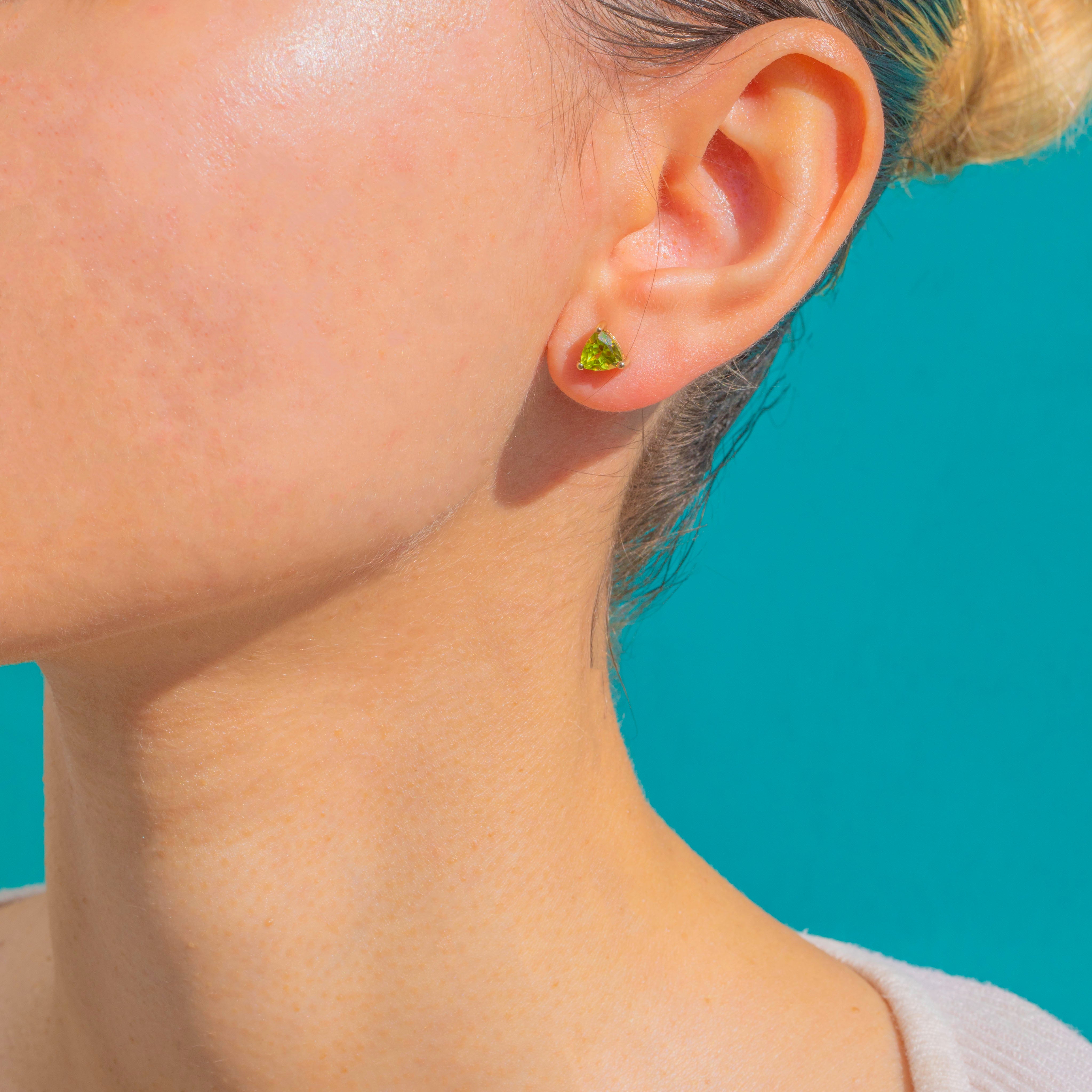 A zesty pop of colour in the prettiest, most wearable form. These dainty 9ct Gold stud earrings showcase vivid chartreuse Peridots cut in sleek trilliant facets and held in elegant three-prong open mounts. The low-profile baskets and clean, modern lines let the stones take centre stage, flashing bright lime-green fire with every move.
