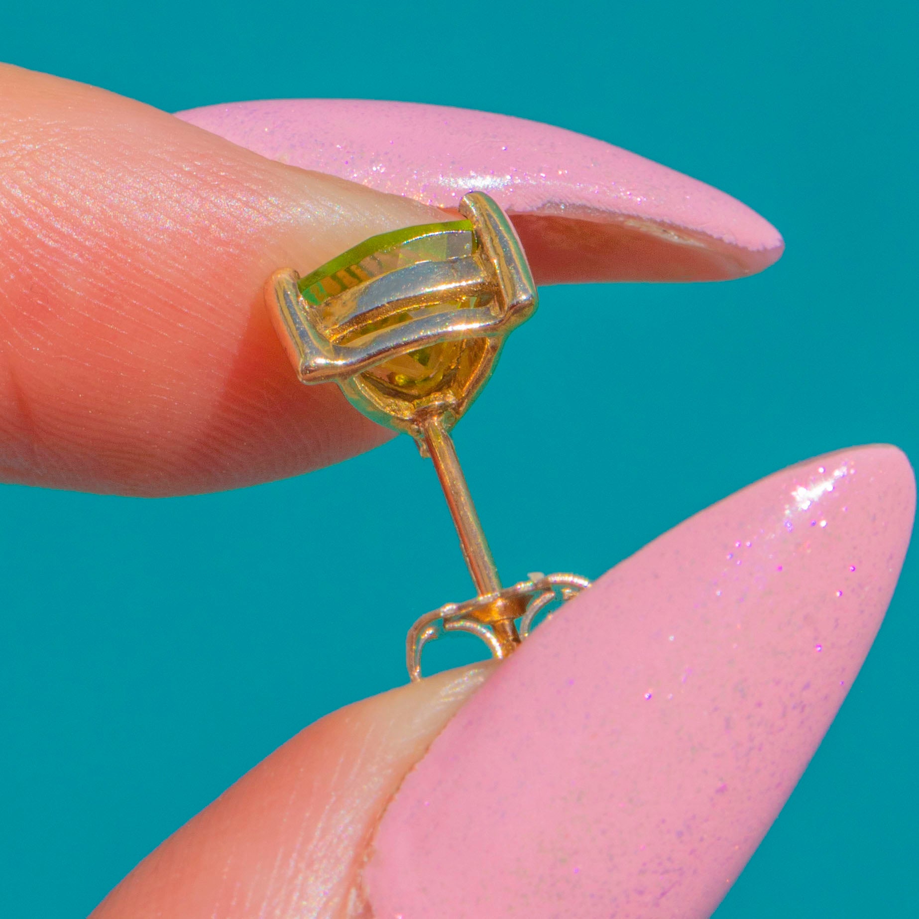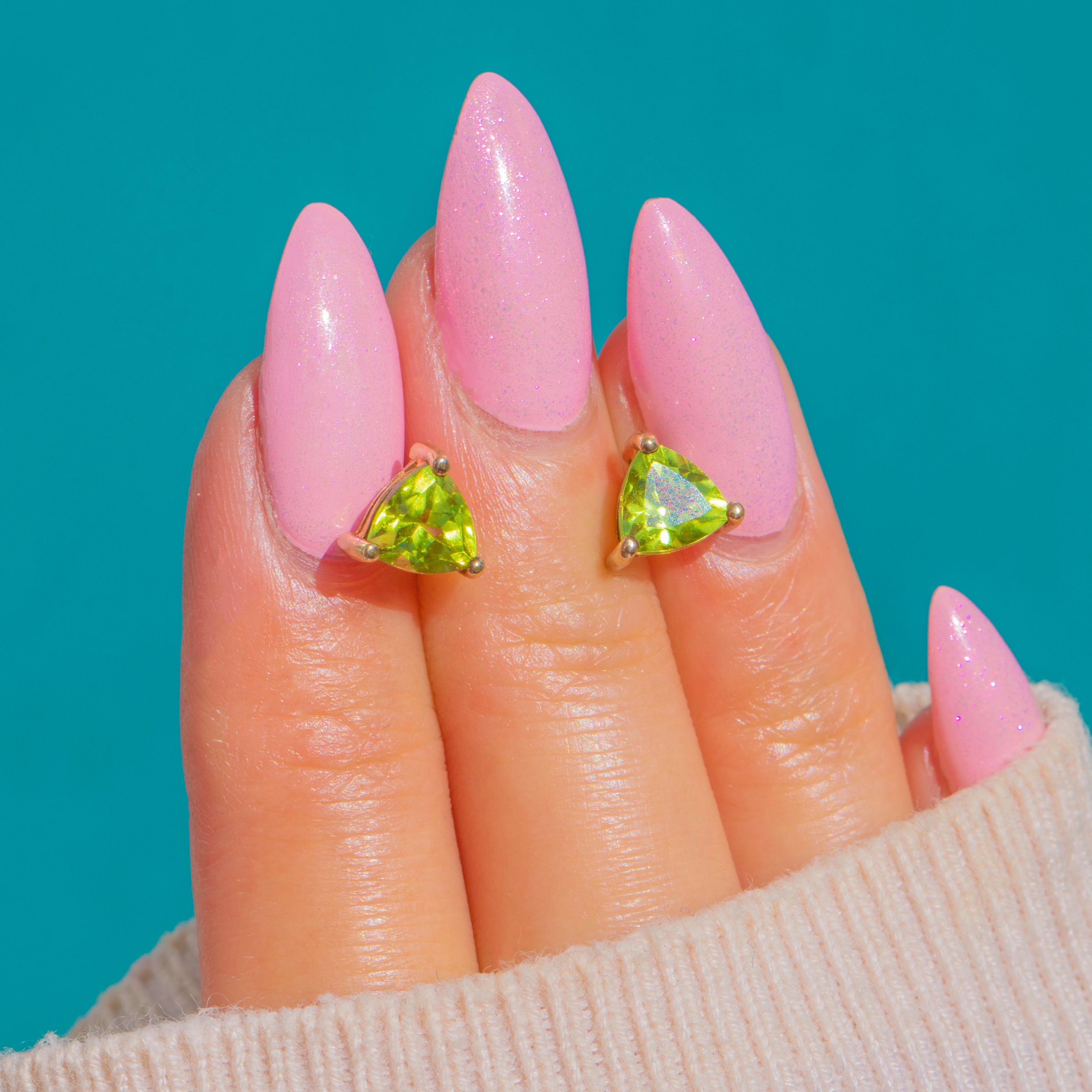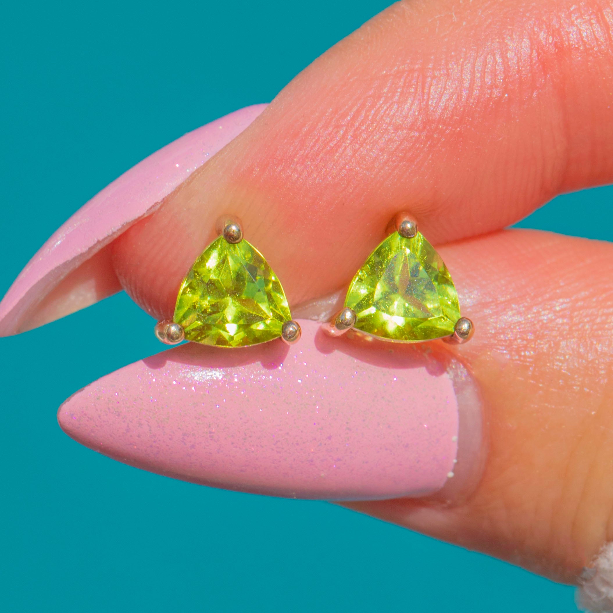 A zesty pop of colour in the prettiest, most wearable form. These dainty 9ct Gold stud earrings showcase vivid chartreuse Peridots cut in sleek trilliant facets and held in elegant three-prong open mounts. The low-profile baskets and clean, modern lines let the stones take centre stage, flashing bright lime-green fire with every move.