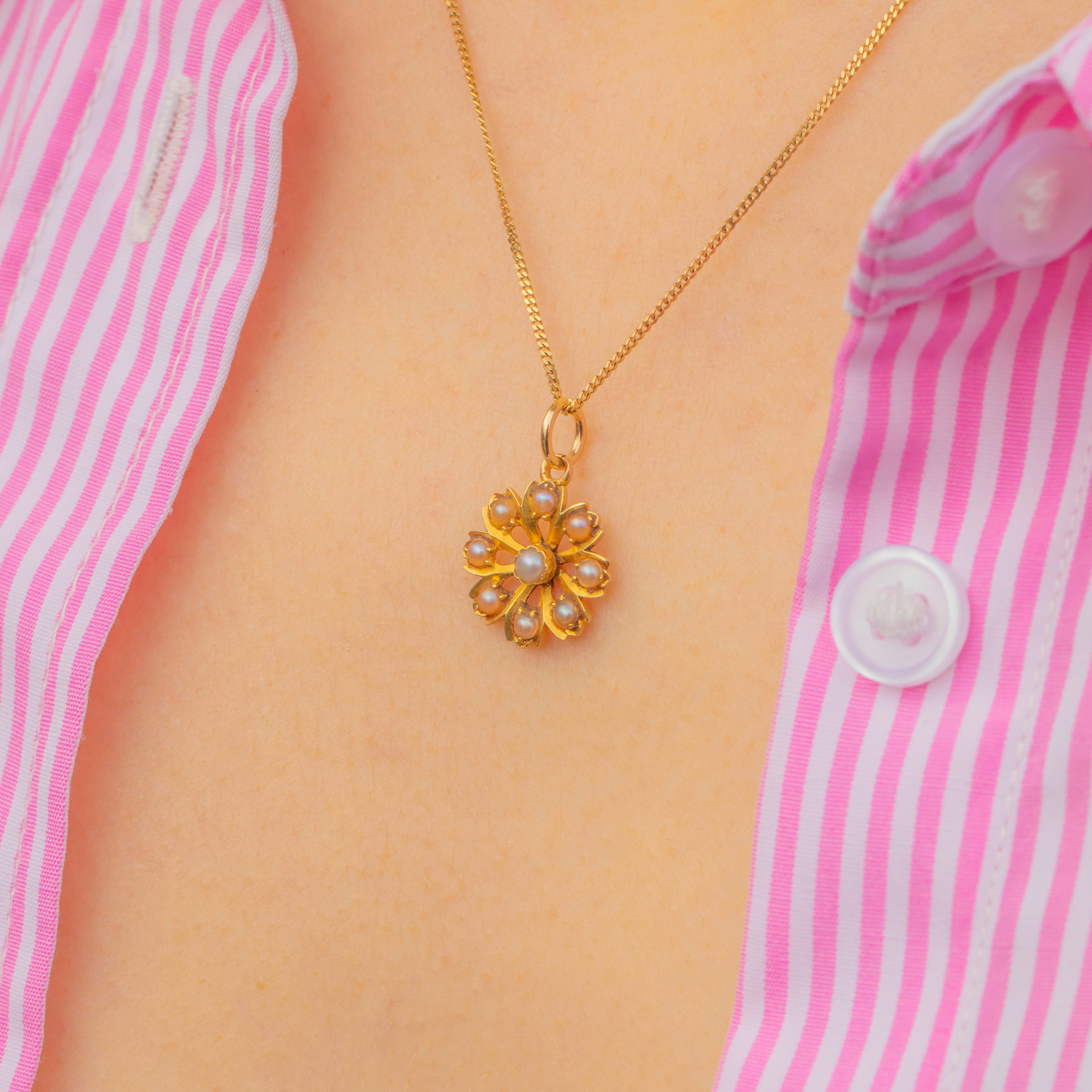 EXCELLENT. This dainty antique 18ct Gold Pearl flower pendant is in excellent condition. Each Pearl sits securely within its setting and is free from any notable signs of wear. With a secure jump ring, you can wear this Edwardian pendant with utmost confidence!