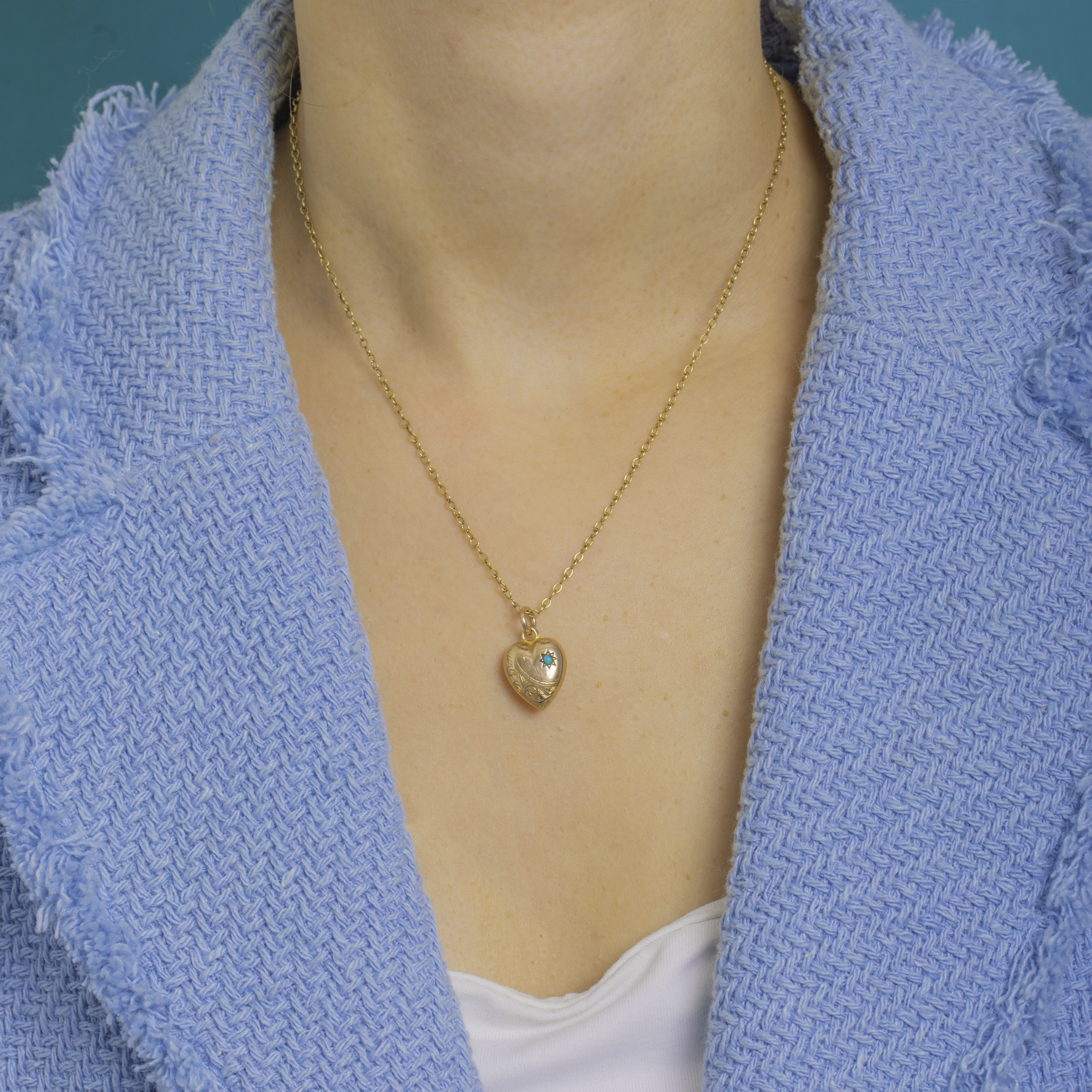 A dainty Victorian 9ct Gold heart charm, softly puffed and beautifully hand-engraved with foliate scrolls and a curved bright-cut panel. An eight-point starburst holds a single round Turquoise cabochon, lending a delicate pop of blue to the warm Gold.