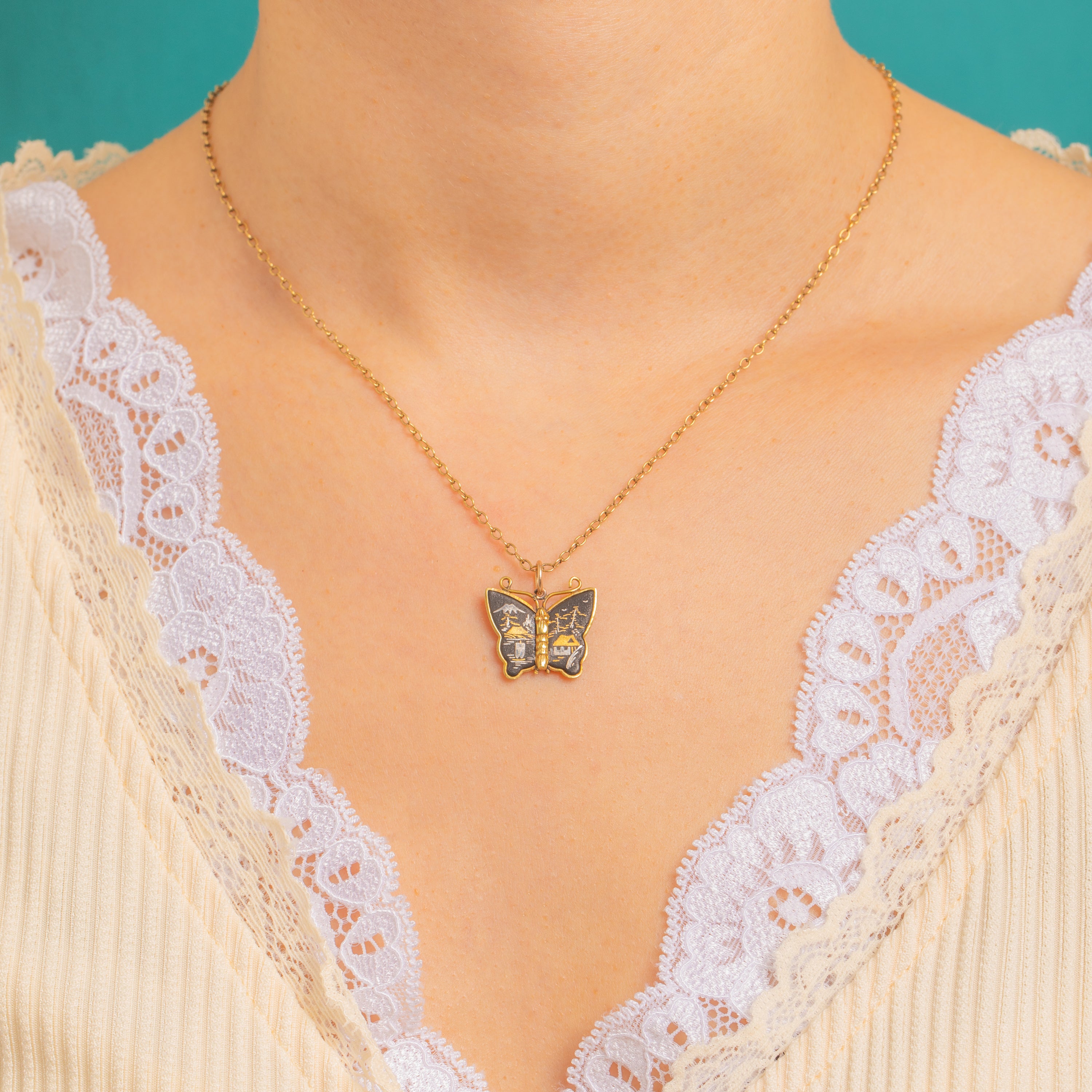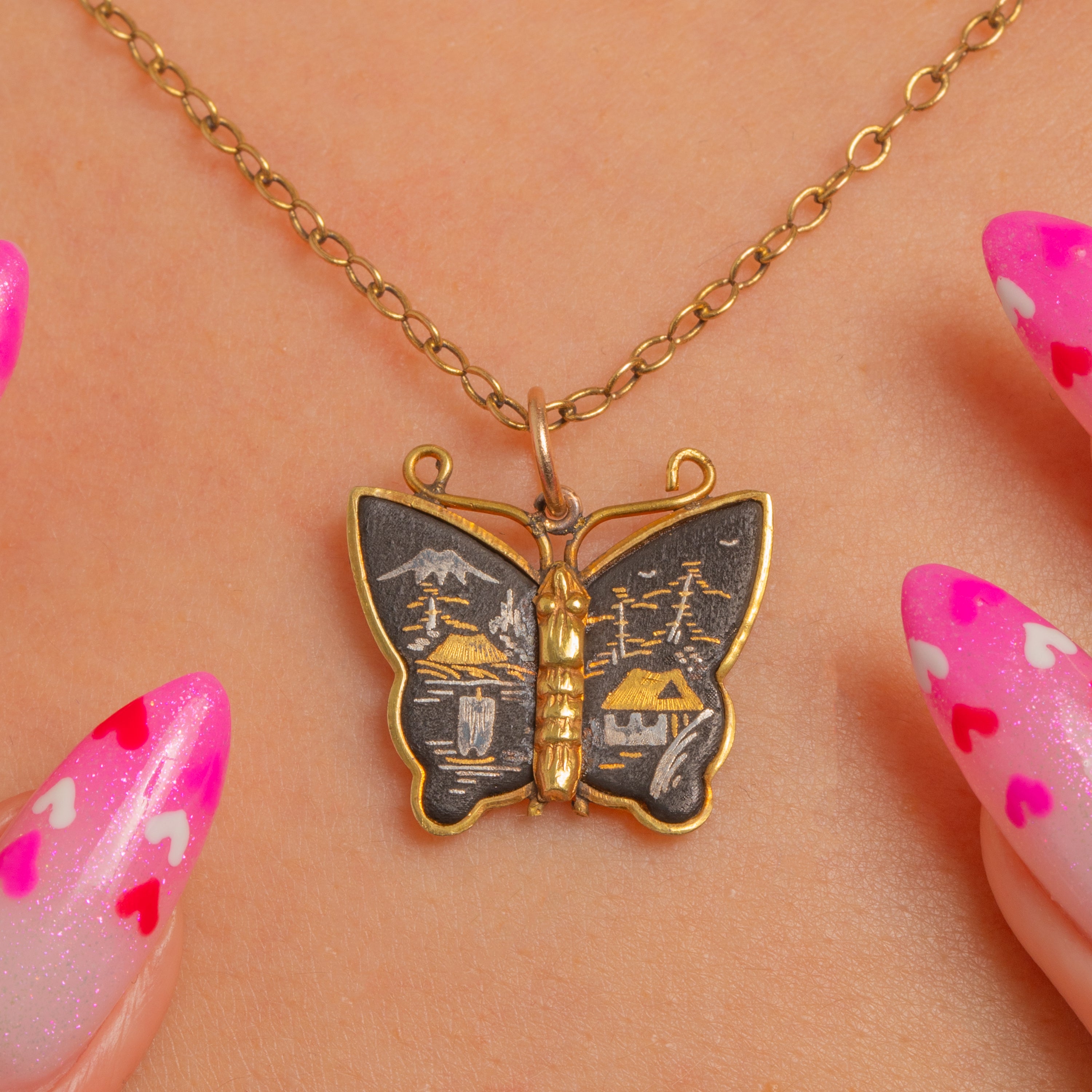 A dainty Art Deco butterfly charm crafted in Shakudo, its velvety dark wings enlivened by exquisitely fine Gold and Silver miniature landscapes—think pagodas, trees and distant mountains—painted in delicate detail. A raised, gilded body adds gentle dimension to the silhouette, creating a jewel that feels at once poetic and precise.