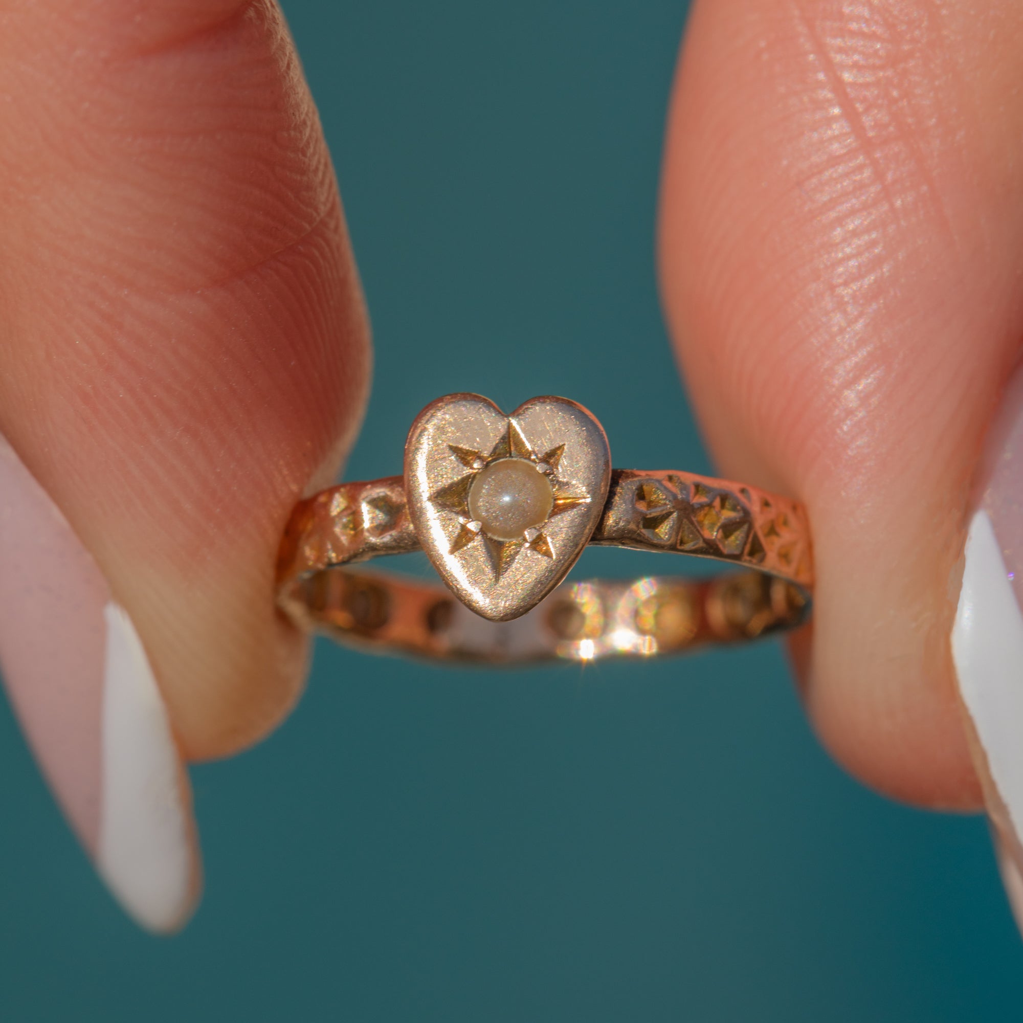 GOOD-VERY GOOD: This dainty Victorian 9ct Gold heart pinky ring is in good to very good condition. There is notable signs of wear to the Gold and her Pearl is less lustrous than she once was and her band has taken on a gentle curve with time . However, this ring is dated to 1898 and considering her age, is a lovely piece! Her Gold has remained warm and with gorgeous engravings, she is an antique beauty.