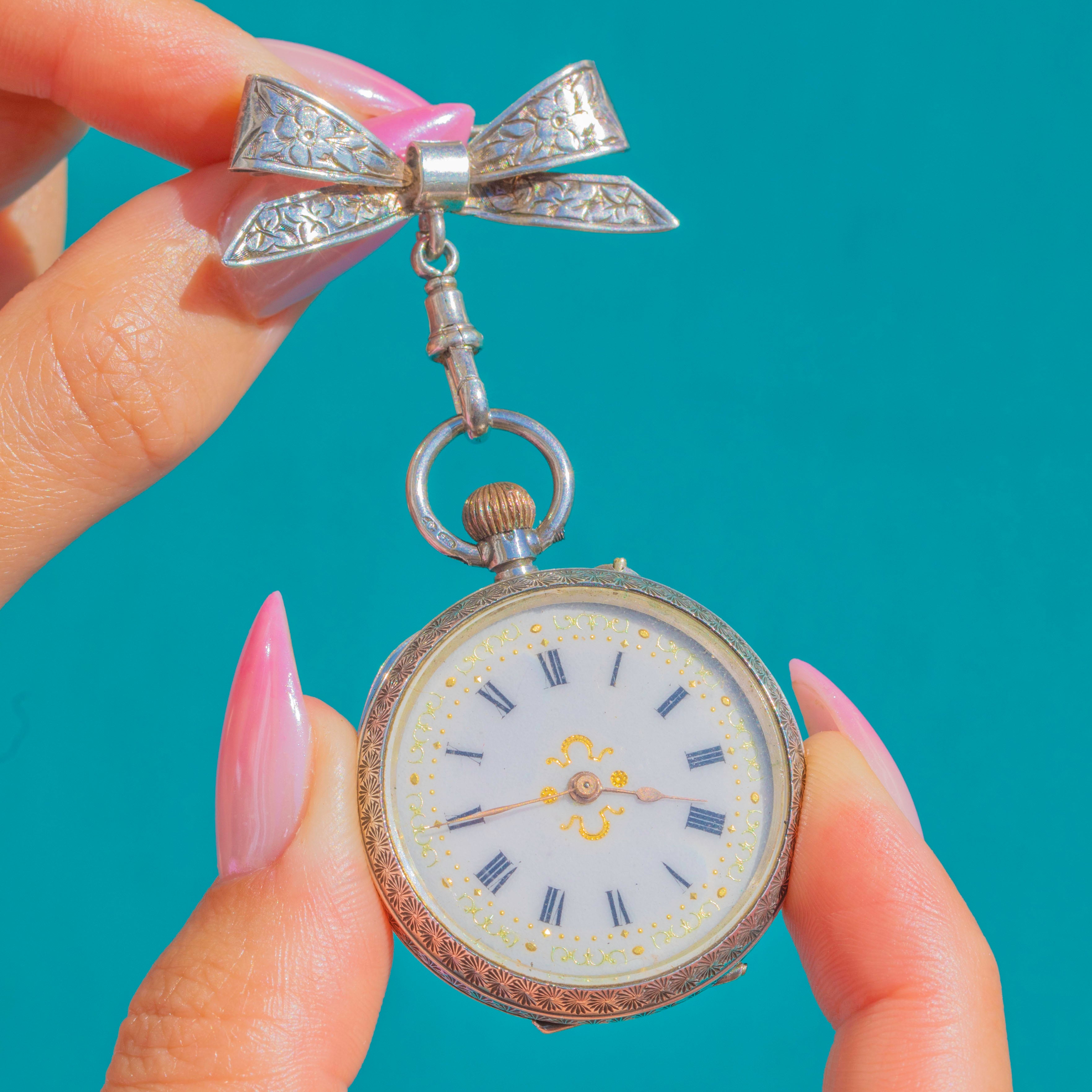 A romantic Edwardian treasure, this Sterling Silver bow brooch suspends a petite pendant watch in a graceful articulated drop. The bow is richly engraved with foliate detail, while the watch case is framed by an engine-turned border for a subtle guilloché-like shimmer. A white Enamel dial with black Roman numerals, delicate gilt scrollwork and elegant Gold hands completes the picture, with a warm gilt crown adding a final flourish.
