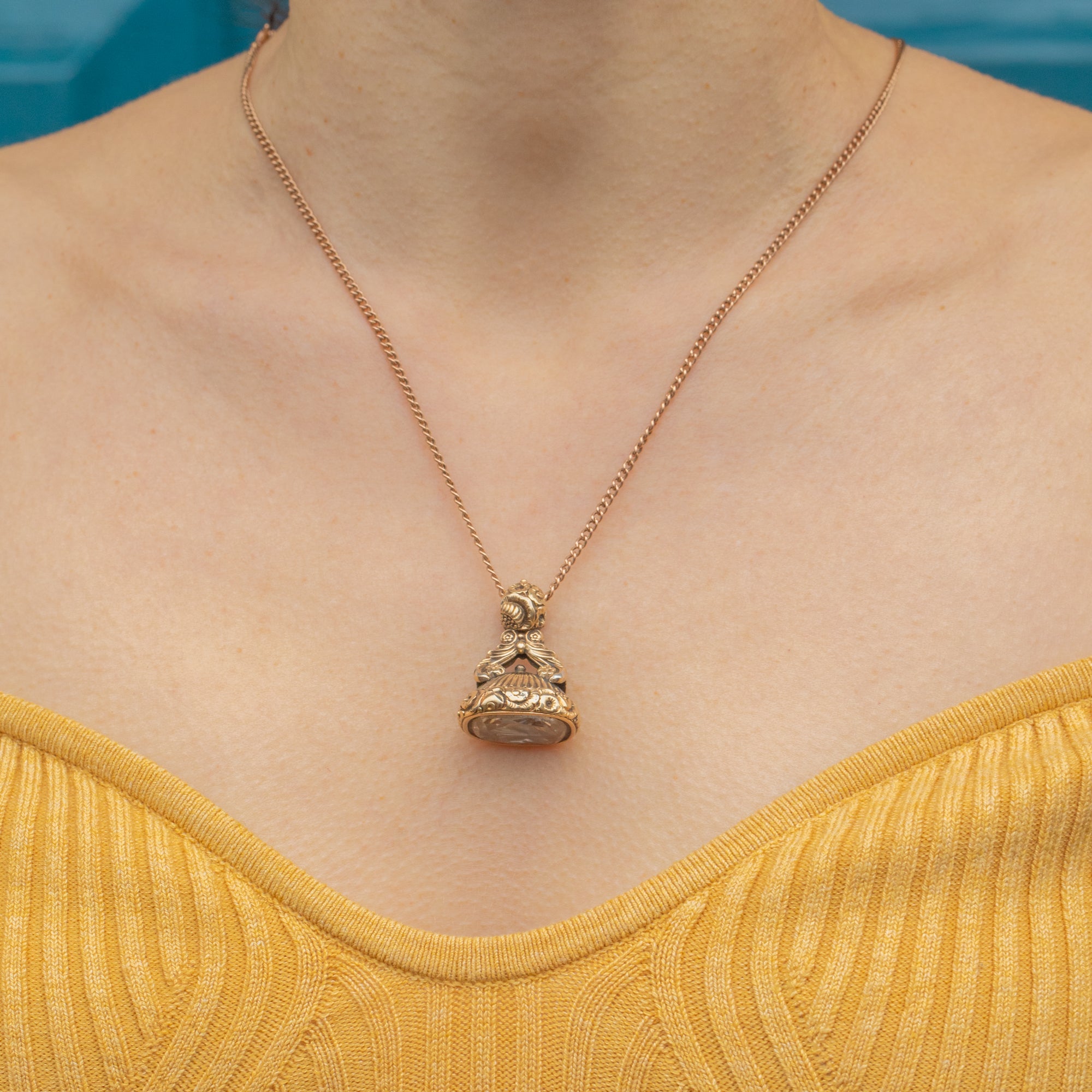 This Early Victorian 15ct Gold Cased Rock Crystal Fob Pendant is impressive! Bursting with decadence and character, she boasts an artic Rock Crystal, with an ornate pillar and dramatic engravings.