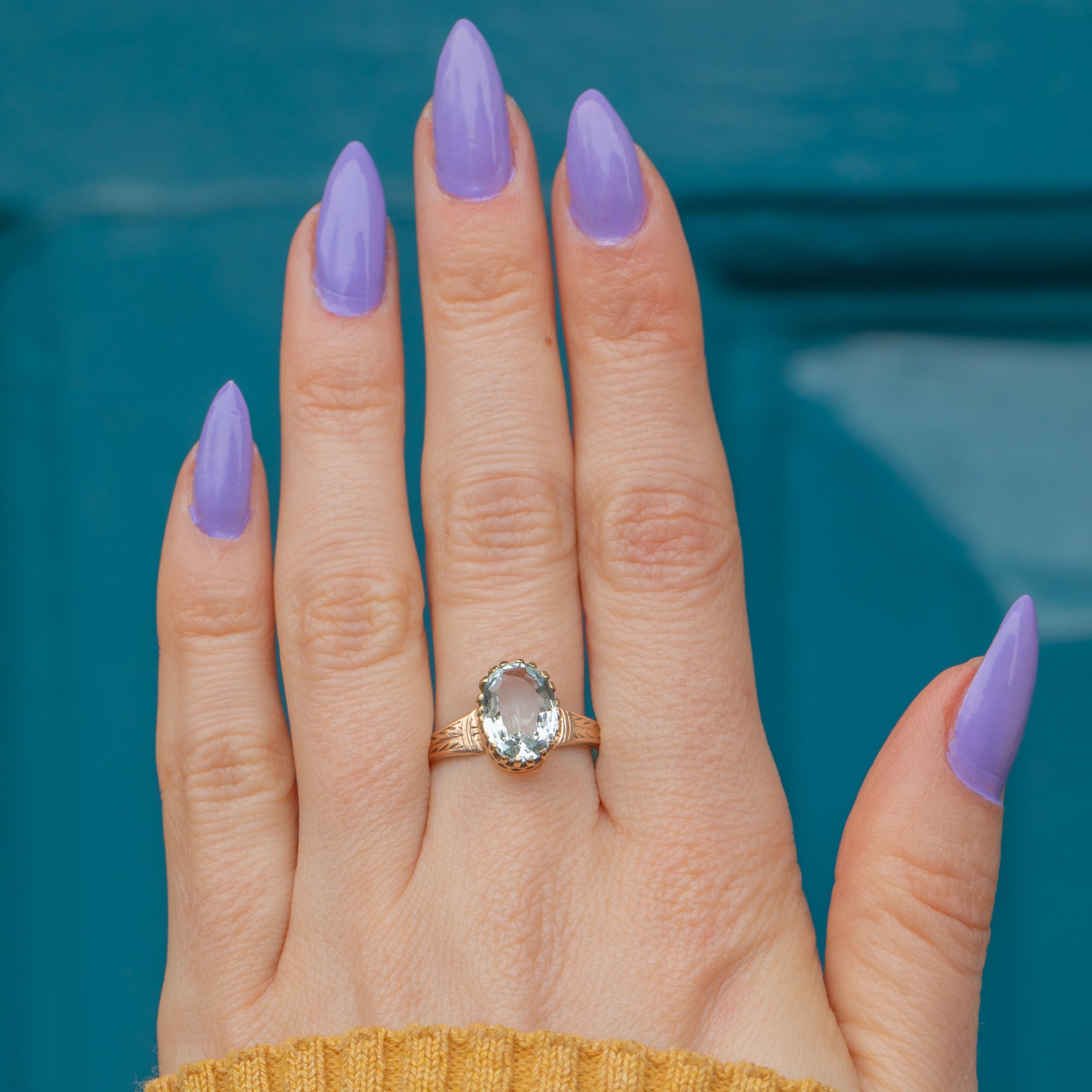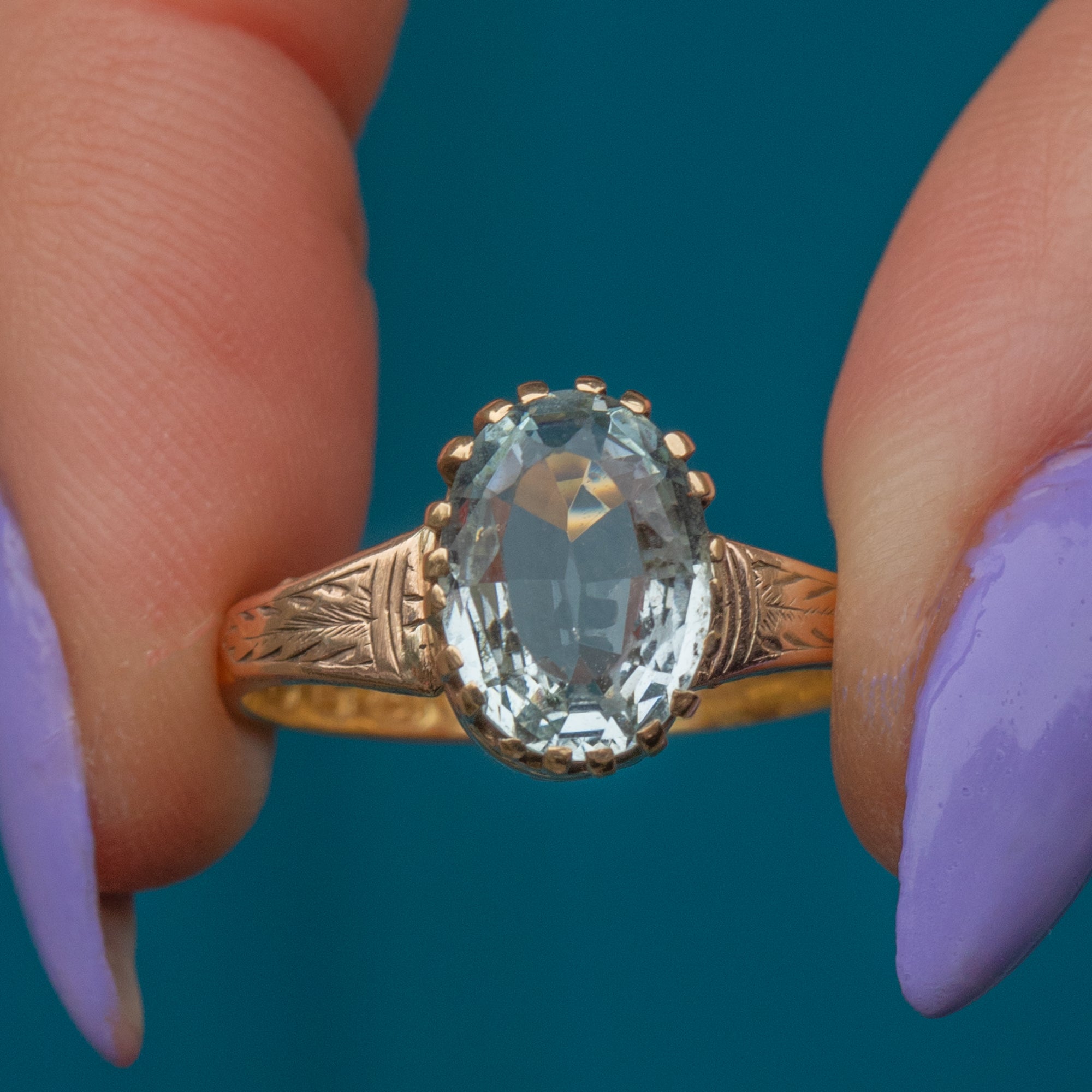 In her centre sits a crisp 1.40ct Aquamarine, radiating cool azure hues as she catches the light. The Aquamarine is displayed within buttery 18ct Gold claw settings and is flanked by ornately engraved shoulders adding a decorative finish.