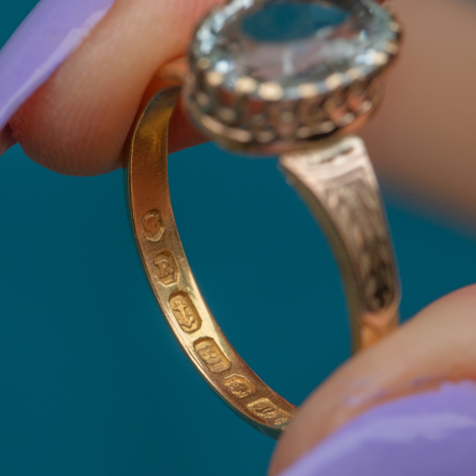 VERY GOOD-EXCELLENT: This Victorian 18ct Gold Aquamarine ring is in superb condition. Her Aquamarine has a crisp set of facets, with only some minor scuffs, and is held securely within its claw settings. The engraved details are crisp and the band is smooth, providing comfortable wear. With a full set of English hallmarks, we can accurately date this early Victorian ring to 1866!