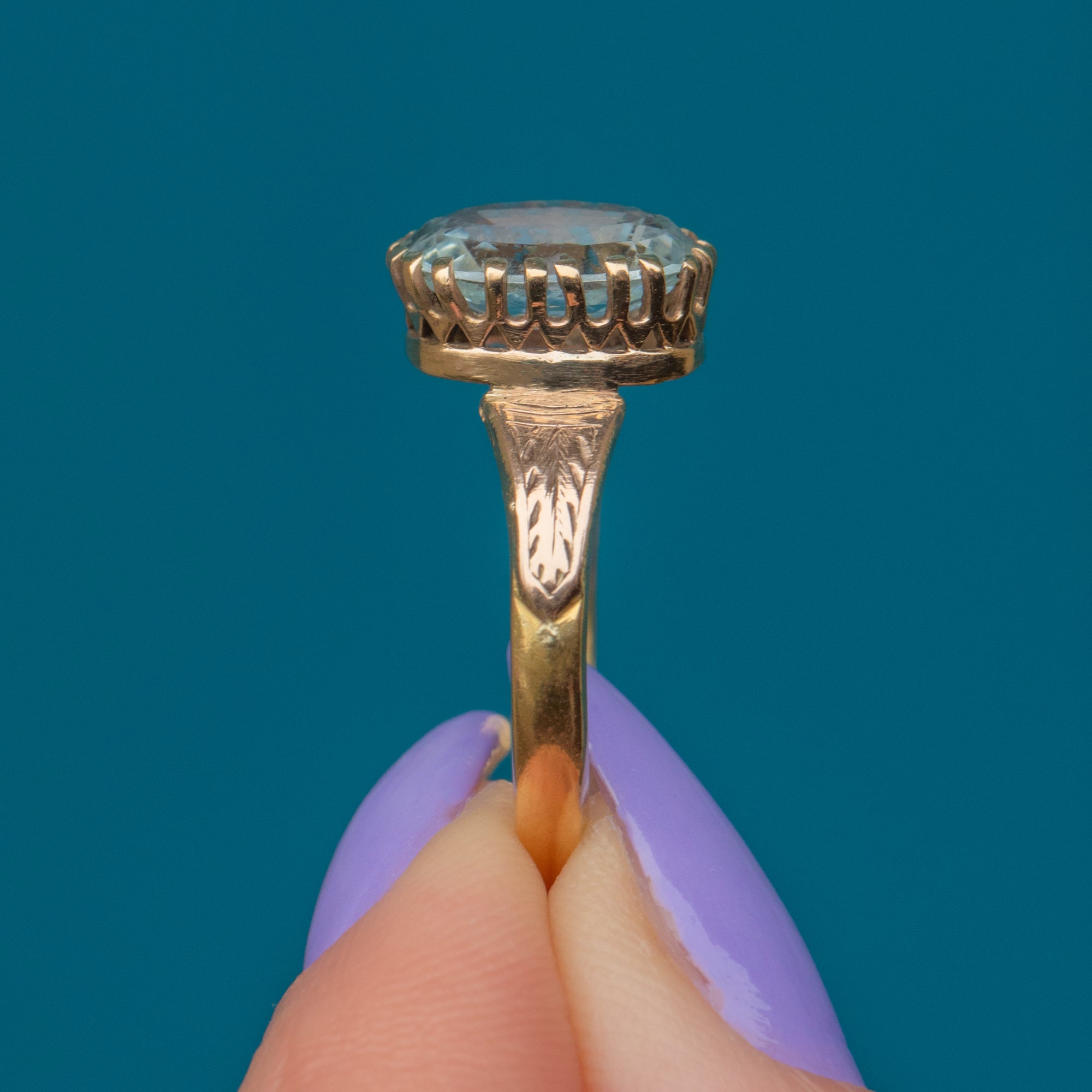 Early Victorian 18ct Gold Aquamarine Ring c.1866, Engraved Shoulders