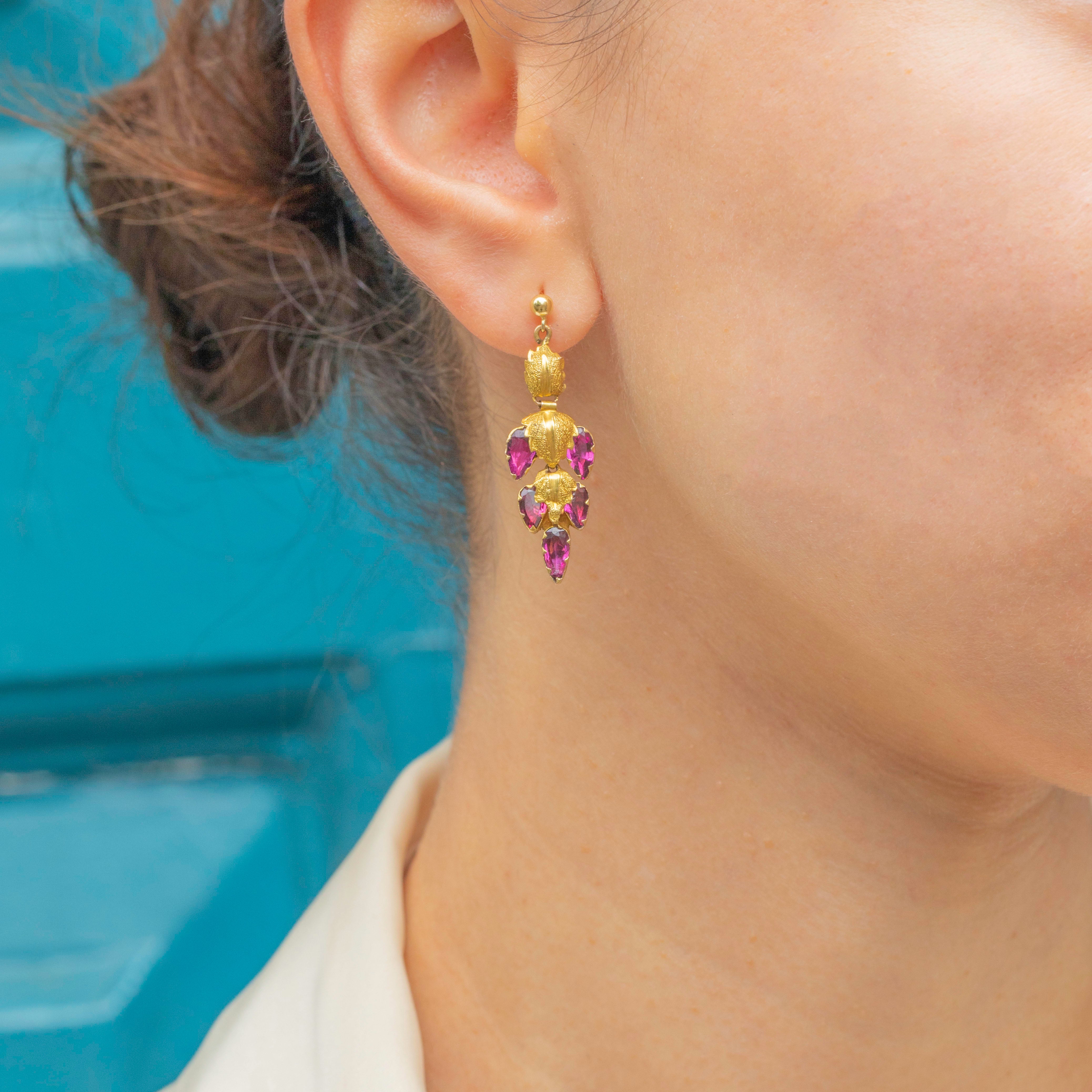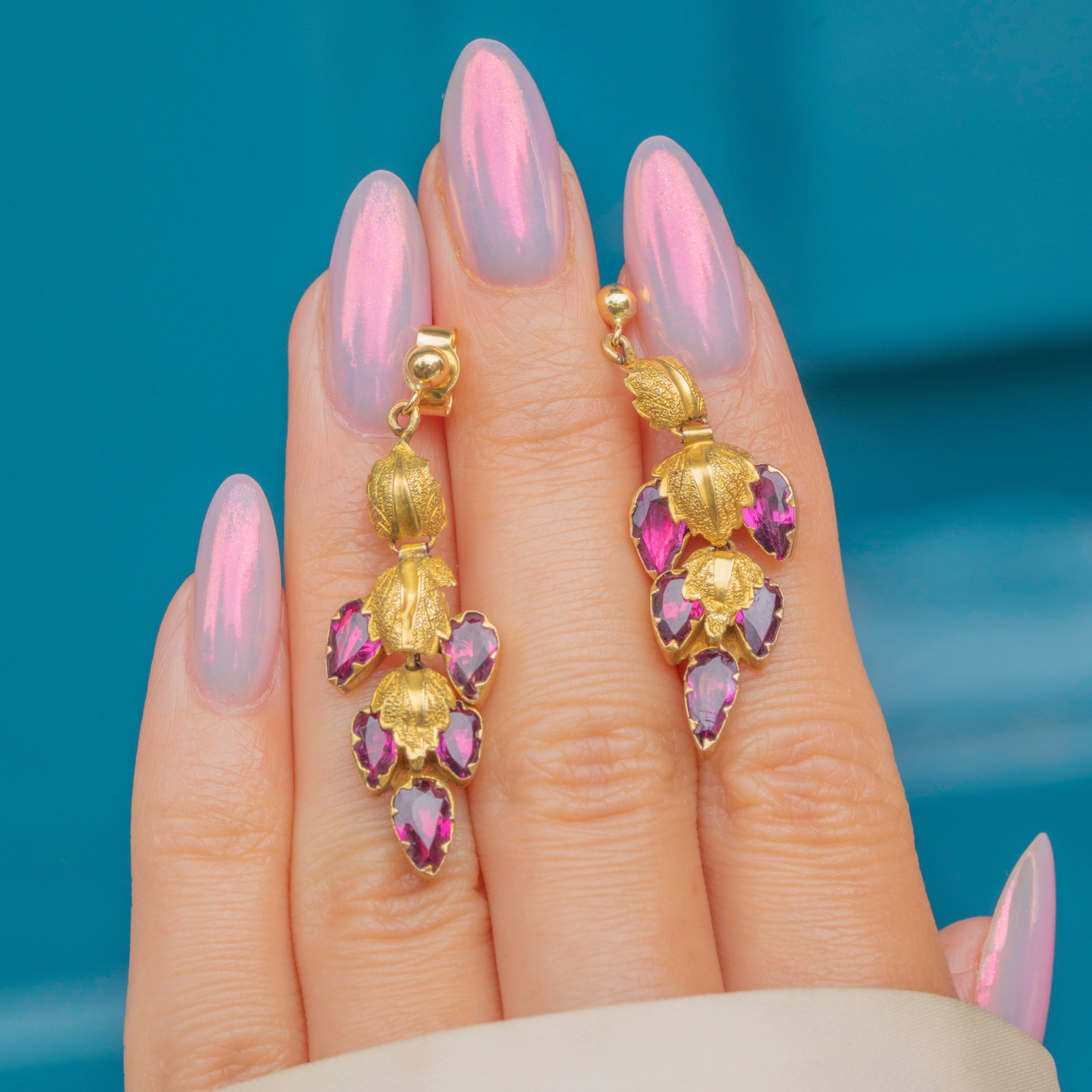 VERY GOOD-EXCELLENT: These early Victorian 18ct Gold Garnet bunch of grapes earrings are in great condition. Each Rhodolite Garnet is radiant and secure in its settings. There are some minor dings on the back of the earrings, though this cannot be seen while the earrings are worn. With secure butterfly backs, these antique earrings can be worn with utmost confidence!