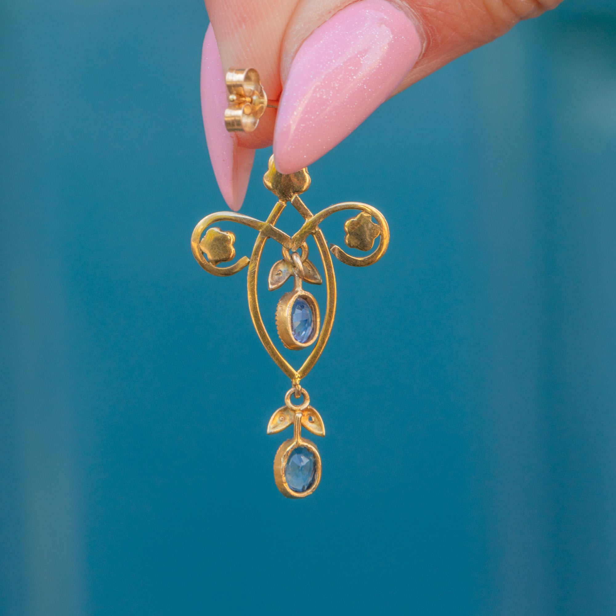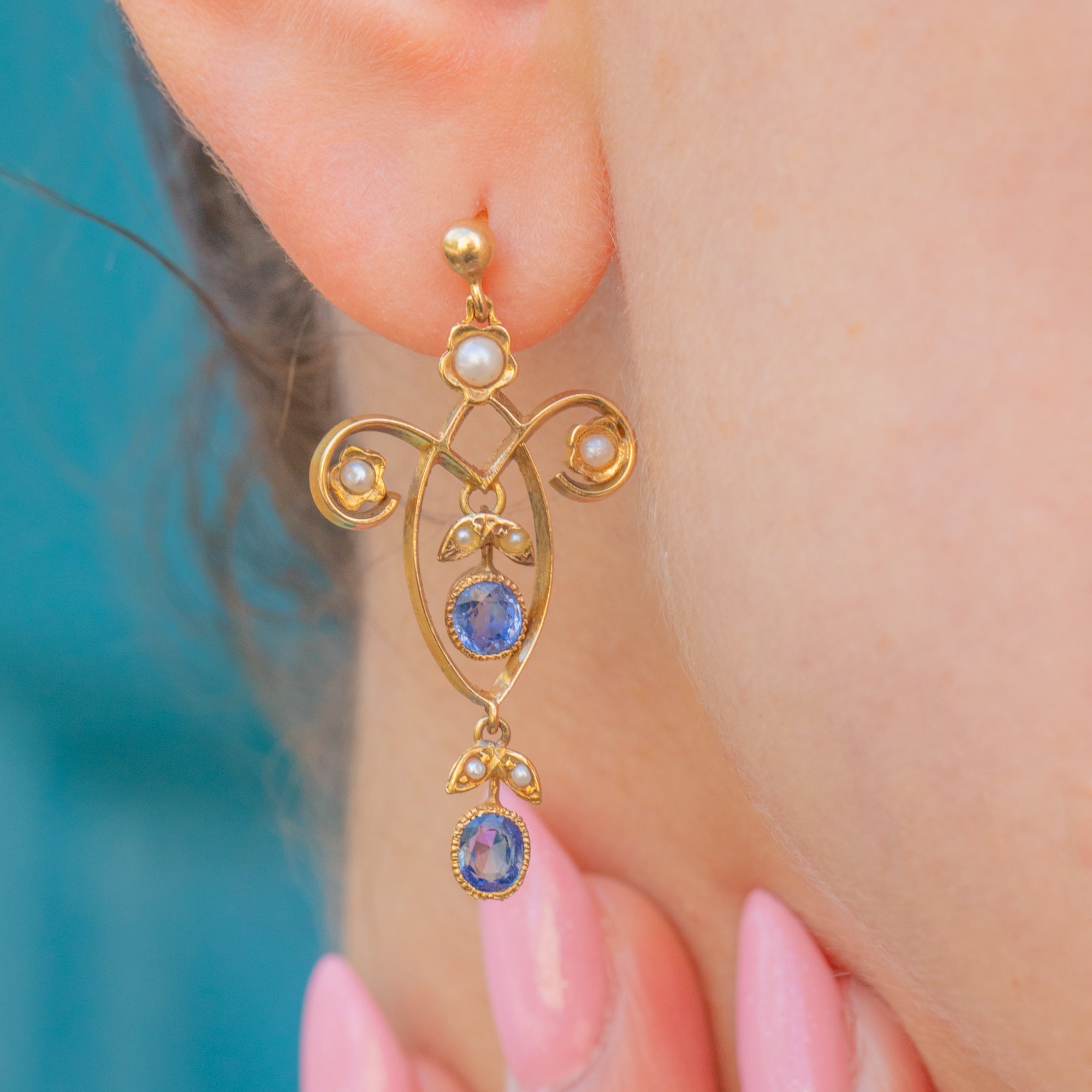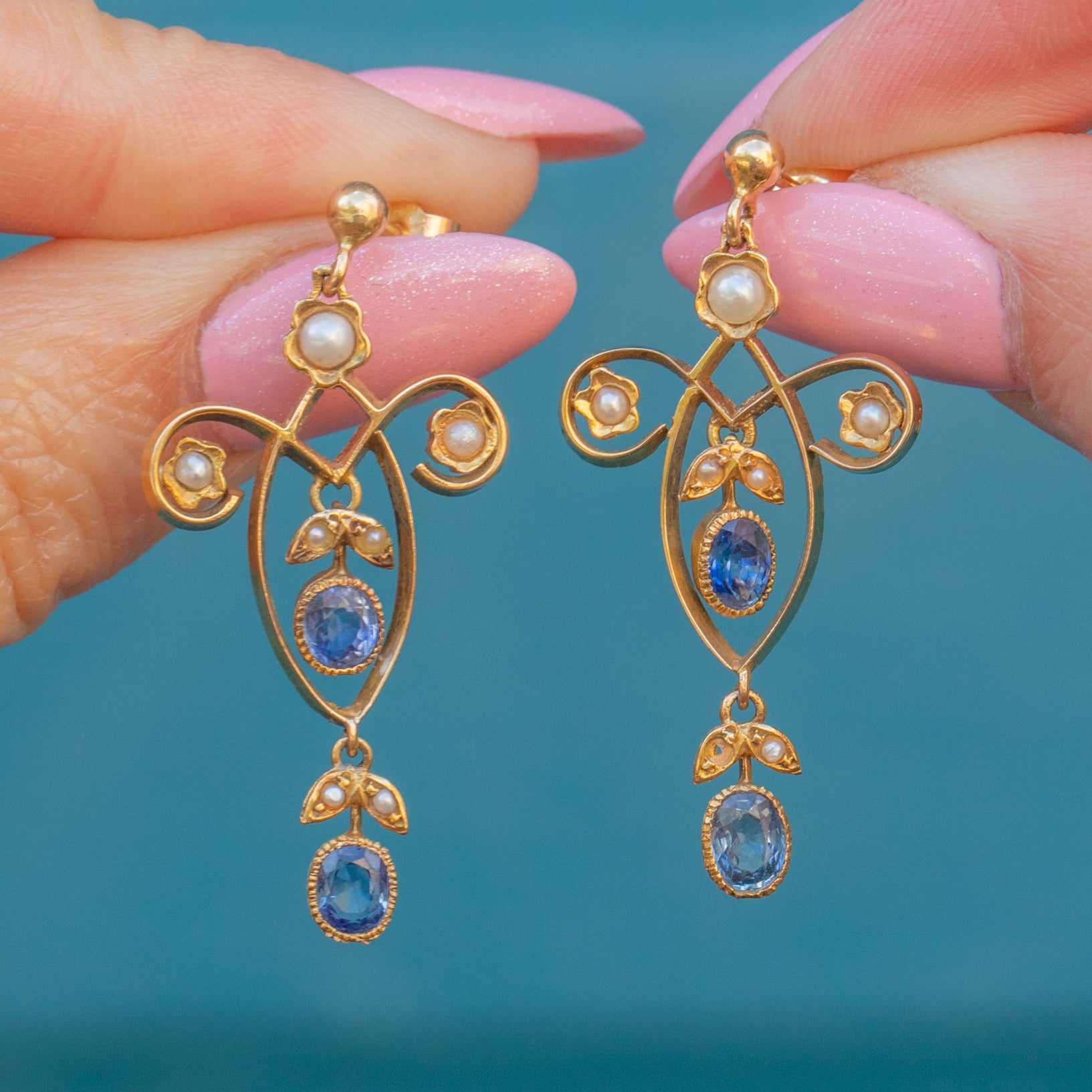 These Edwardian 18ct Gold Sapphire Pearl drop earrings will add a touch of regal sophistication to your outfit!