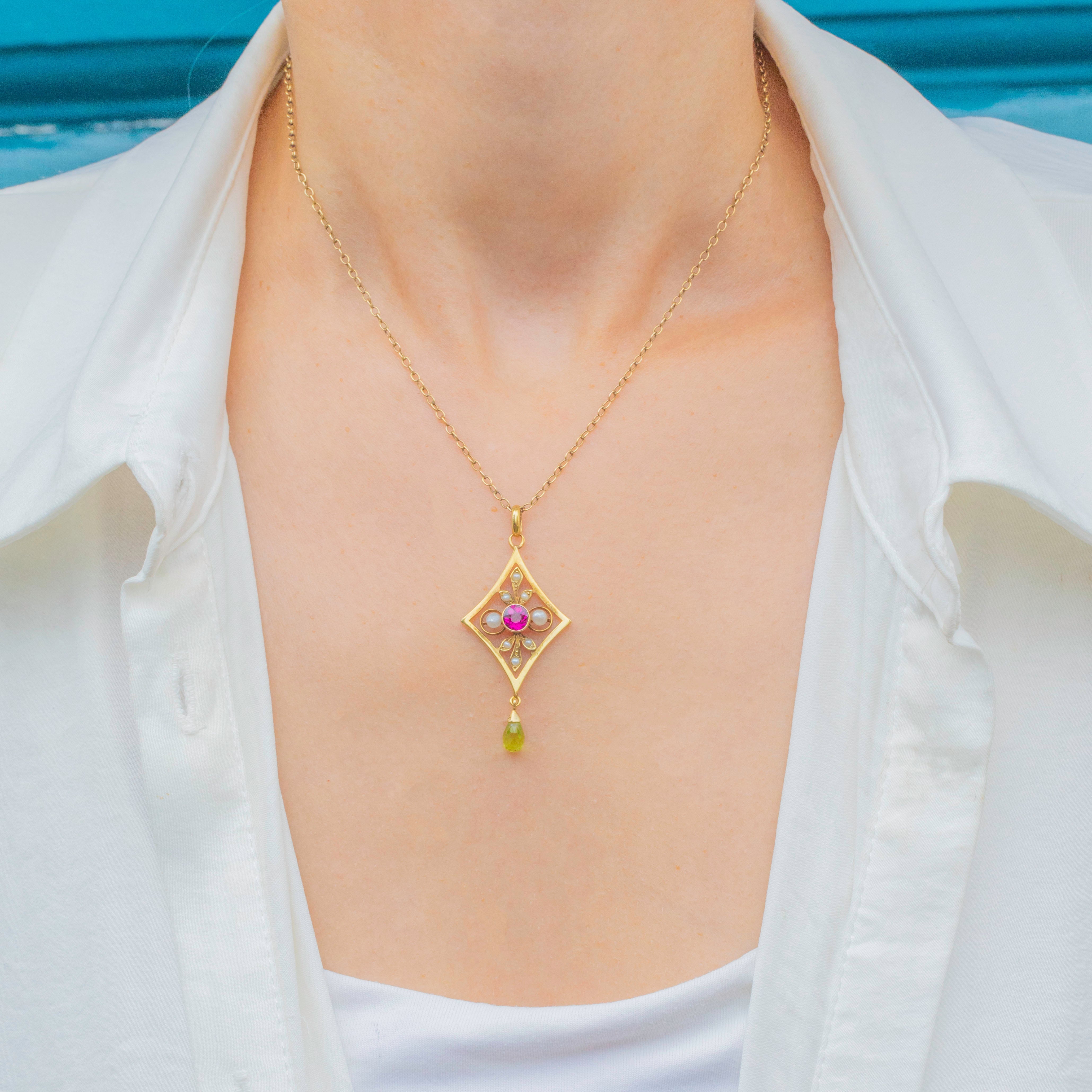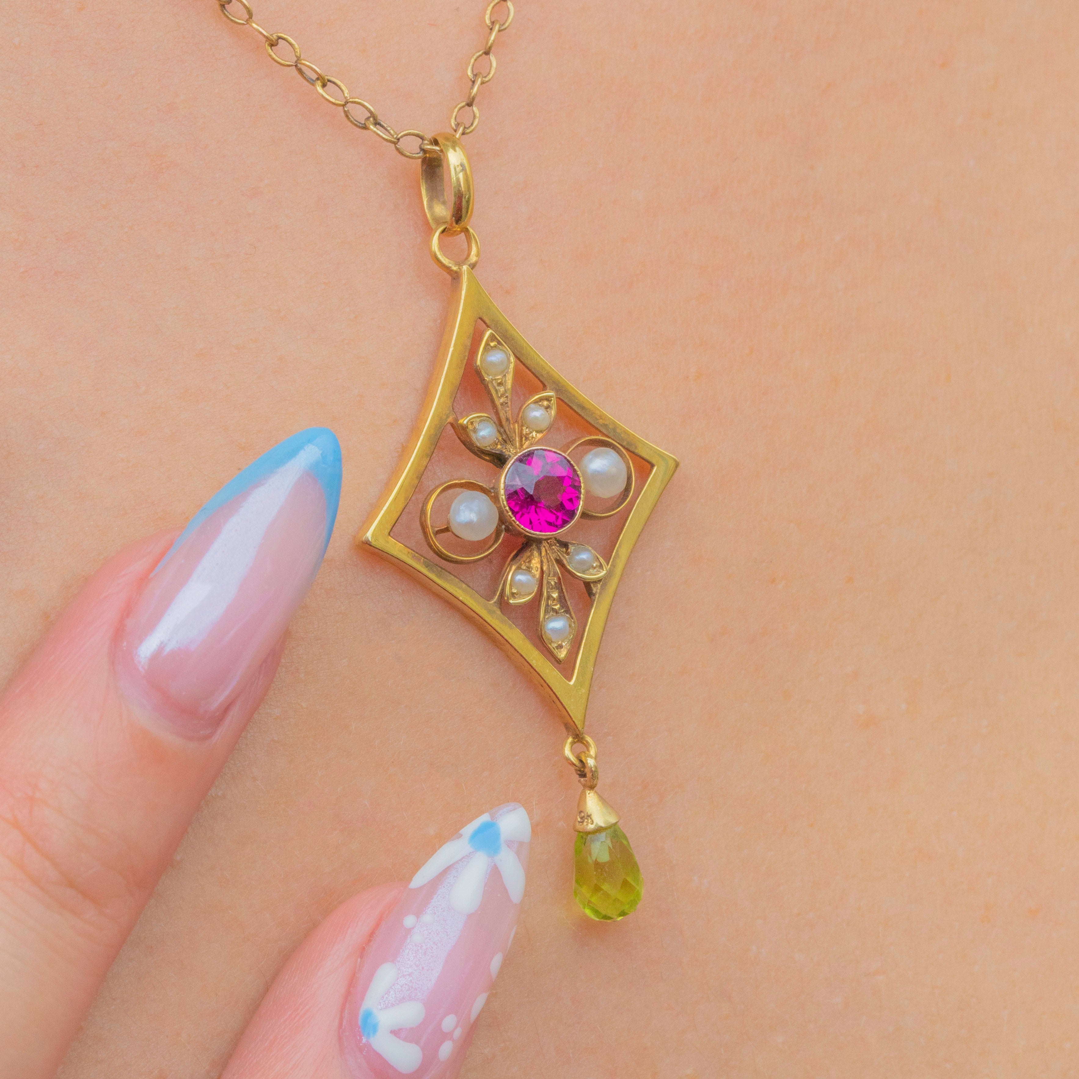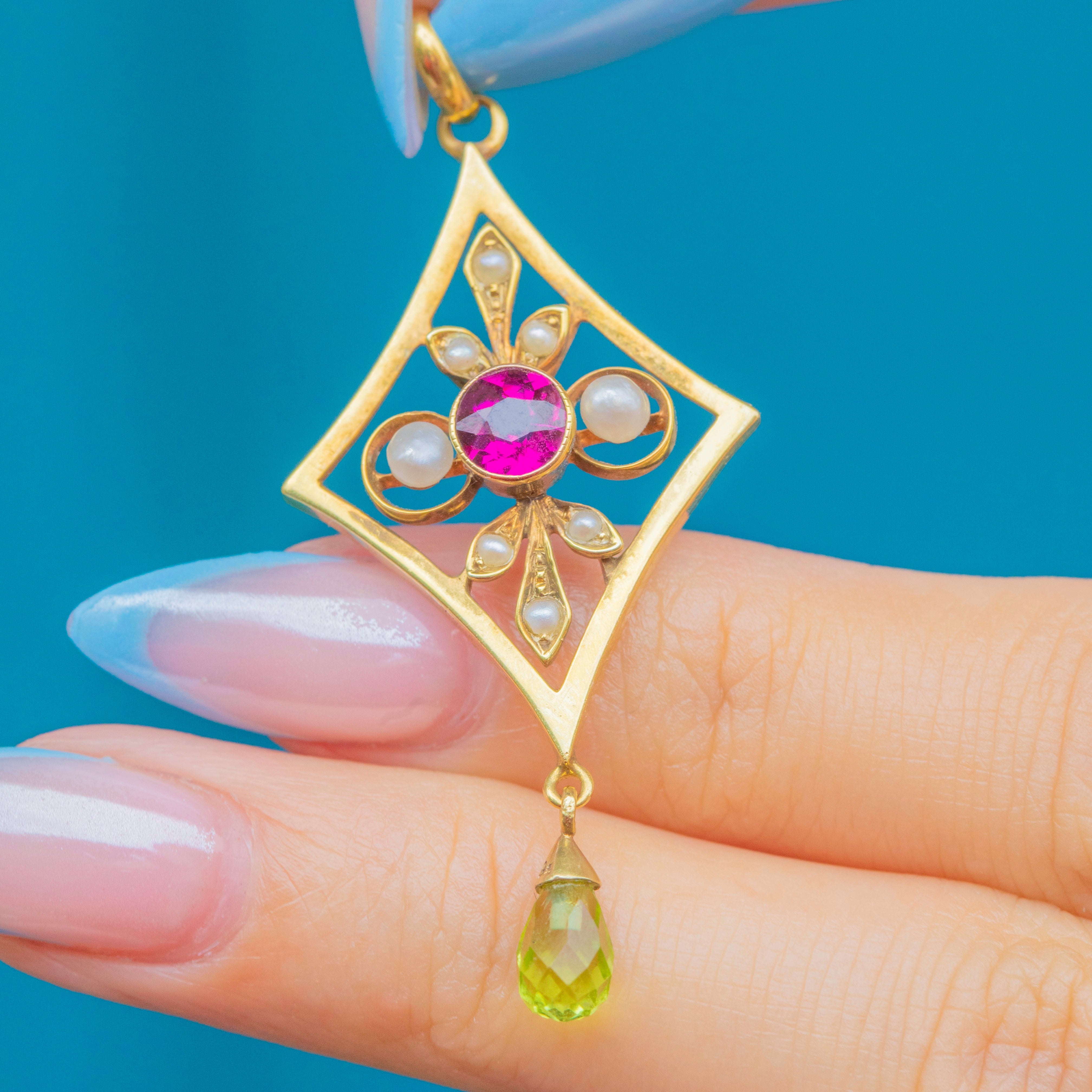 A striking example of Suffragette jewellery, this Edwardian pendant will make an elegant addition to your collection. The bold diamond-shaped pendant is crafted from saturated 14ct Gold, inlaid with a magenta Amethyst surrounded by crisp white Pearls and suspending a briolette Peridot at its base.