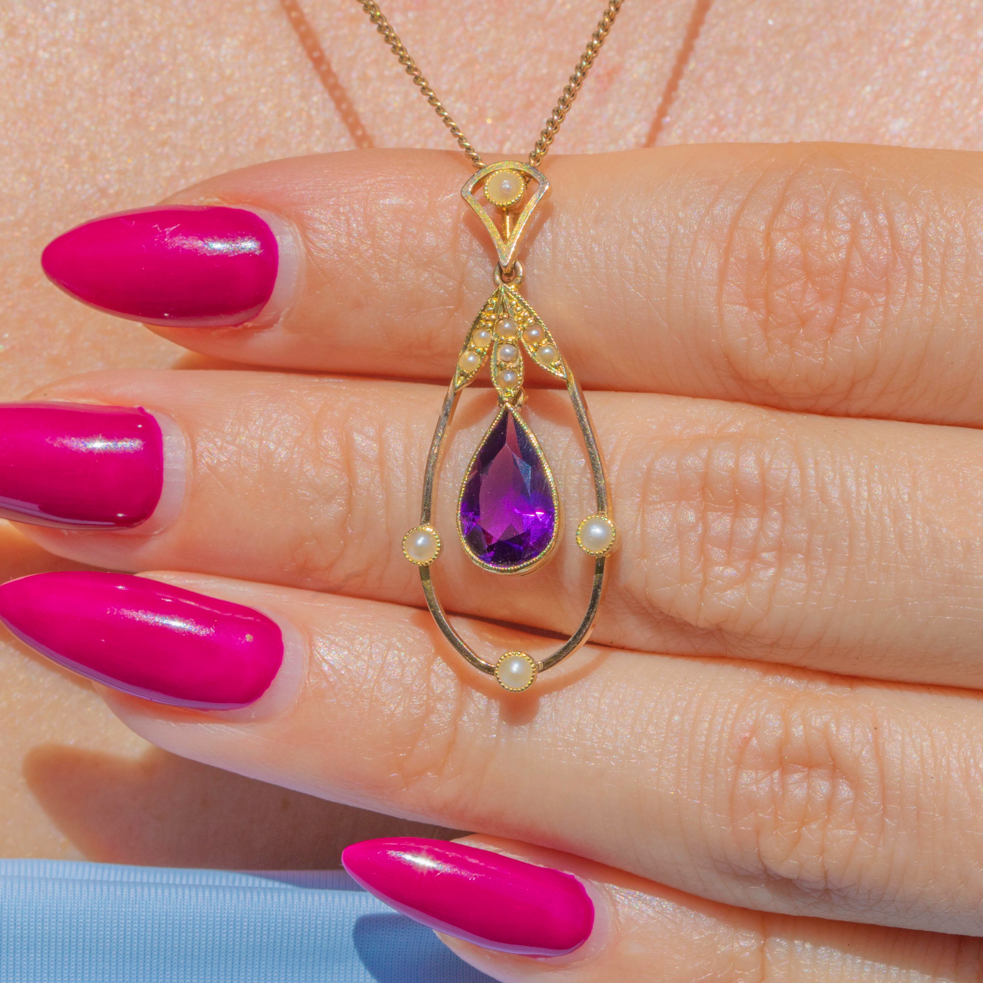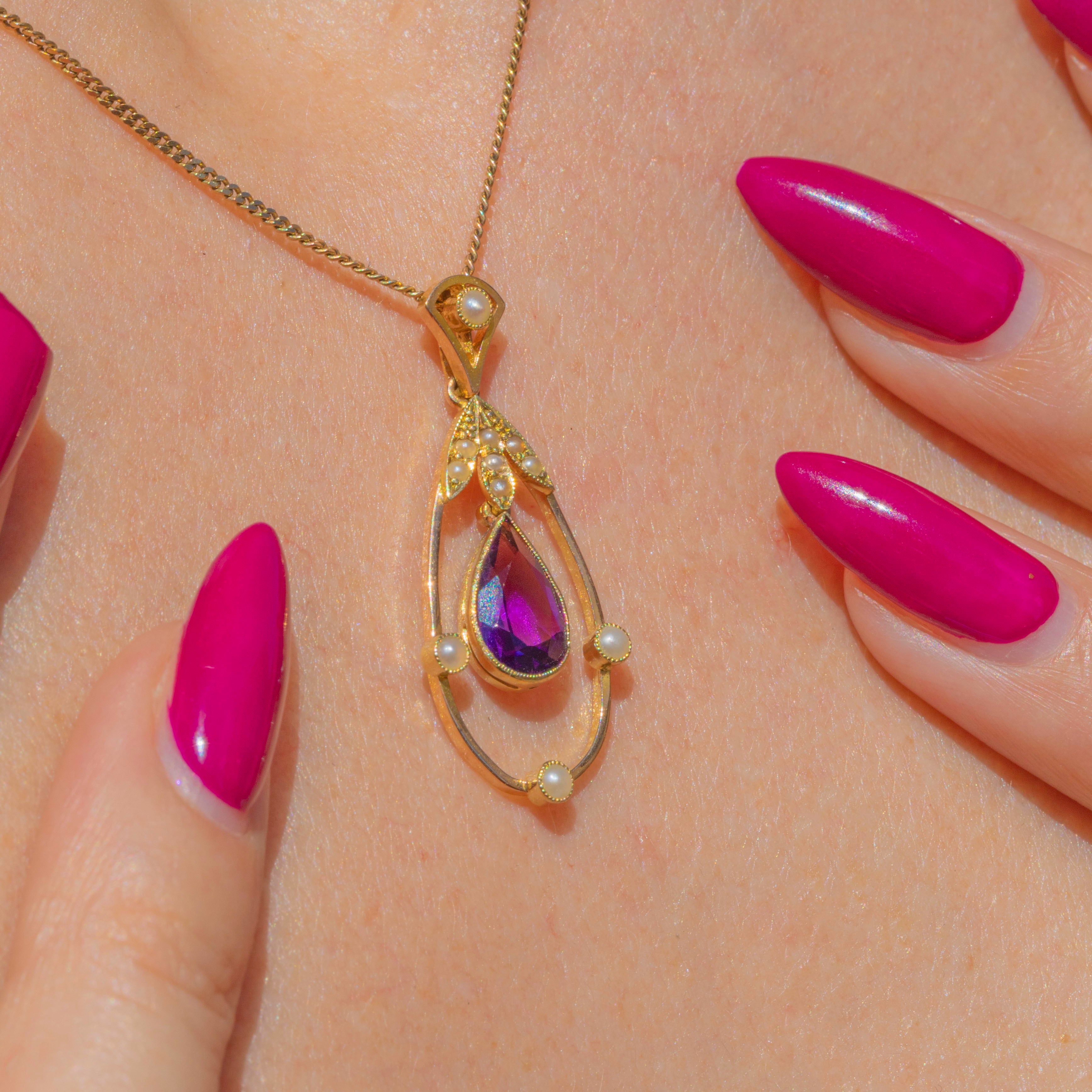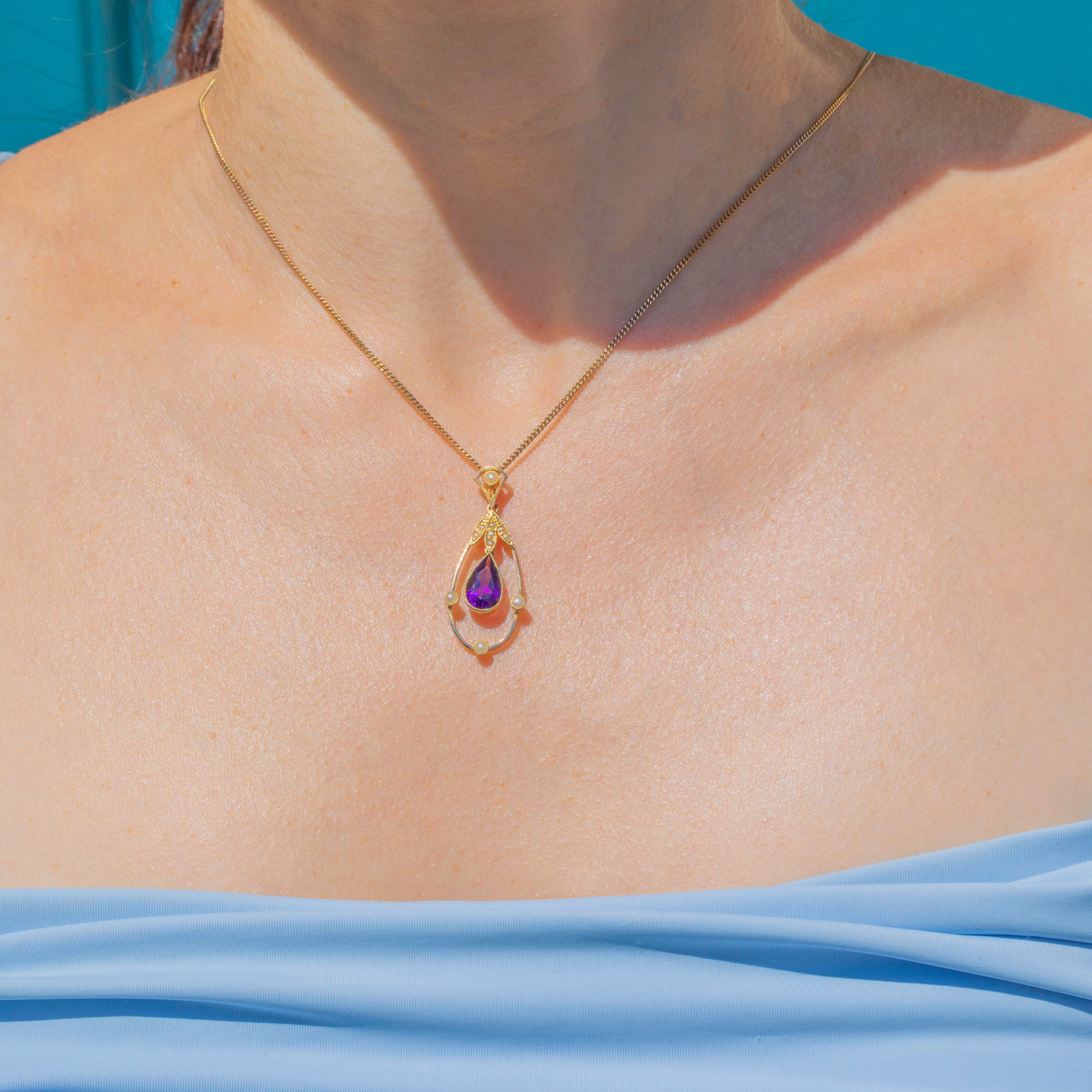 Crafted from bright and buttery 15ct Gold, this antique pendant suspends an elegant pear-shaped 0.70ct Siberian Amethyst, with saturated royal purple hues radiating from its crisp facets.