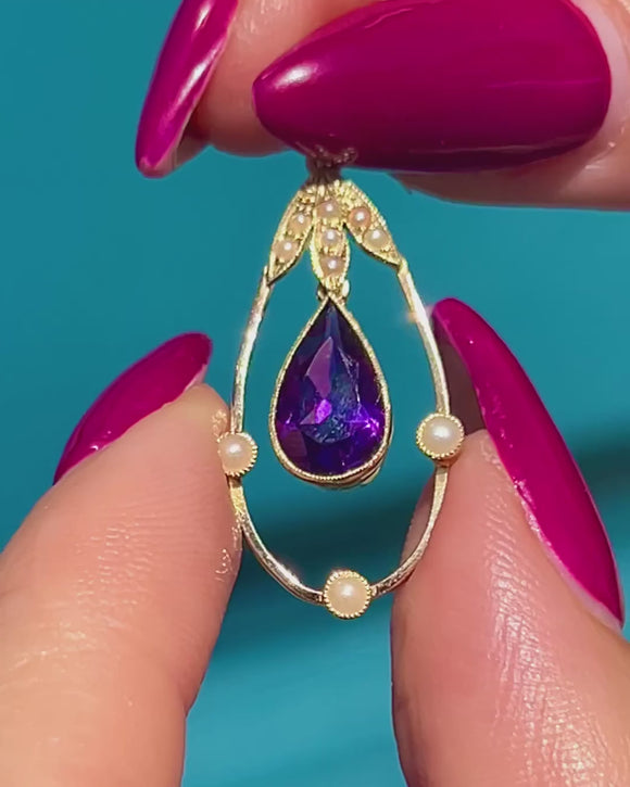 Edwardian 15ct Gold Amethyst Pearl Pendant