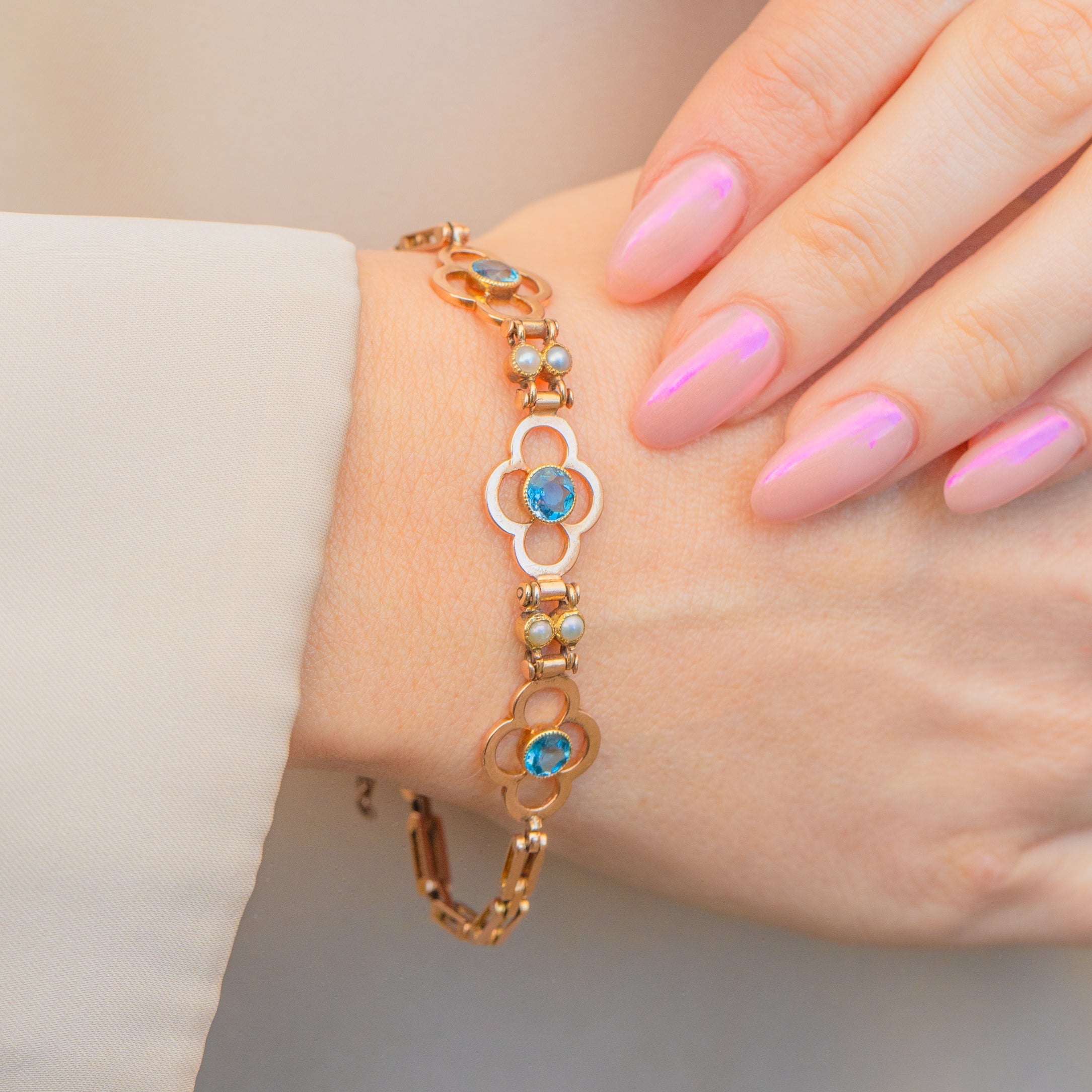 EXCELLENT. This Edwardian 15ct Gold Aquamarine and Pearl bracelet is in excellent condition. Each link is uniform and secure, and her gemstones sit securely within their settings. With little wear to note, she will make a wonderful addition to your collection!