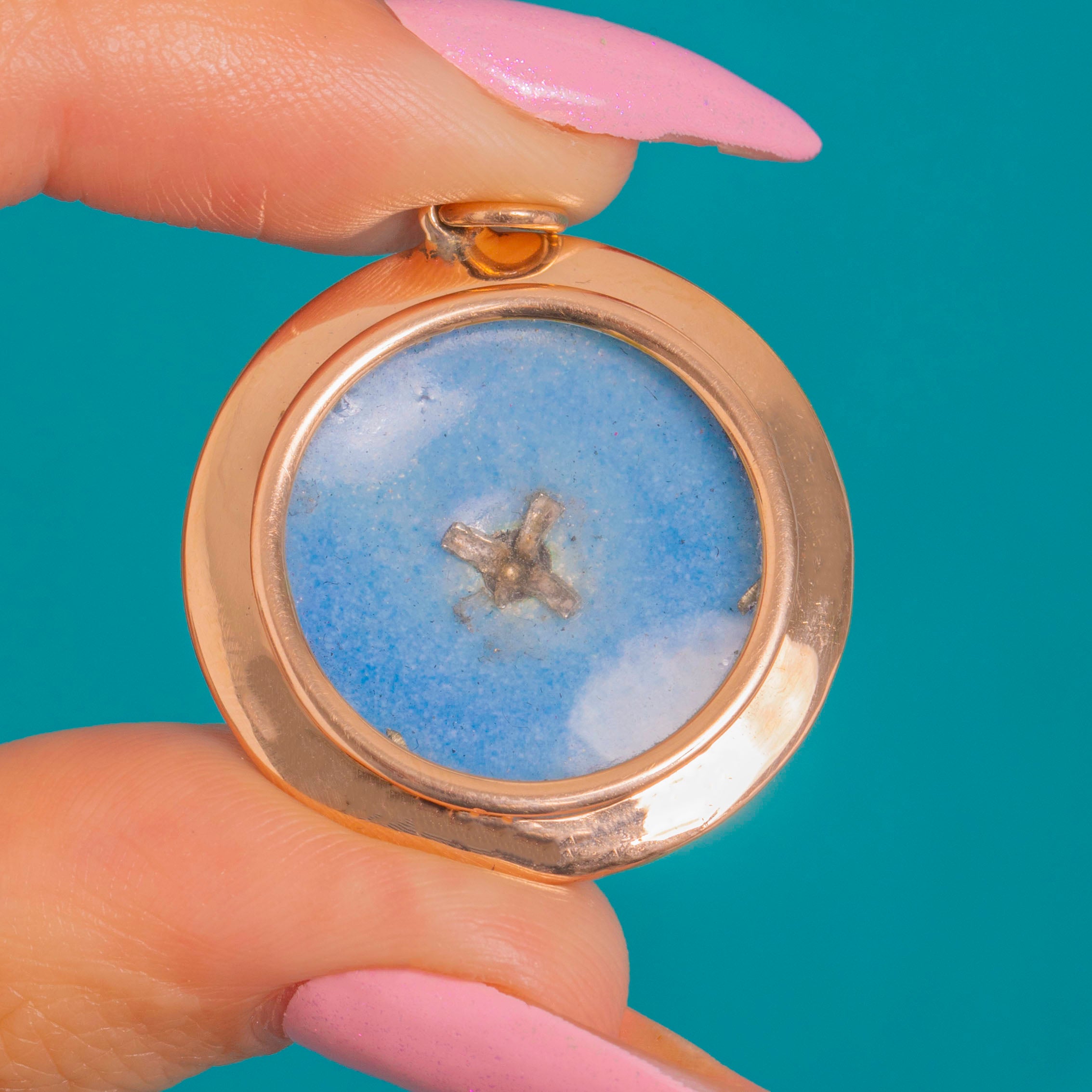 Crafted in rich 15ct Gold and framed by a contrasting 9ct Gold rim, the round, gently domed locket is elegant in its restraint, with a neat jump ring for effortless wear. A beautiful example of early 20th-century design, it offers a refined pop of colour and timeless sophistication.