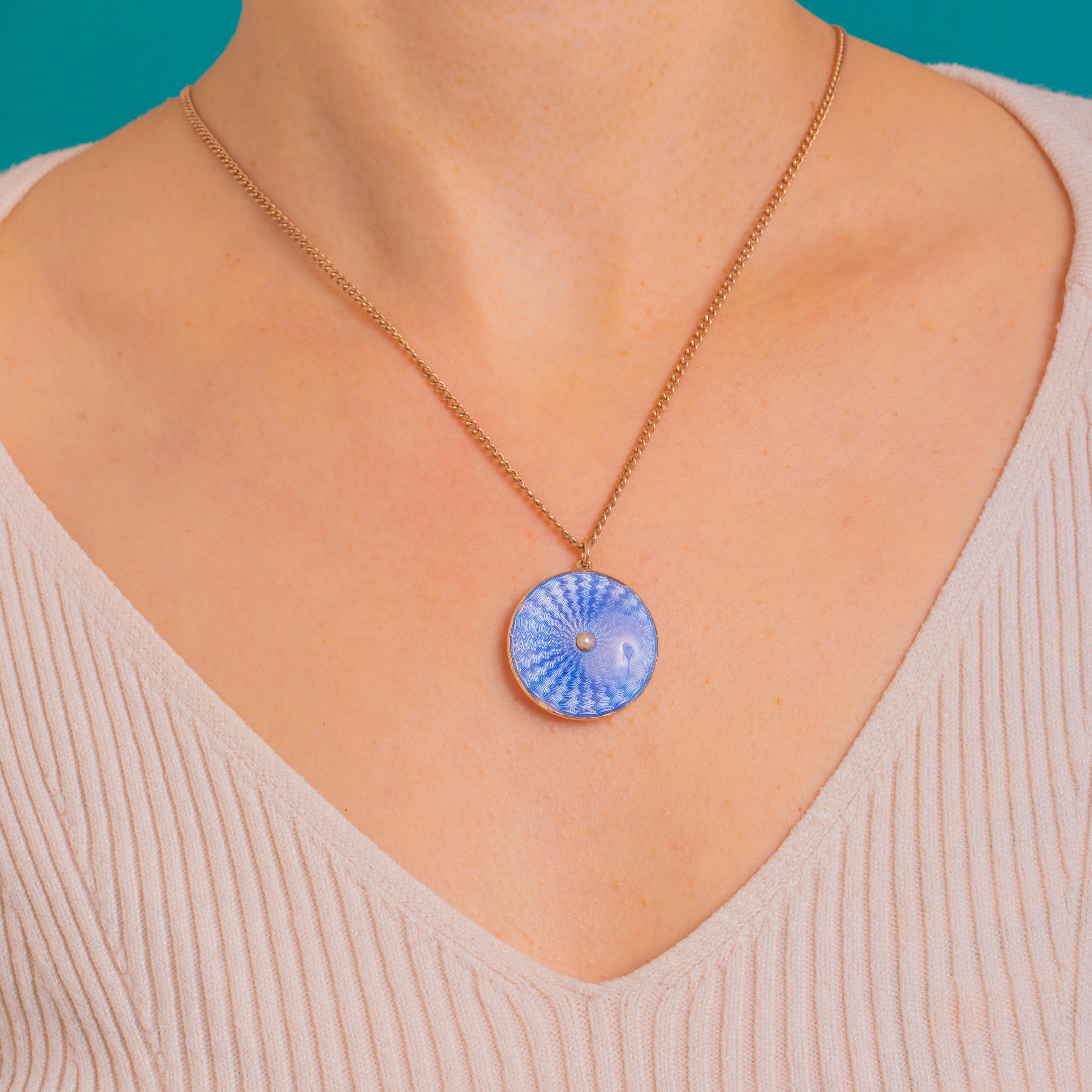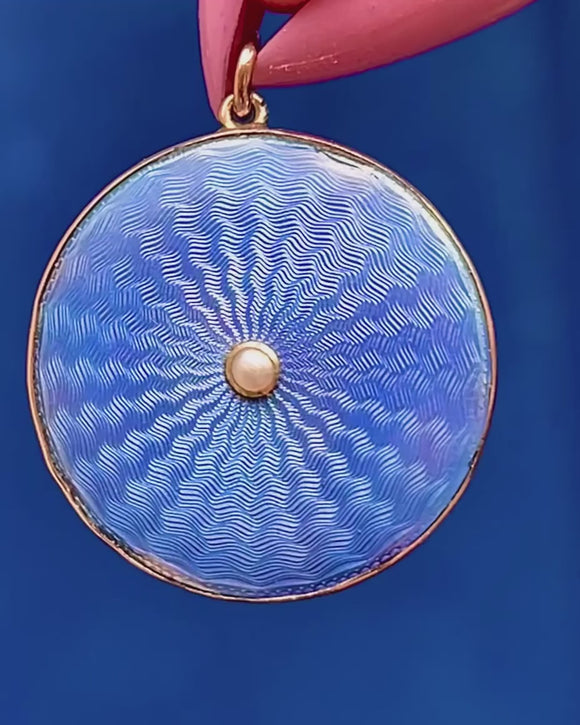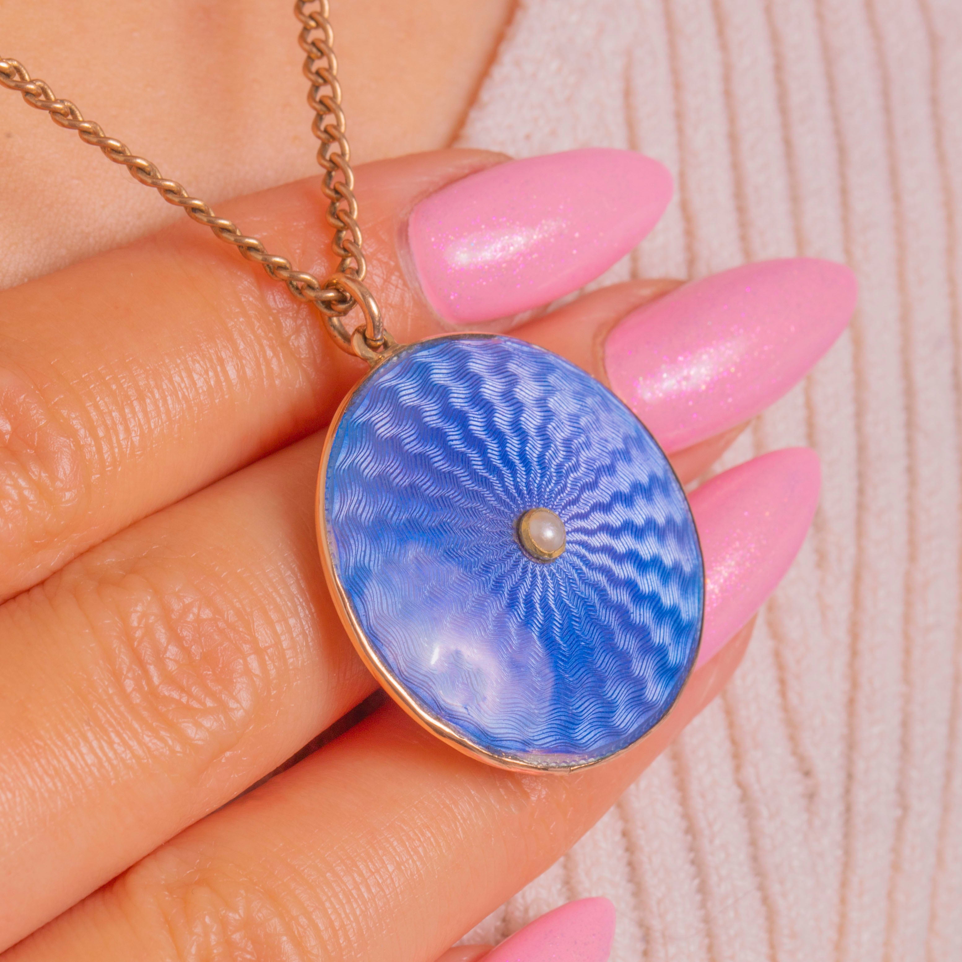 A radiant sweep of blue guilloché Enamel shimmers across this Edwardian locket, its rippling engine-turned pattern glowing beneath a glassy, translucent finish. At the heart sits a petite Seed Pearl in a raised bezel, a single creamy accent that draws the eye to the centre of the starburst.