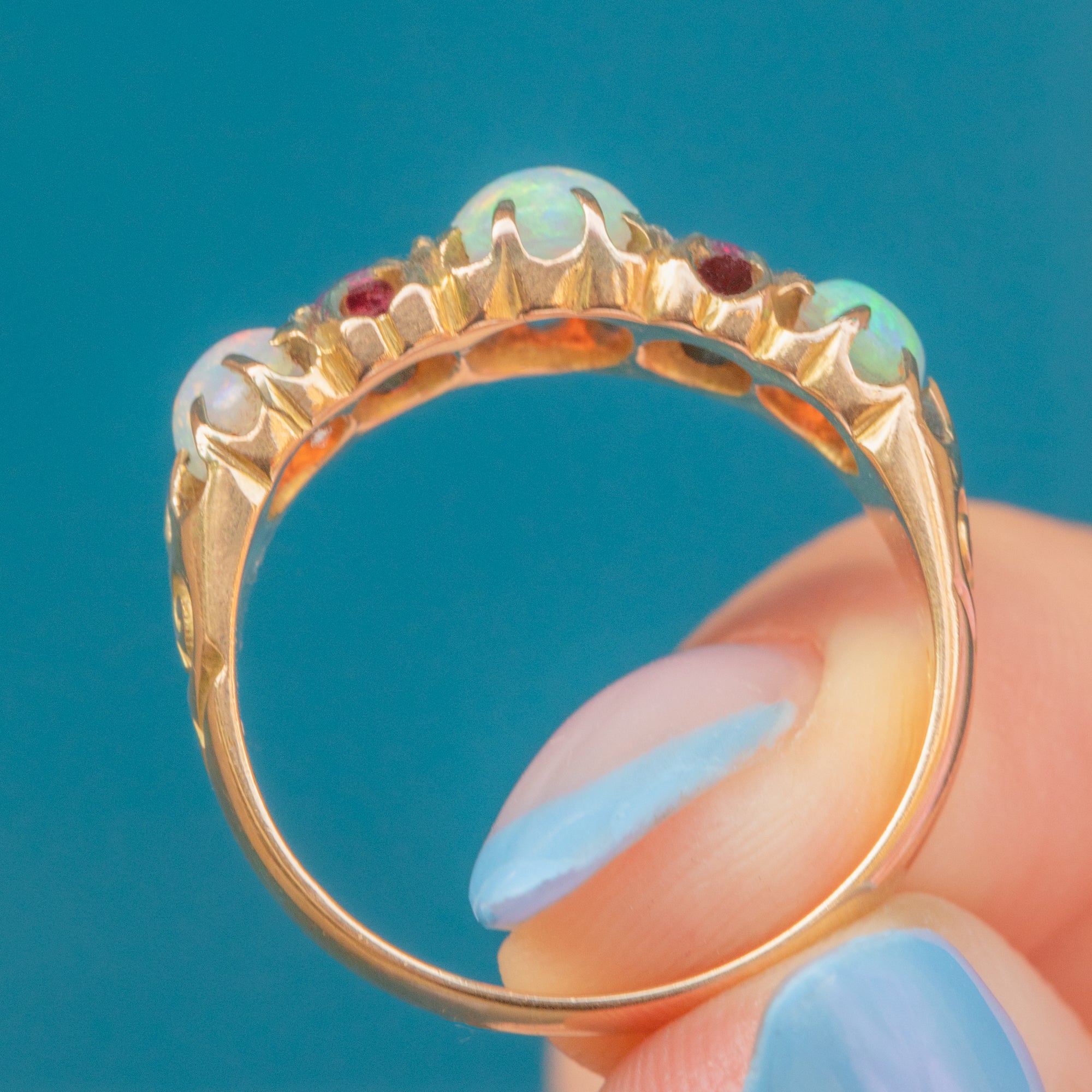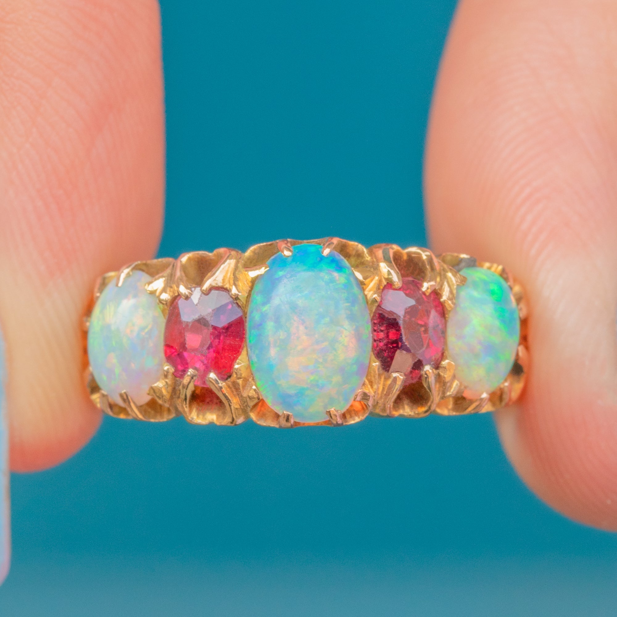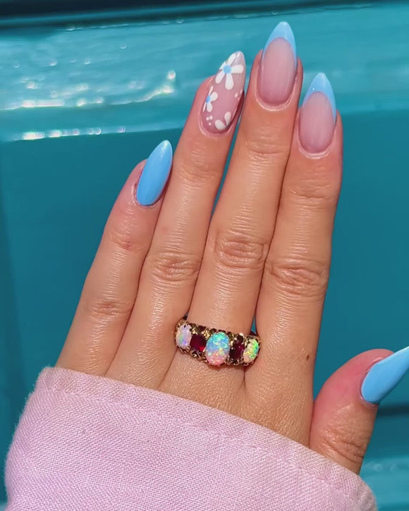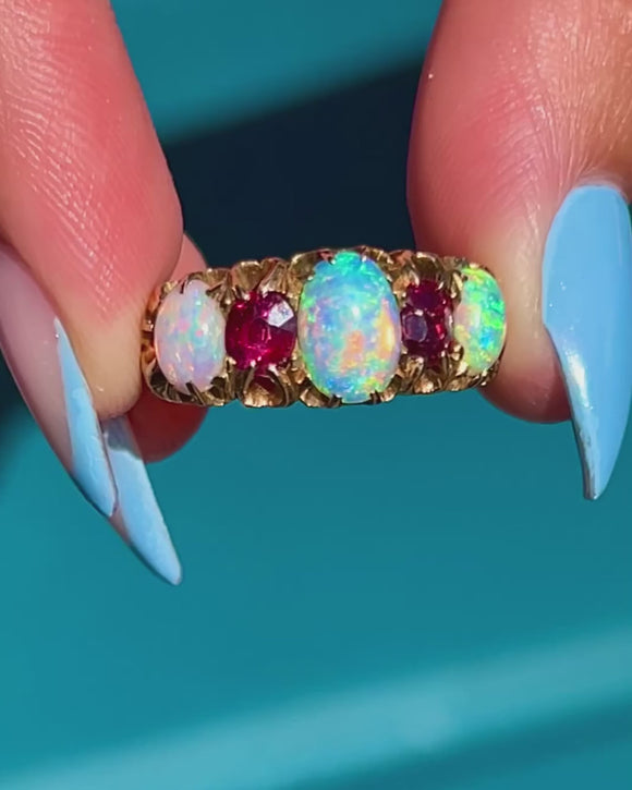 A resplendent antique ring, adorned by iridescent Opals and a vibrant Garnet, and Ruby to create a classic five stone ring. Each Opal projects a magical kaleidoscope of blues and greens, contrasted beautifully by the saturated fuchsia tones of the Ruby (right, hallmark facing) and Garnet (left, hallmark facing), all set in glossy 15ct Gold.